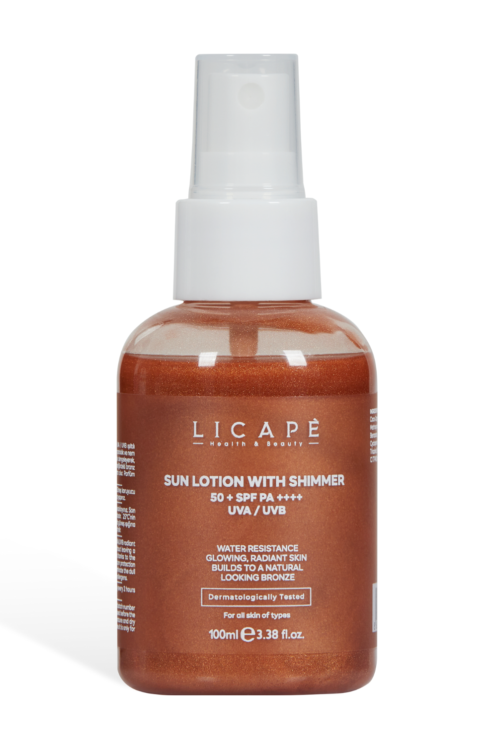50 + spf pa ++++ uva / uvb ışıltılı vucüt güneş koruyusu, cildinizde yağlılık hissi bırakmadan parlaklık ve nem sağlar.