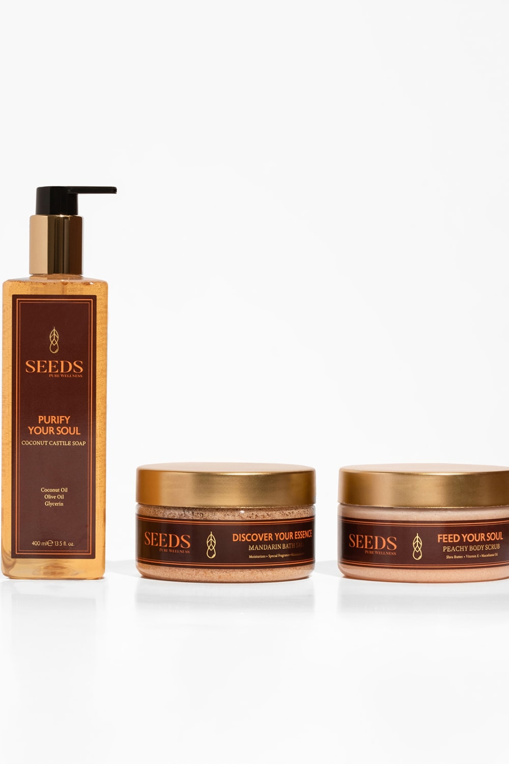Banyo esnasında tüm ihtiyaçlarınızı karşılayacak ürünleri sizler için birleştirdik; Sıvı kastil sabun, sabunlaştırılmış zeytinyağı ve hindistan cevizi yağı ile üretilmiştir. Hassas ciltlere uygun doğal formülüyle, cildinizi temizlerken cildin nem dengesini korumasına yardımcı olur, ciltte ipeksi bir dokunuş sağlar. Himalaya tuzu ve mandalina kabuğunun mükemmel kombinasyonu ile formülize edilmiş doğal banyo tuzu cildi ölü derilerden arındırarak cildin yumuşamasına, nemlenmesine ve parlak görünmesine yardımcı olur. Özel Bodrum mandalinasının verdiği eşsiz koku banyo rutininize keyif katar. Himalaya Tuzu: Bol mineralli içeriği sayesinde cildinizin canlanmasını ve ölü deriden arınmasını destekler. Mandalina: Doğal mandalina kabukları, bulunduğunuz ortama verdiği hoş ve güzel kokusuyla rahatlamanıza yardımcı olur. Seeds vücut peelingi, yağ bazlı yapısı ve içeriğindeki doğal şeker tanecikleri ile cildinizi ölü hücrelerden arındırmak ve cildin beslenmesine yardımcı olmak için geliştirilmiştir. Cildin beslenmesine yardımcı olarak ipeksi bir his bırakır. Doğal şeftali aroması cilt bakım rutininize keyif katar. Shea Butter: İçeriğinde bulunan F, E, A vitaminleri ile cildin beslemesine yardımcı olur. Vitamin E: Cildin koruyucu bariyerini güçlendirmeye destek olur. Macadamia Oil: Cildin nem dengesini düzenler.