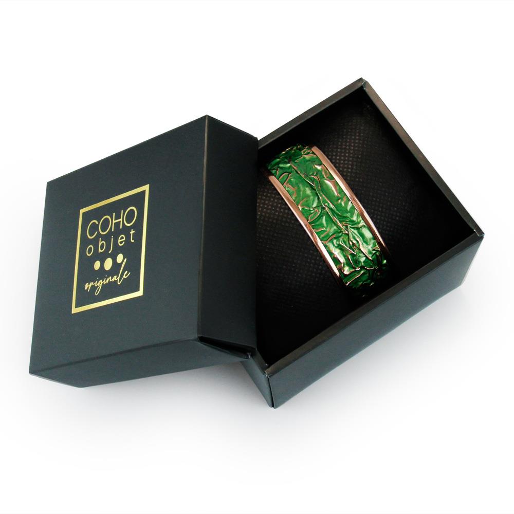 Bileklik, özel COHO objet yaldız logo baskılı kutusunda gönderilir ve sevdiklerinize veya kendinize şık bir hediye alternatifi sunar.