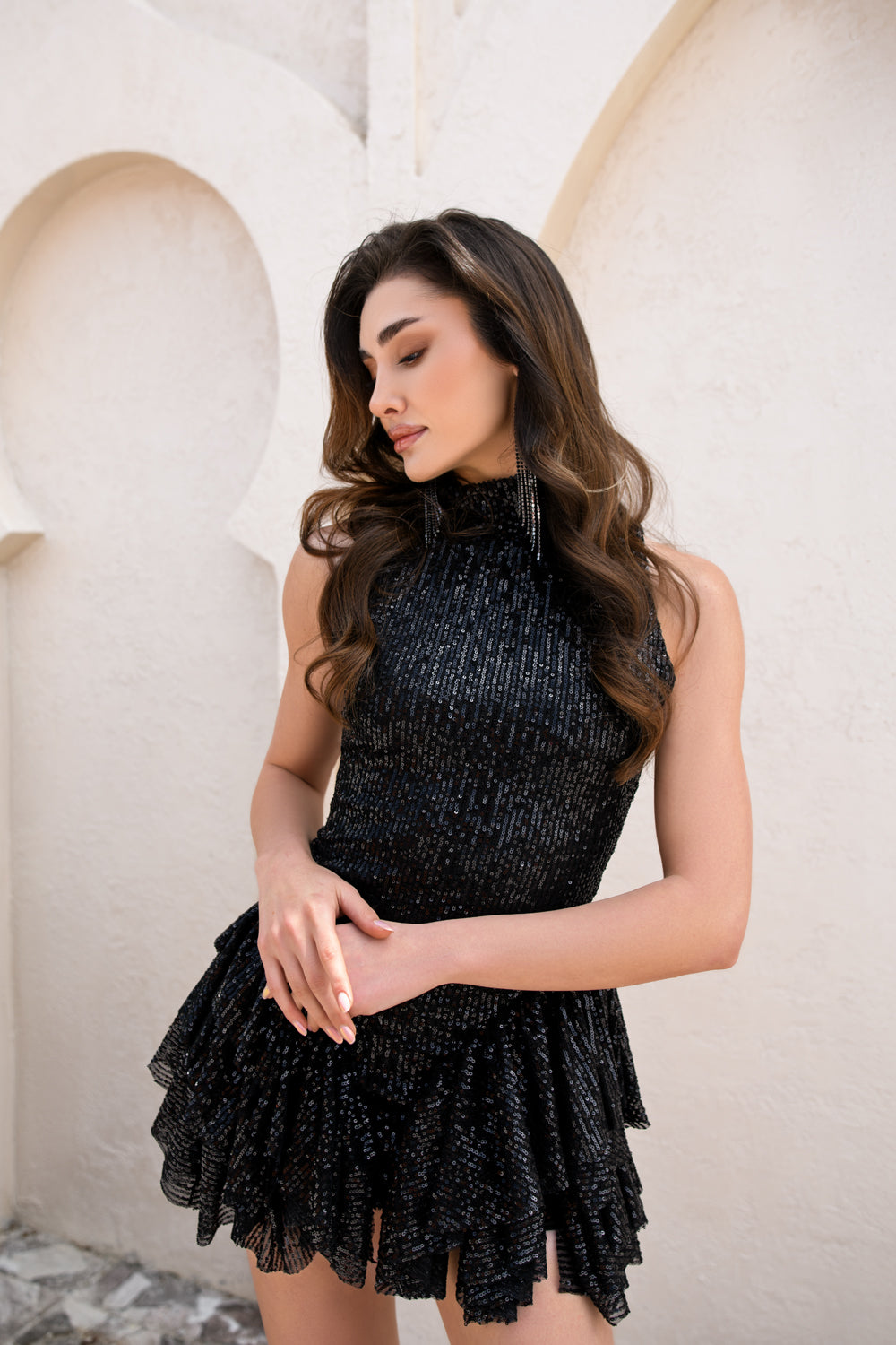 Işıltılı siyah payet dokusu ve boğazlı kolsuz tasarımıyla modern ve çarpıcı bir siluet sunar. Volan detayı hareketli ve feminen bir ifade katarken, astarlı yapısı sayesinde iç göstermez. Özel davetler, gece organizasyonları ve parti görünümleri için dikkat çekici bir seçimdir.