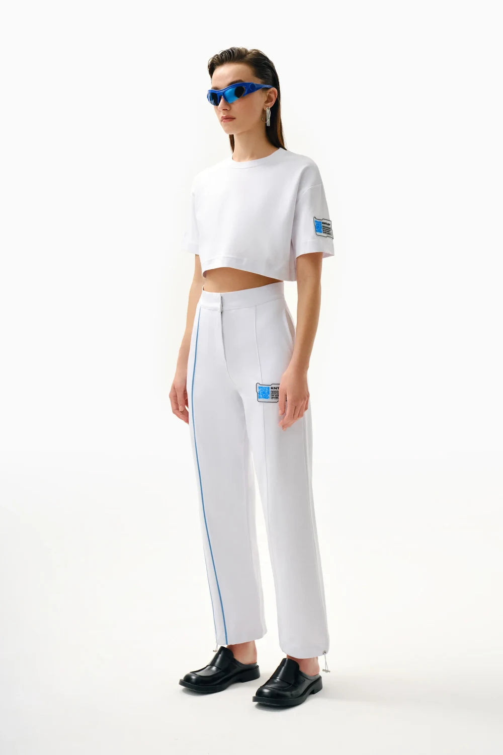 Bisiklet yaka, yarım kol, KNTLGY Rubber Patch detaylı, beyaz crop T-shirt.