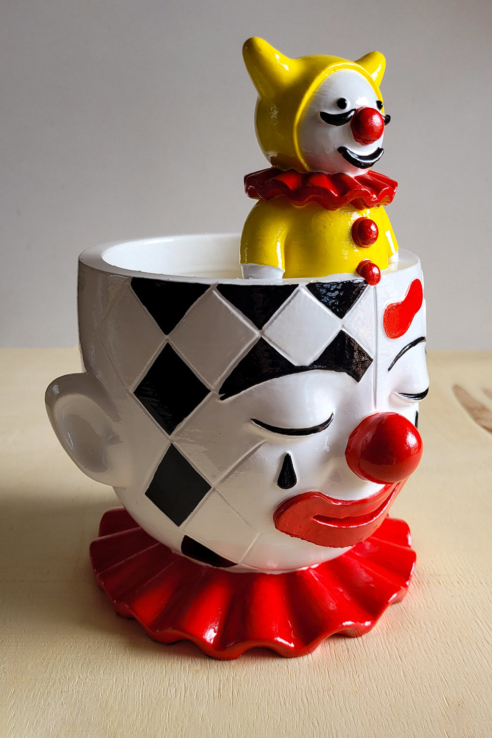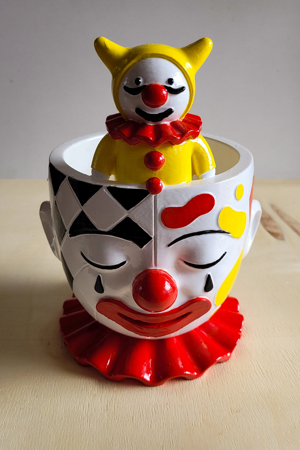 Klasik mimikleri ve başından çıkan ikinci palyaço figürüyle tam anlamıyla sıra dışı. Bitki yerleştirmek için ideal iç hacme sahip ama kalemlik olarak kullanıldığında da yüzünüzde gülümseme yaratacağı kesin.
