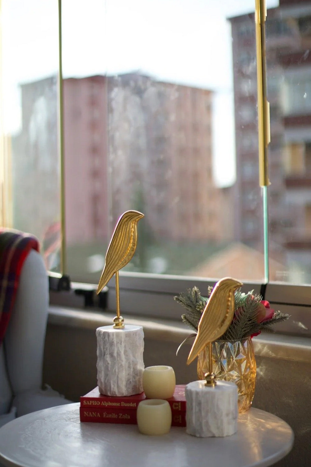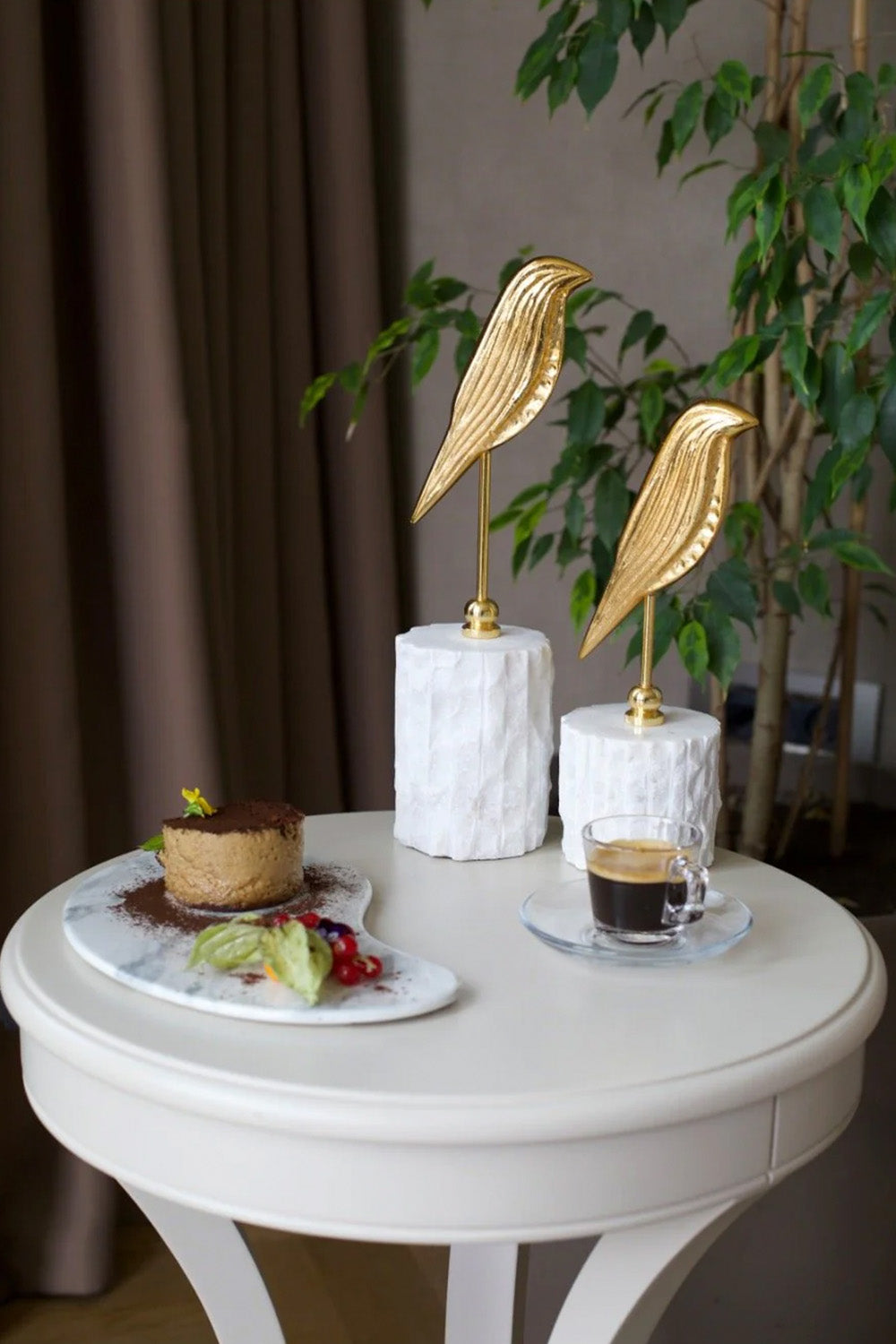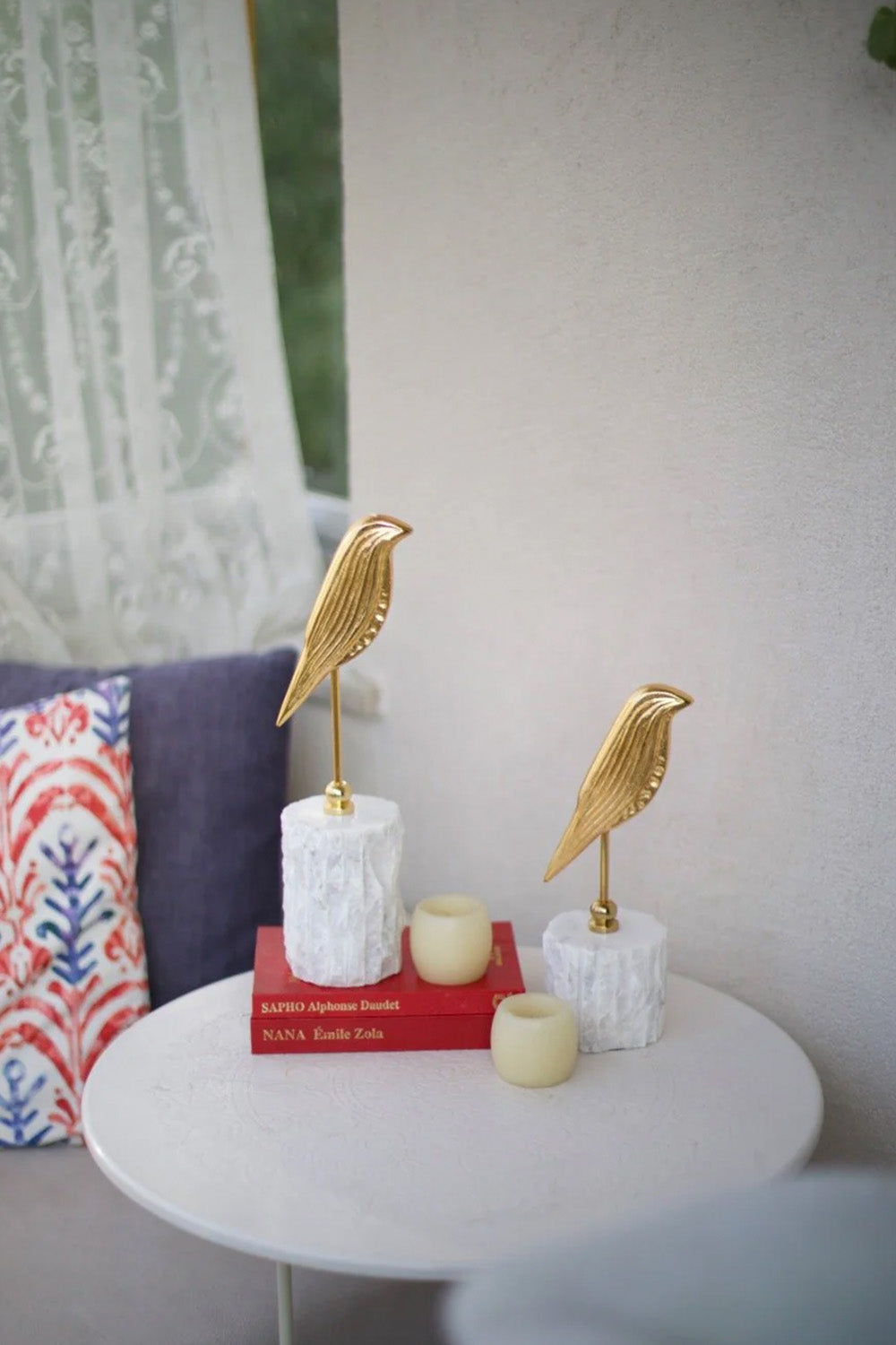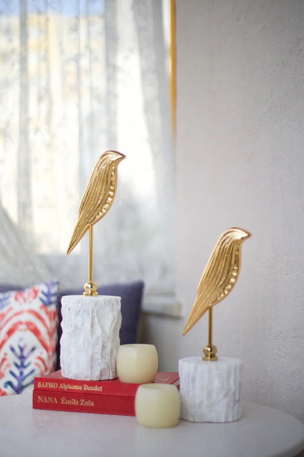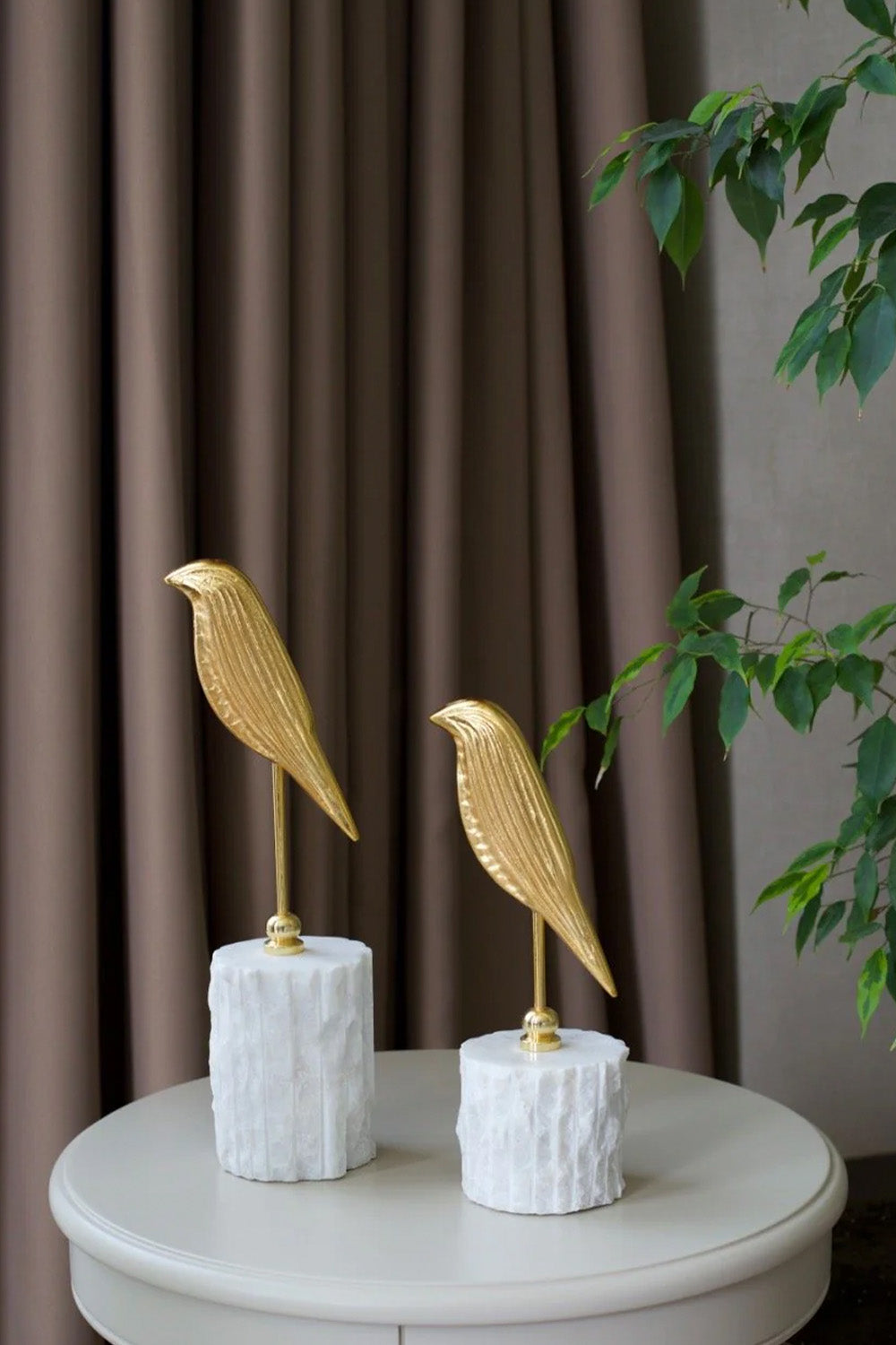 Beyaz mermer kaide üzerine yerleştirilen altın rengi döküm kuş figürleri, estetik anlayışınıza hitap edecek şık bir obje sunuyor.