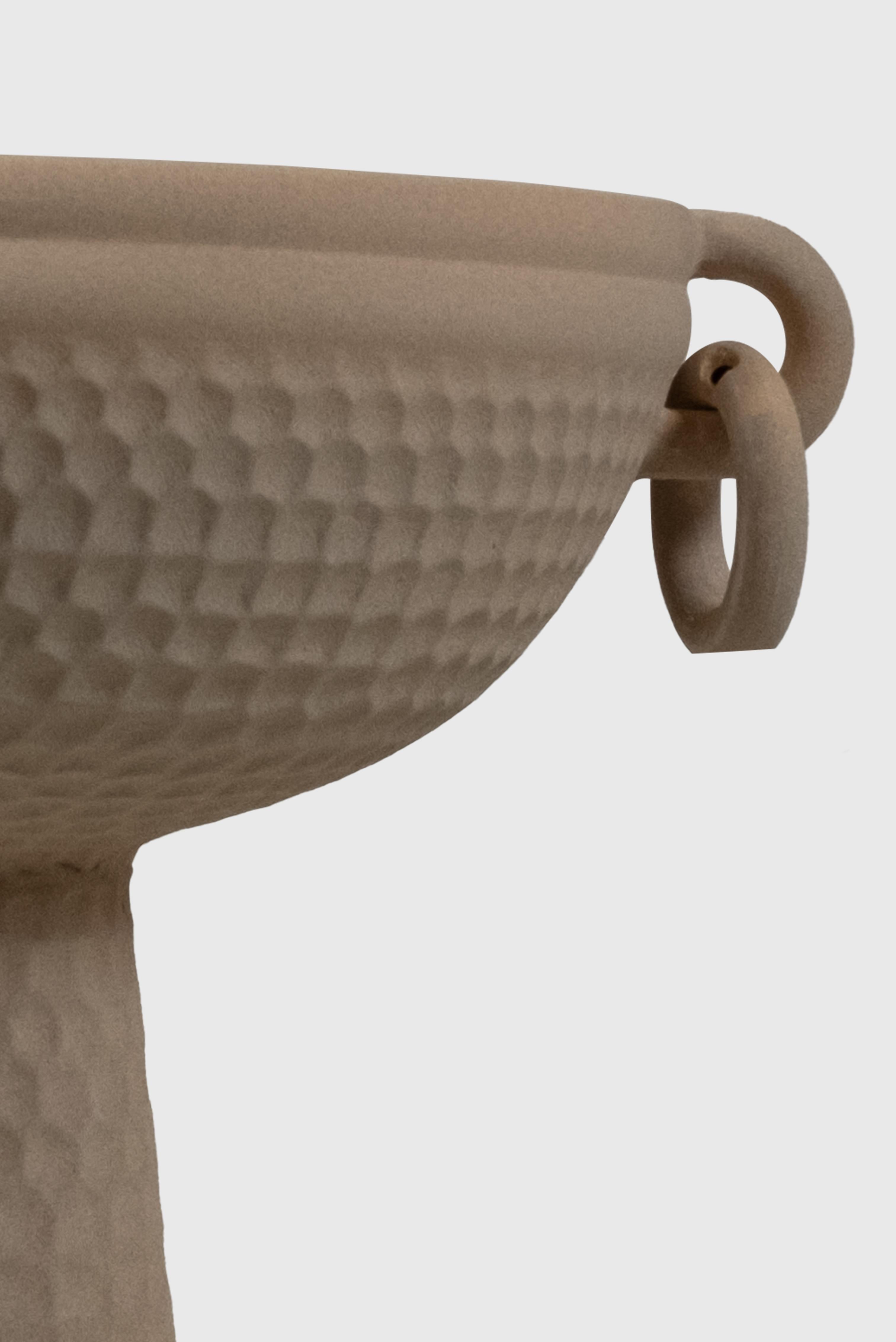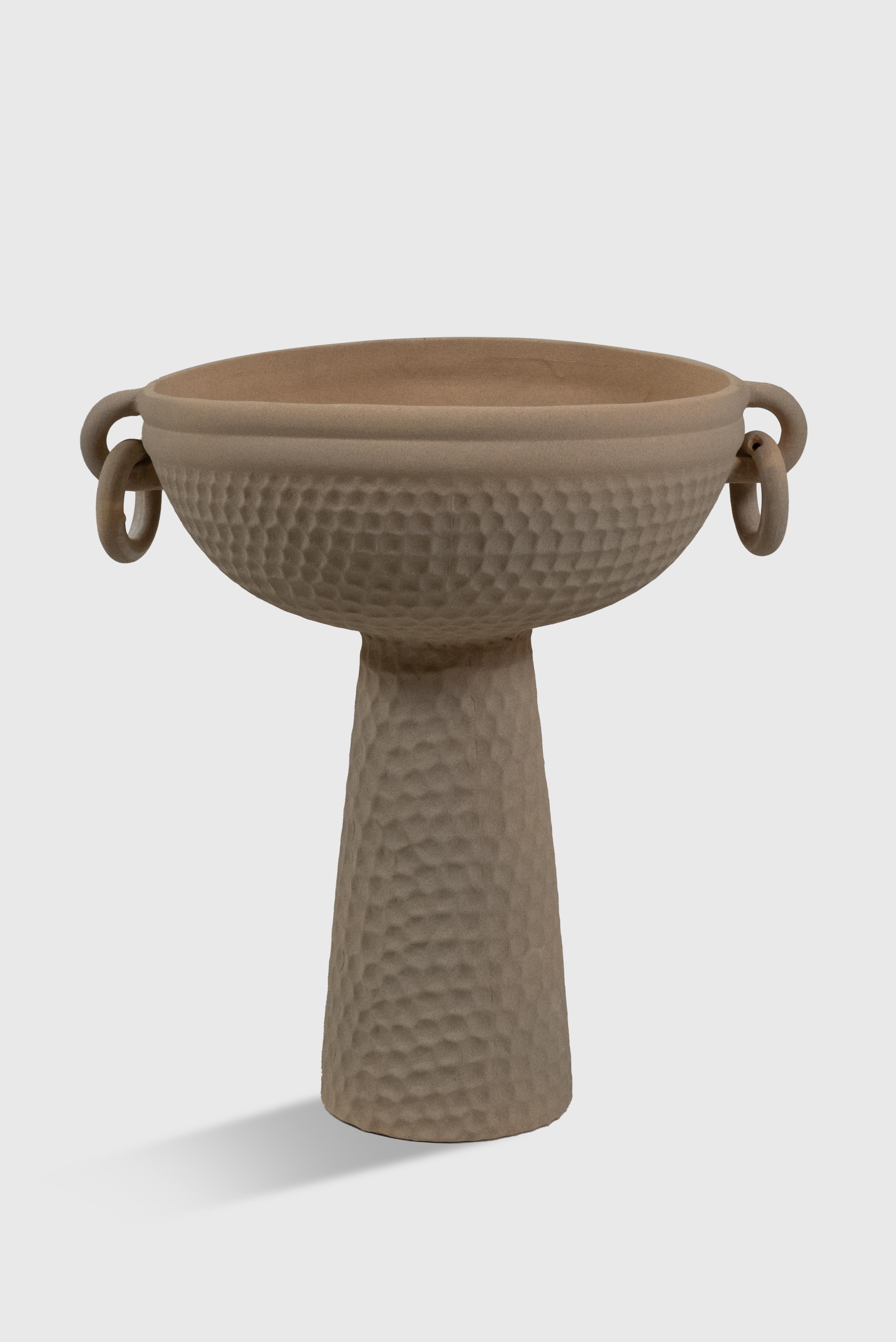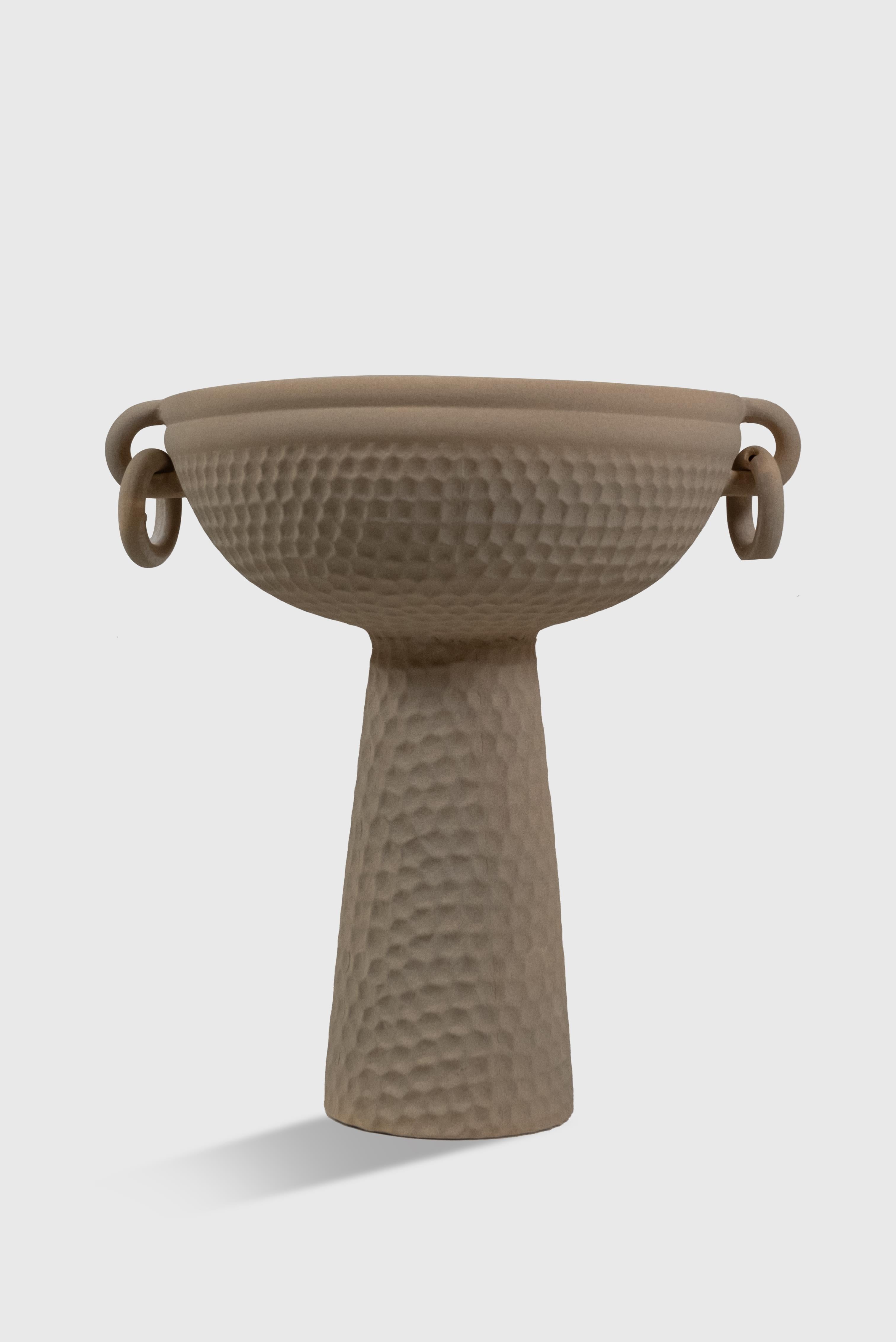 Bu seramik ürün, şık ve modern bir tasarıma sahip, zarif detaylarıyla dikkat çeken bir parça. Yüksek ayaklı yapısı ve üst kısmındaki geniş kase formu, ona bir merkez parçası niteliği kazandırıyor. Üst bölümdeki dokulu yüzey, doğal ve sofistike bir görünüm sağlarken, kenarlardaki halkalarla eklenen detaylar tasarımı daha da zenginleştiriyor. Minimalist renk tonlarıyla her türlü mekâna uyum sağlayabilecek bu dekoratif parça, sade ve zarif bir estetiği temsil ediyor. İç mekân dekorasyonunda farklı stillerle kolayca kombinlenebilecek, hem işlevsel hem de görsel olarak dikkat çeken bir unsur olacaktır.