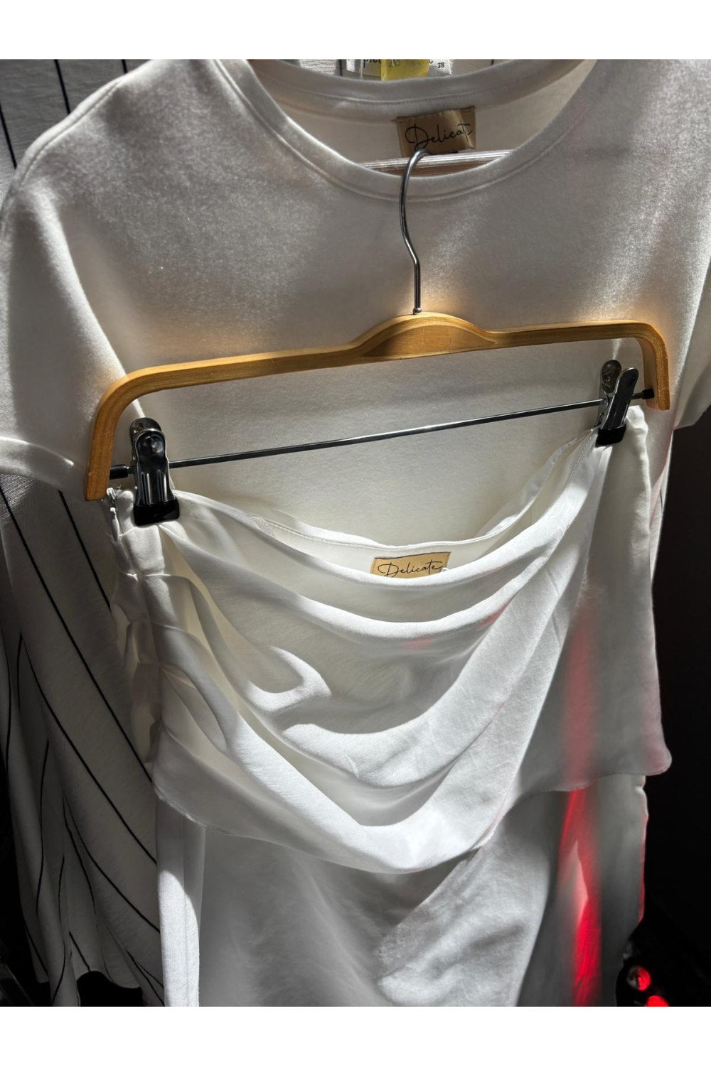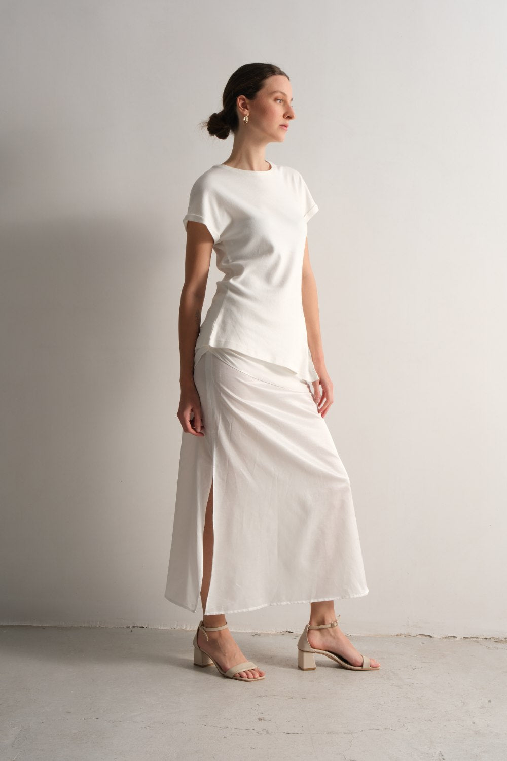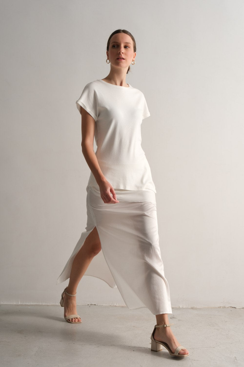 Üst parçası kumaşın tersi kullanılarak mat görünüm elde edilmiştir, eteğin alt kısmı ipek lifinin özelliğinden dolayı hafif parlaktır.