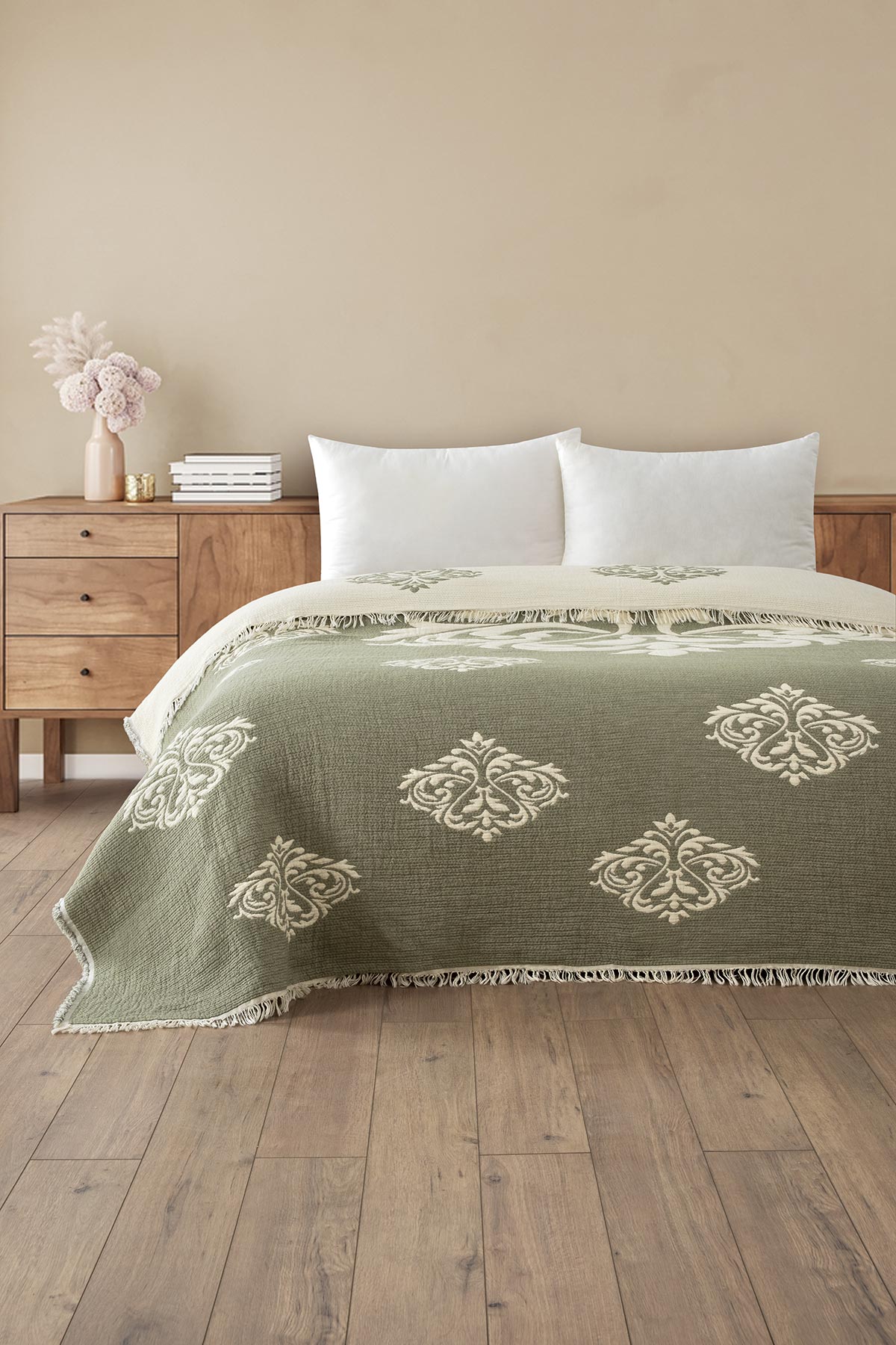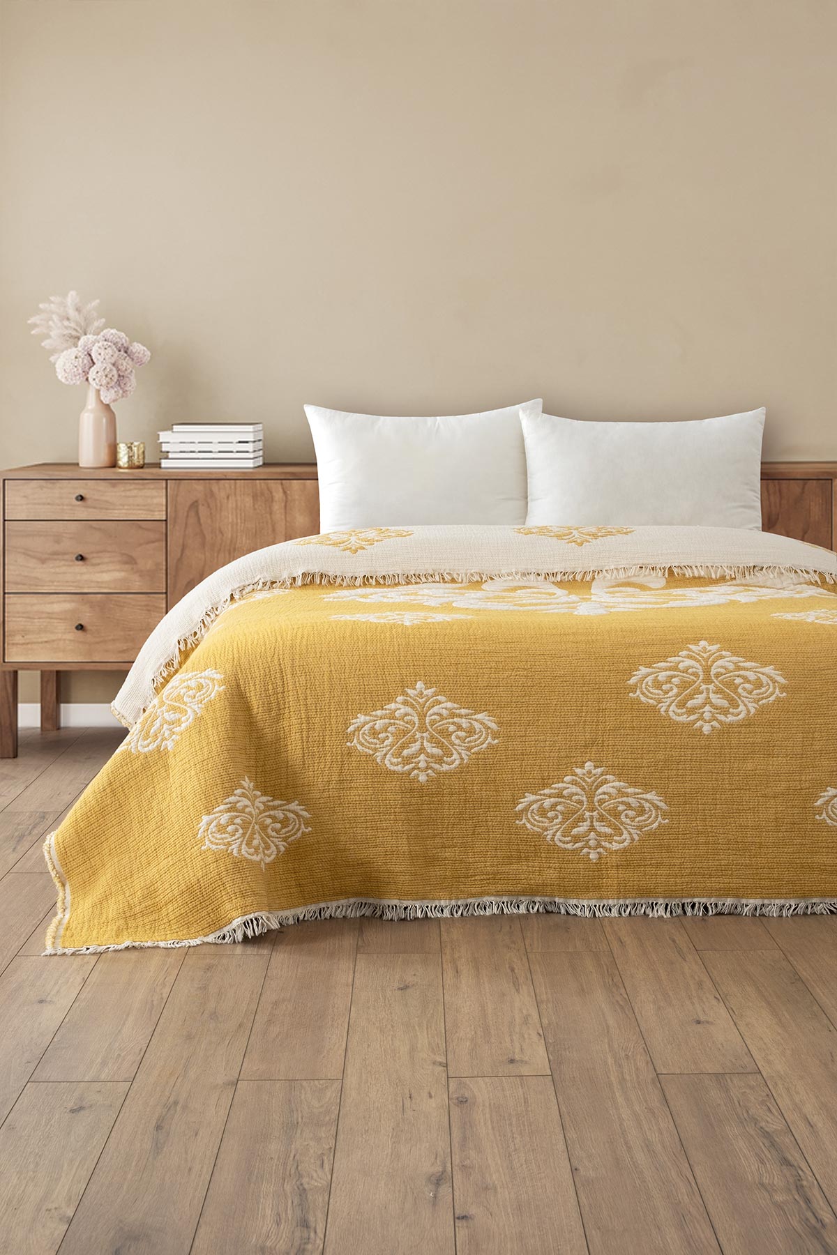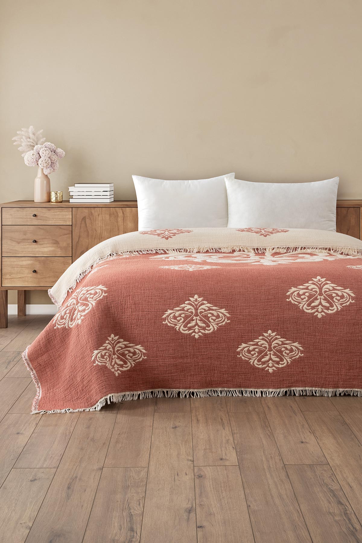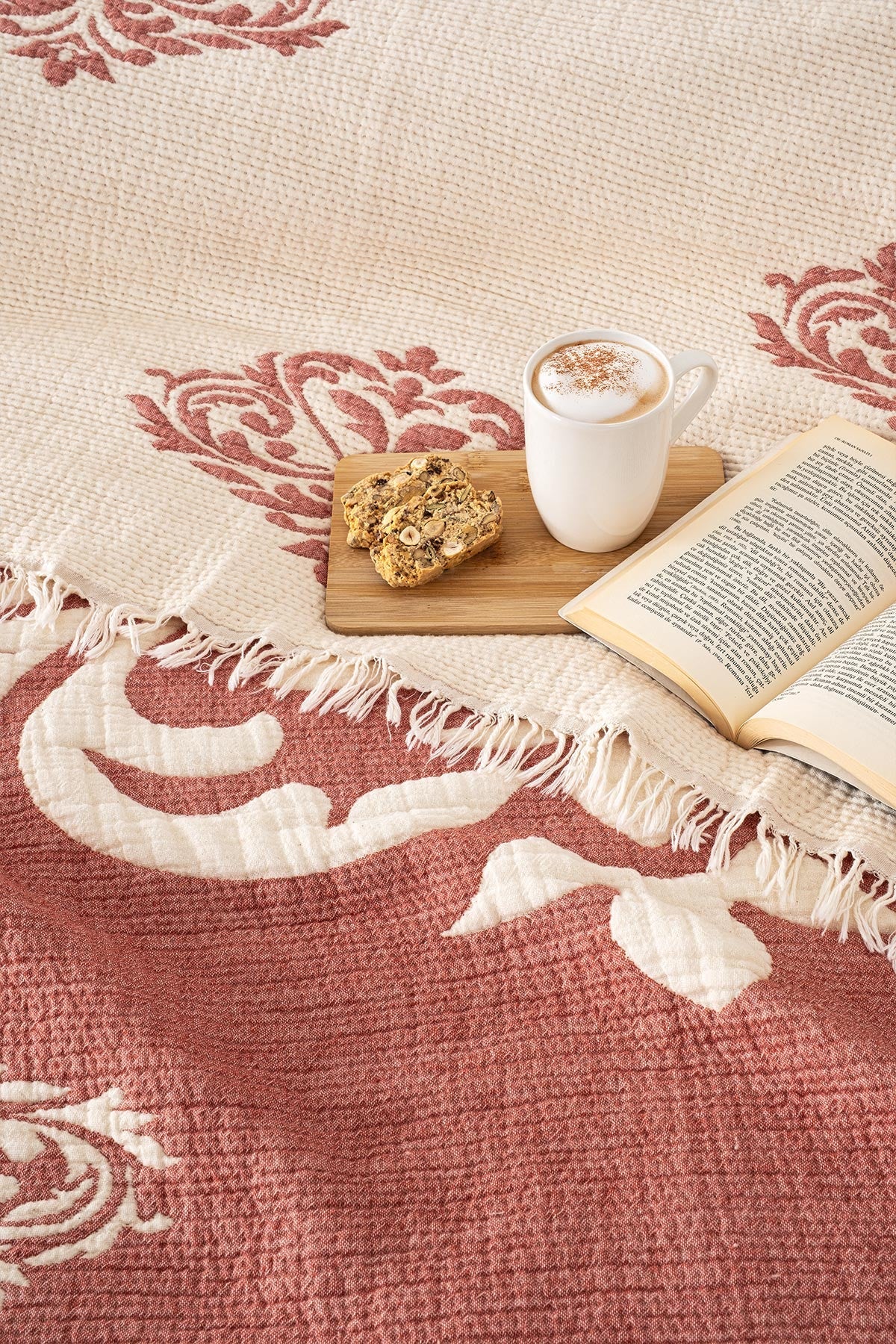 Özenle tasarlanan Barok motifler şıklığı ve konforu bir arada sunar. Alt ve üst dokusu ikişer kat %100 pamuk müslin dokumadır. İç kısmında elyaf (polyester) dolgu bulunmaktadır. 5 katlı dokumaya sahip ürünümüz, kabarık dolgusu ile konforlu bir uyku sunar. Nefes alabilen yapısı ile terlemeyi önler, dört mevsim kullanım imkanı sunar. Yatak örtüsü, battaniye ve yorgan olarak kullanabilirsiniz. Çift taraflı dokusu ile uzun ömürlü bir kullanım sağlar.