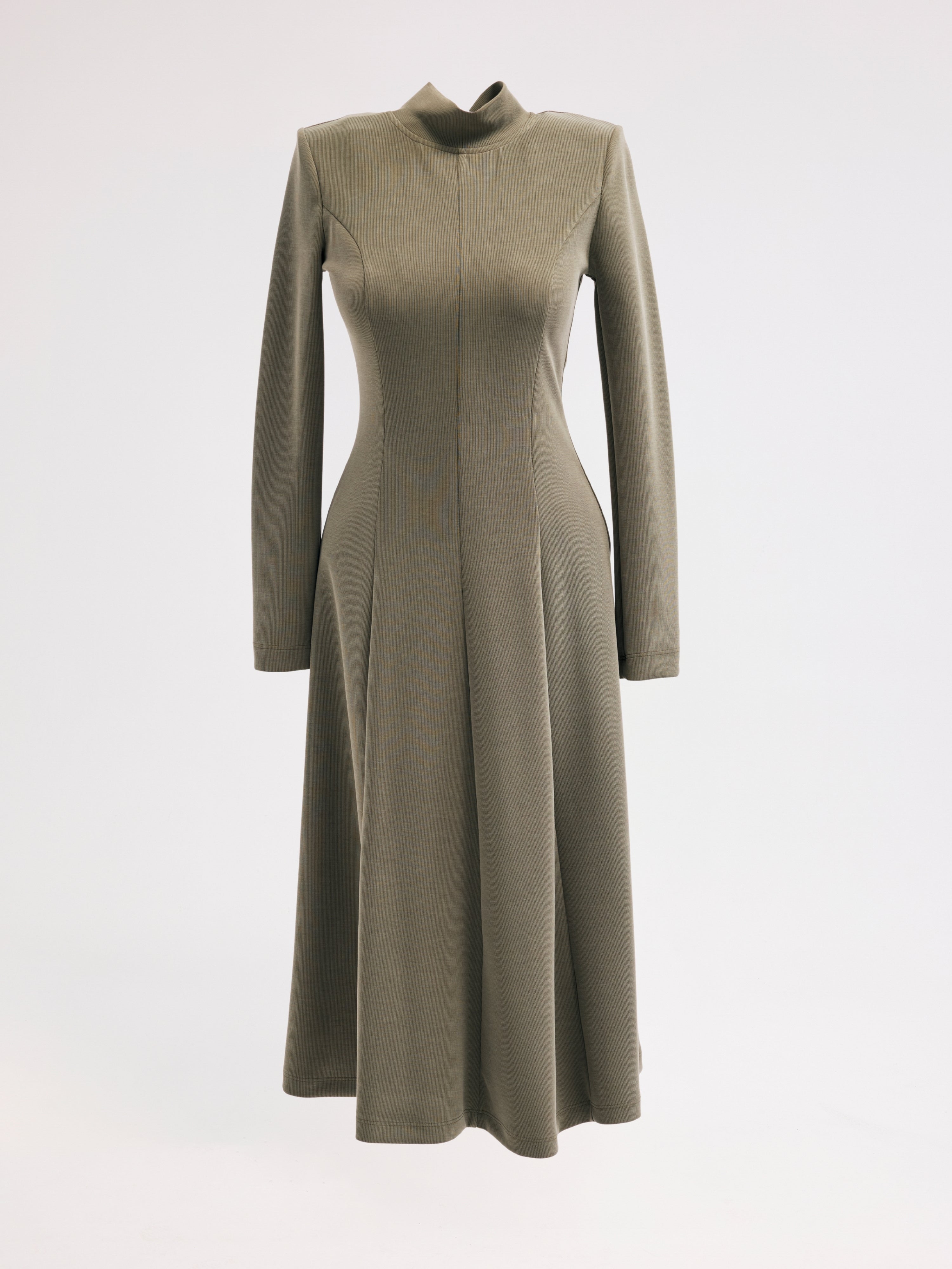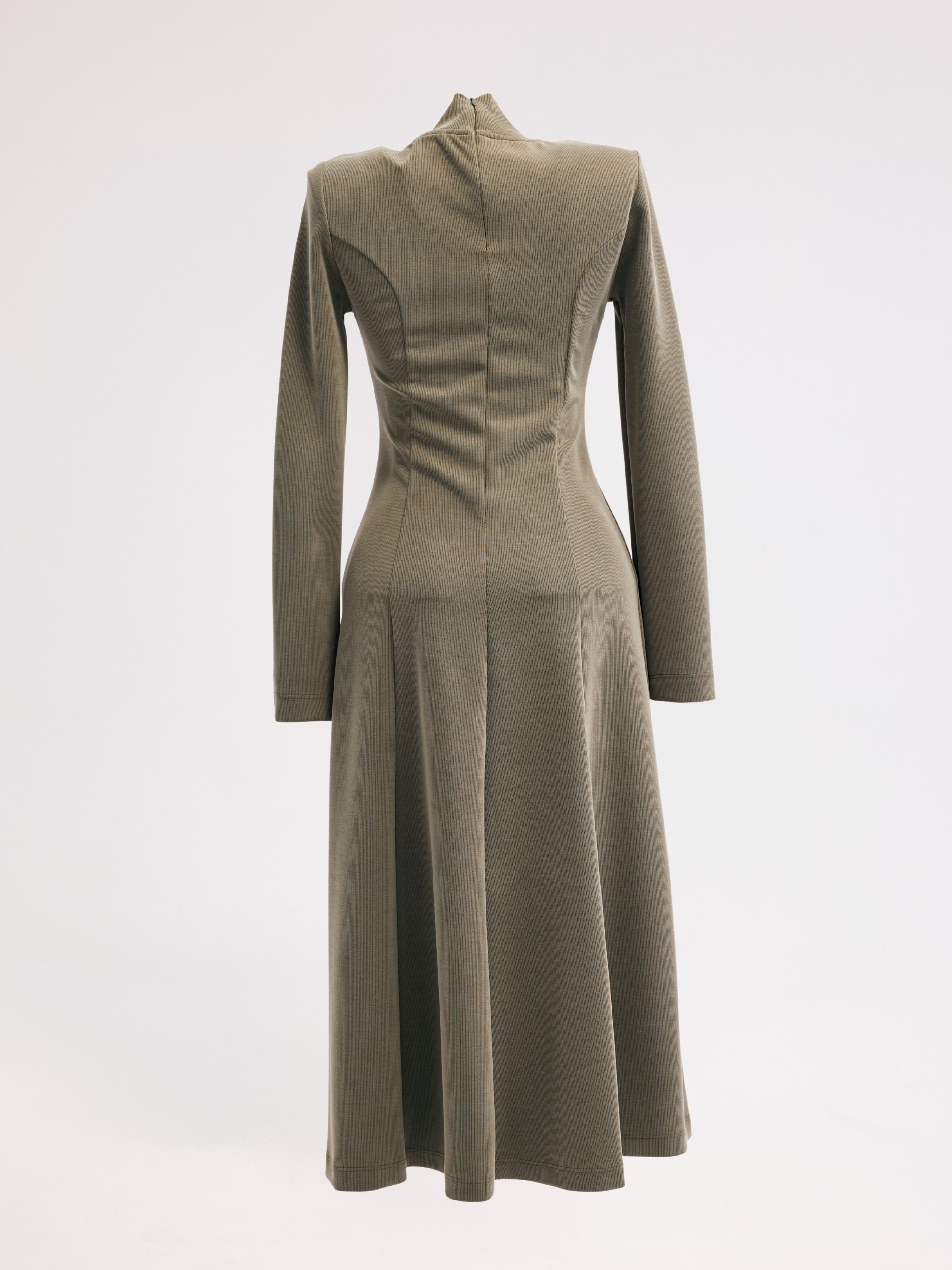 Uzun kollu, dik yaka tasarımı ve sırt fermuar kapamasıyla modern bir görünüm sunan bu kadın elbise, akıcı ve dökümlü siluetiyle dikkat çeker. Midi-uzun formu, zamansız ve şık kombinler için ideal bir tercih oluşturur.
