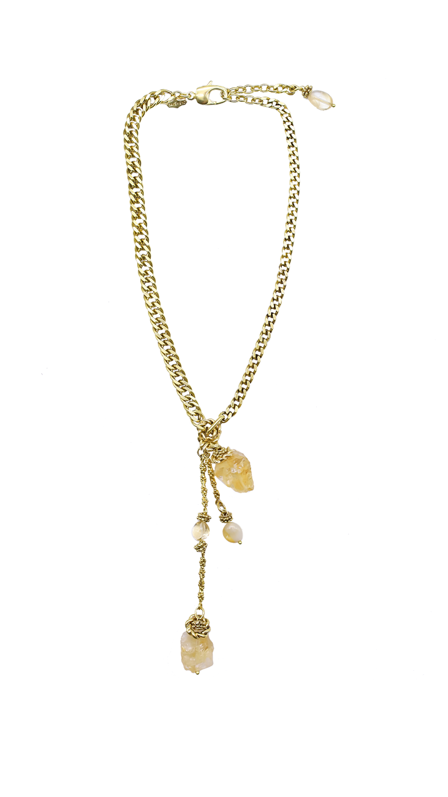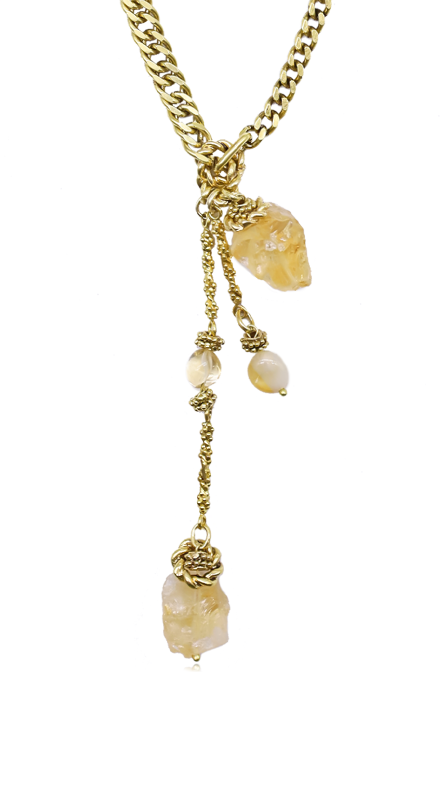 Uç kısımdaki püsküller hareketin özgürlüğünü sembolize ederken, sitrin taşları kolyeye canlılık ve dinamizm katar.