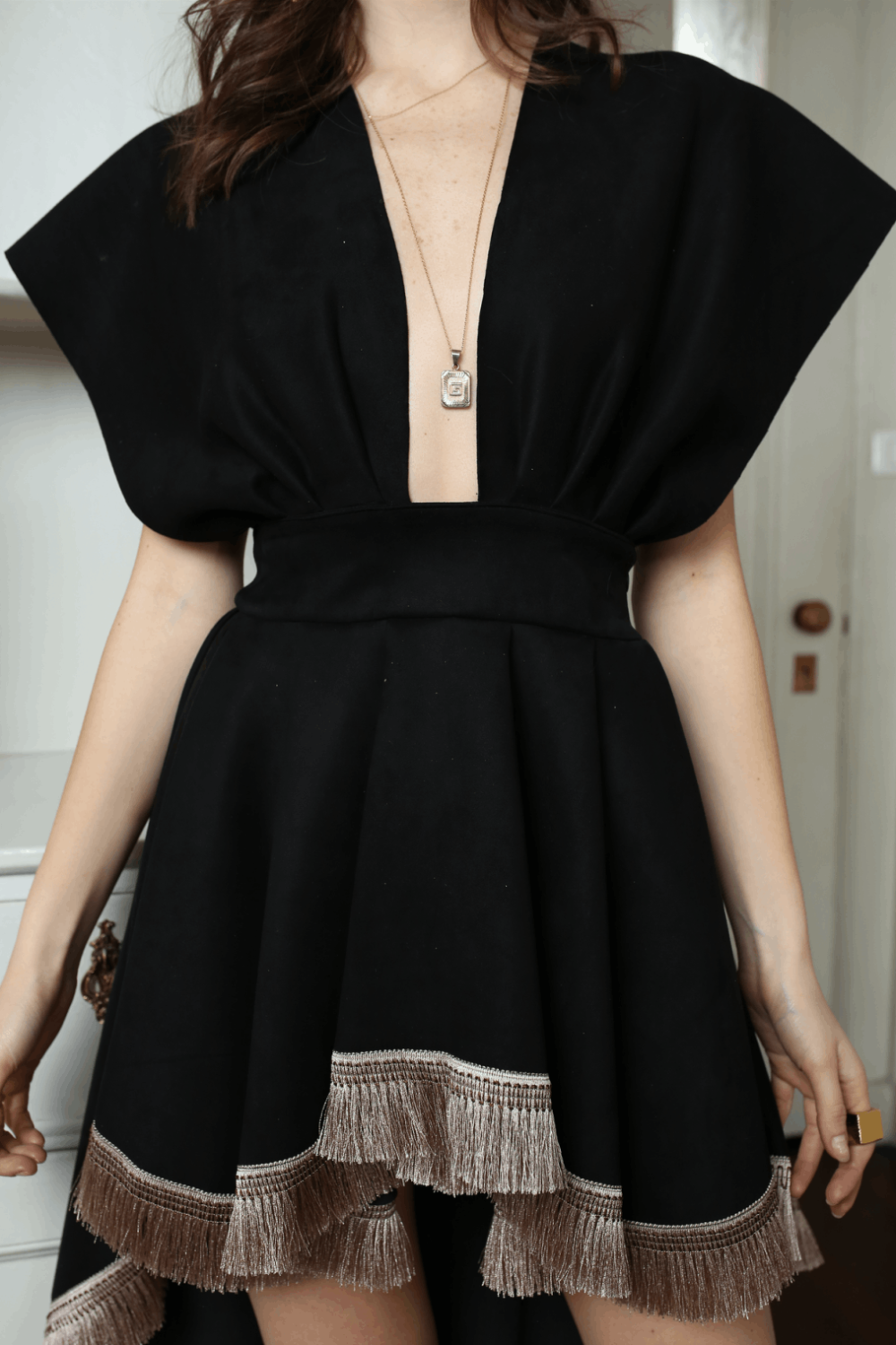 Nubuk kumaştan özel olarak Eclectic atölyesinde üretilmiştir.Önü kısa arkası uzun uçları püsküllü bir elbisedir.