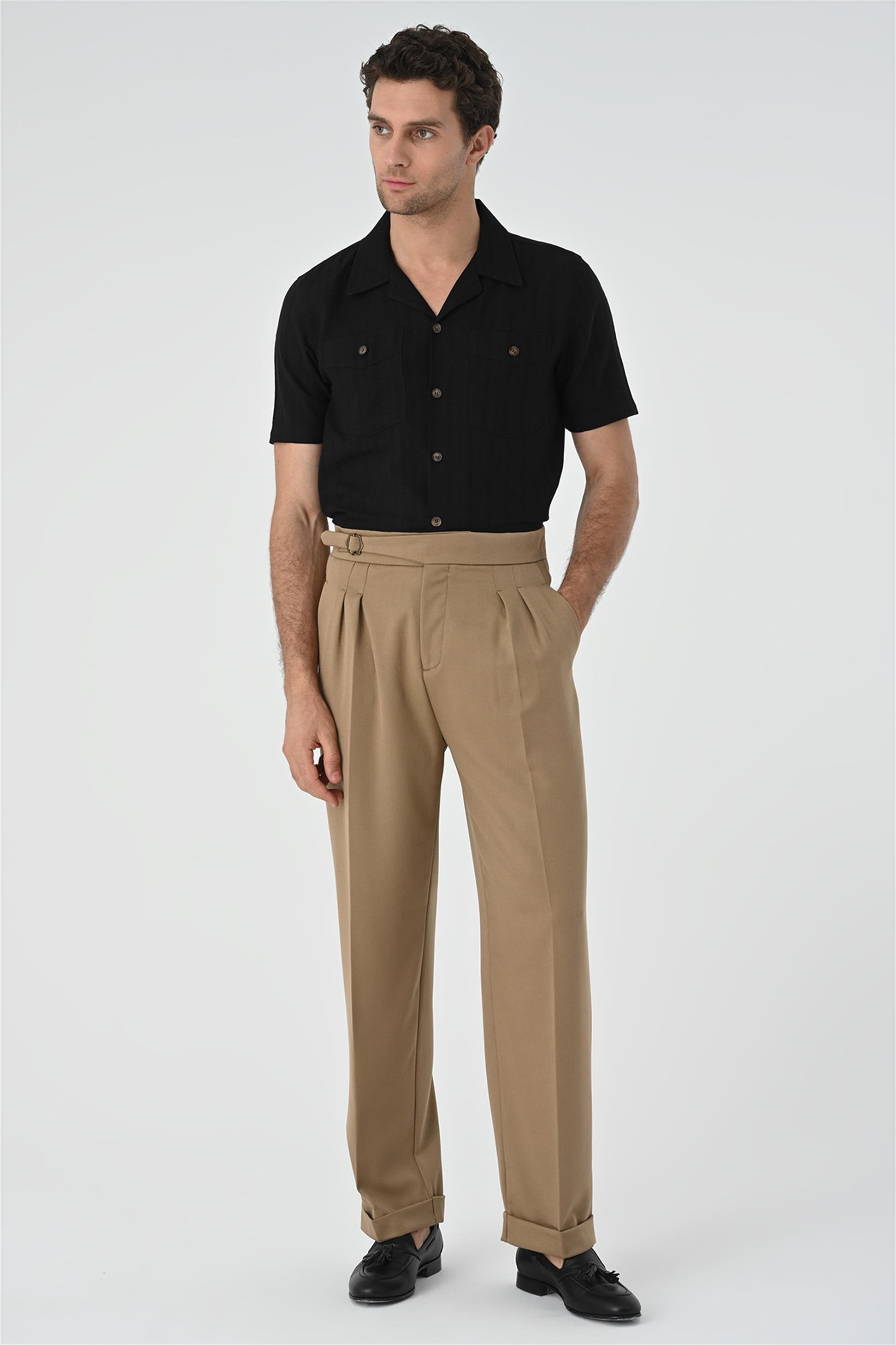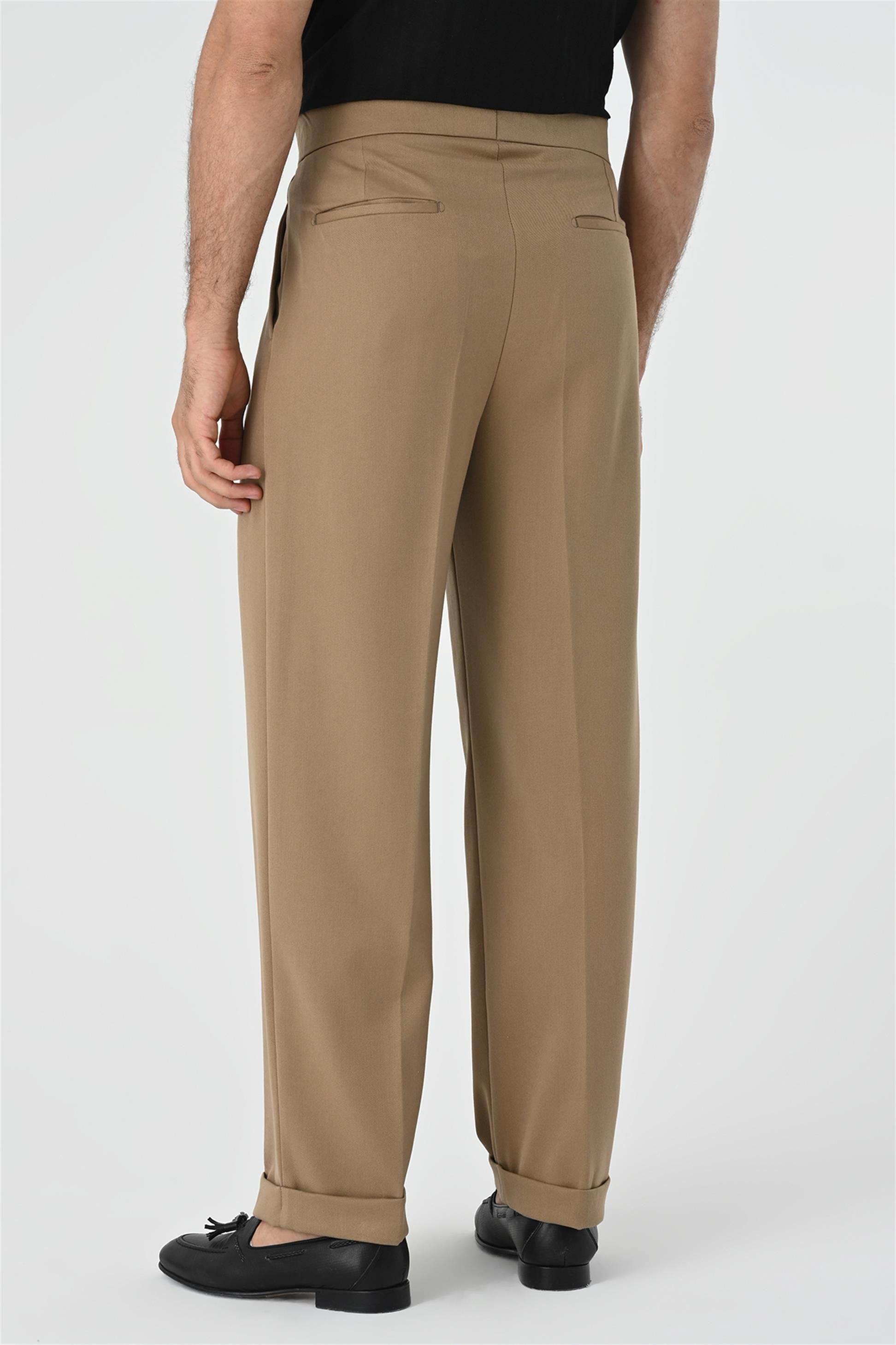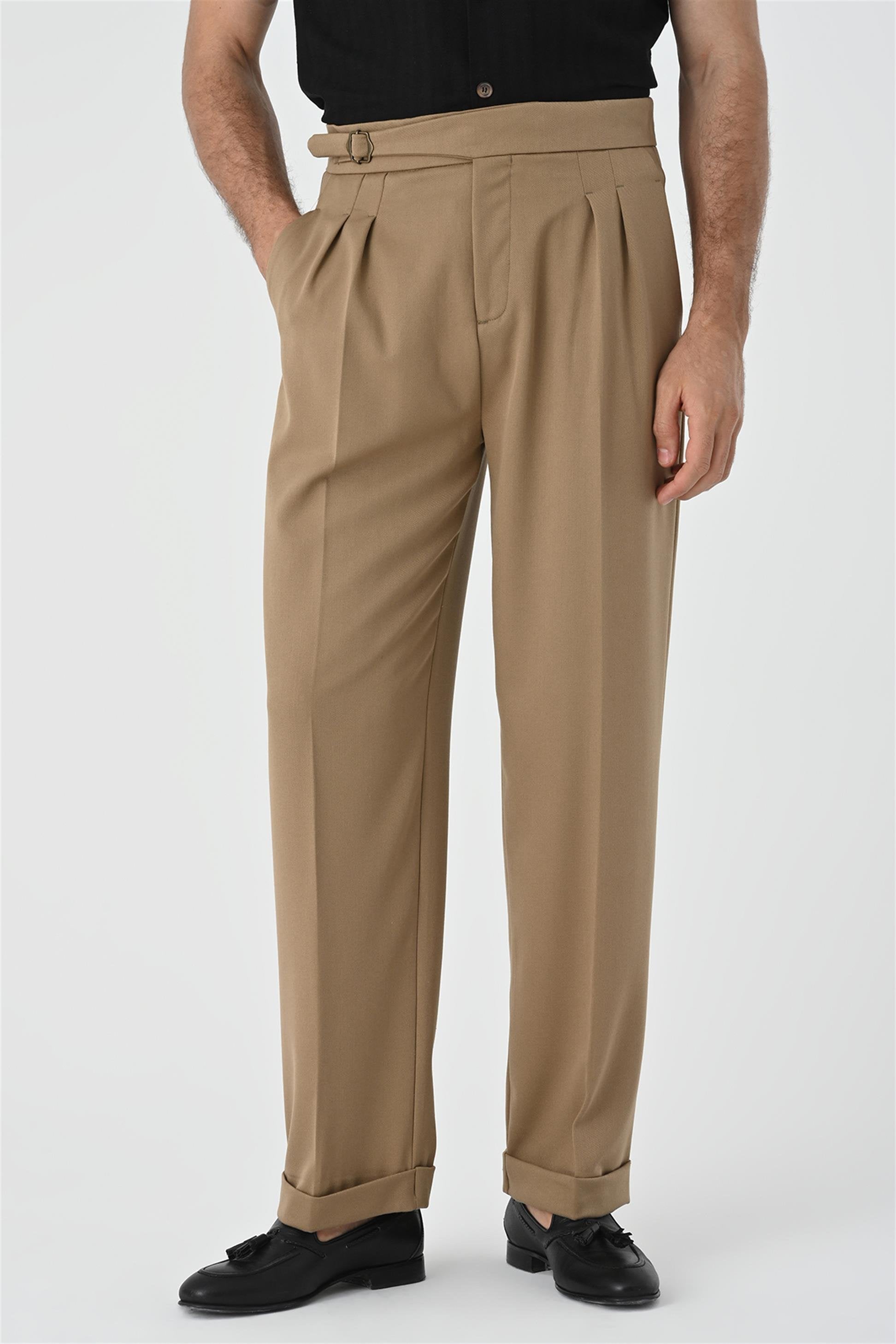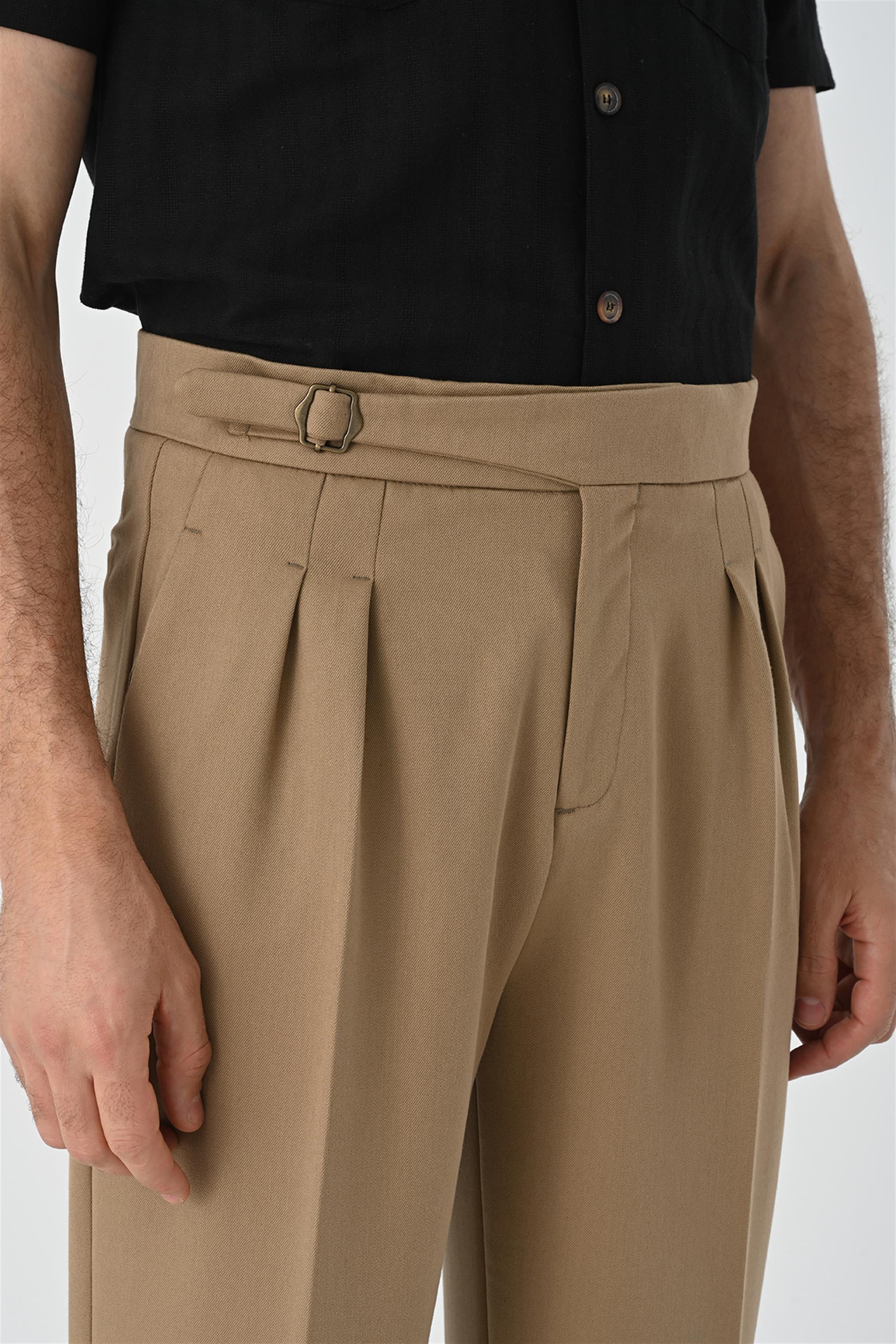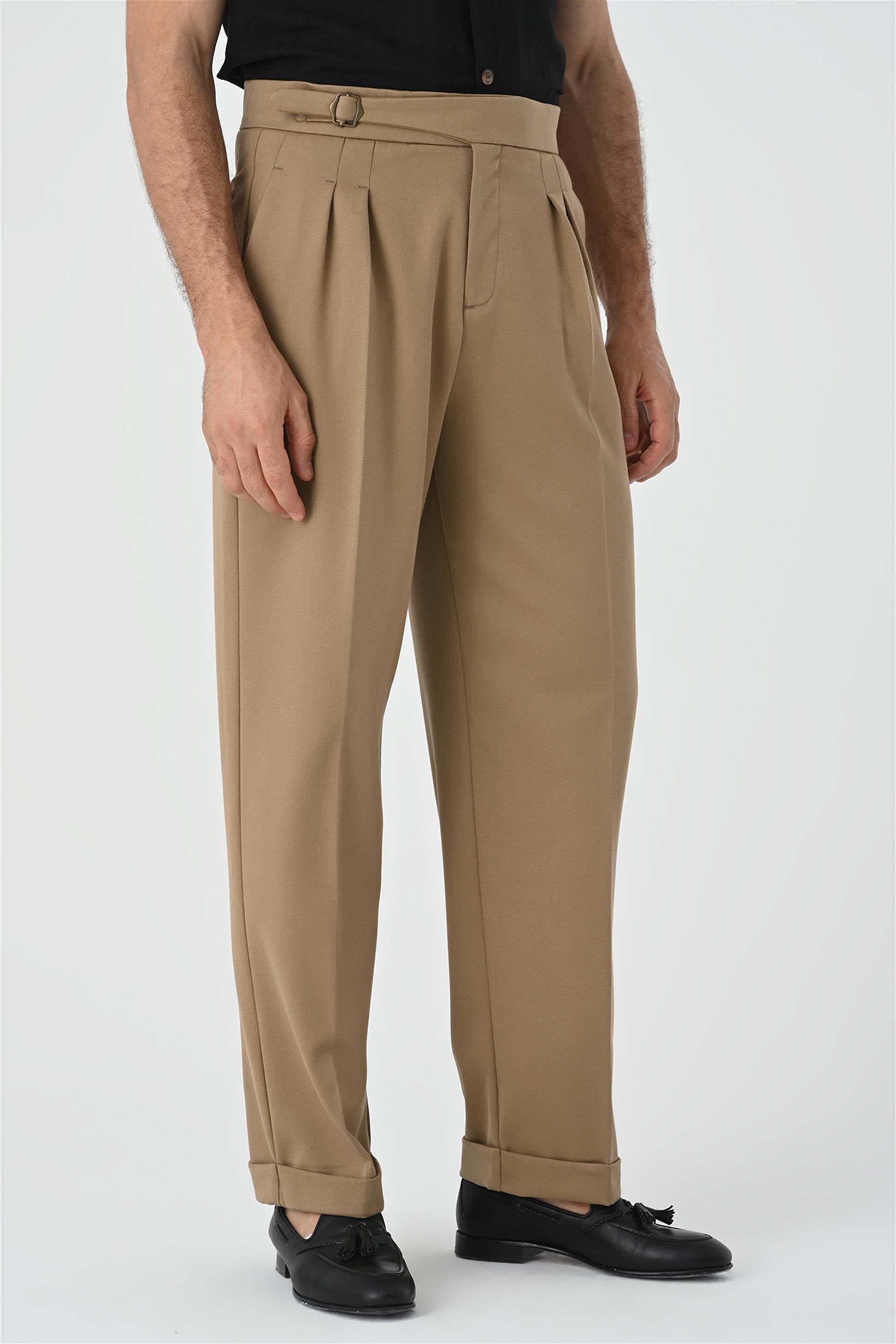 Açık Vizon Toka Detaylı Pileli Yüksek Bel Erkek Pantolon