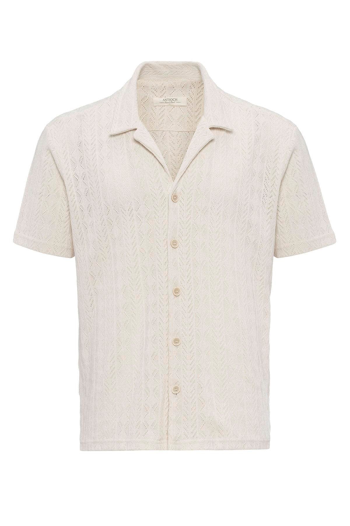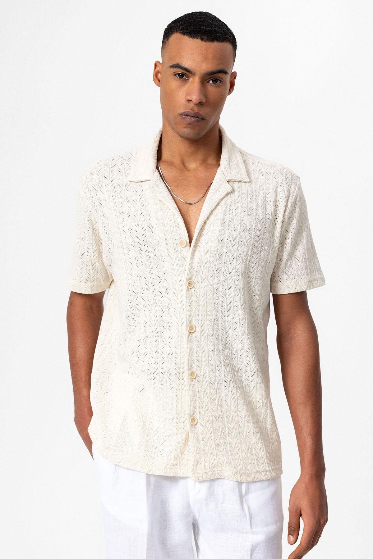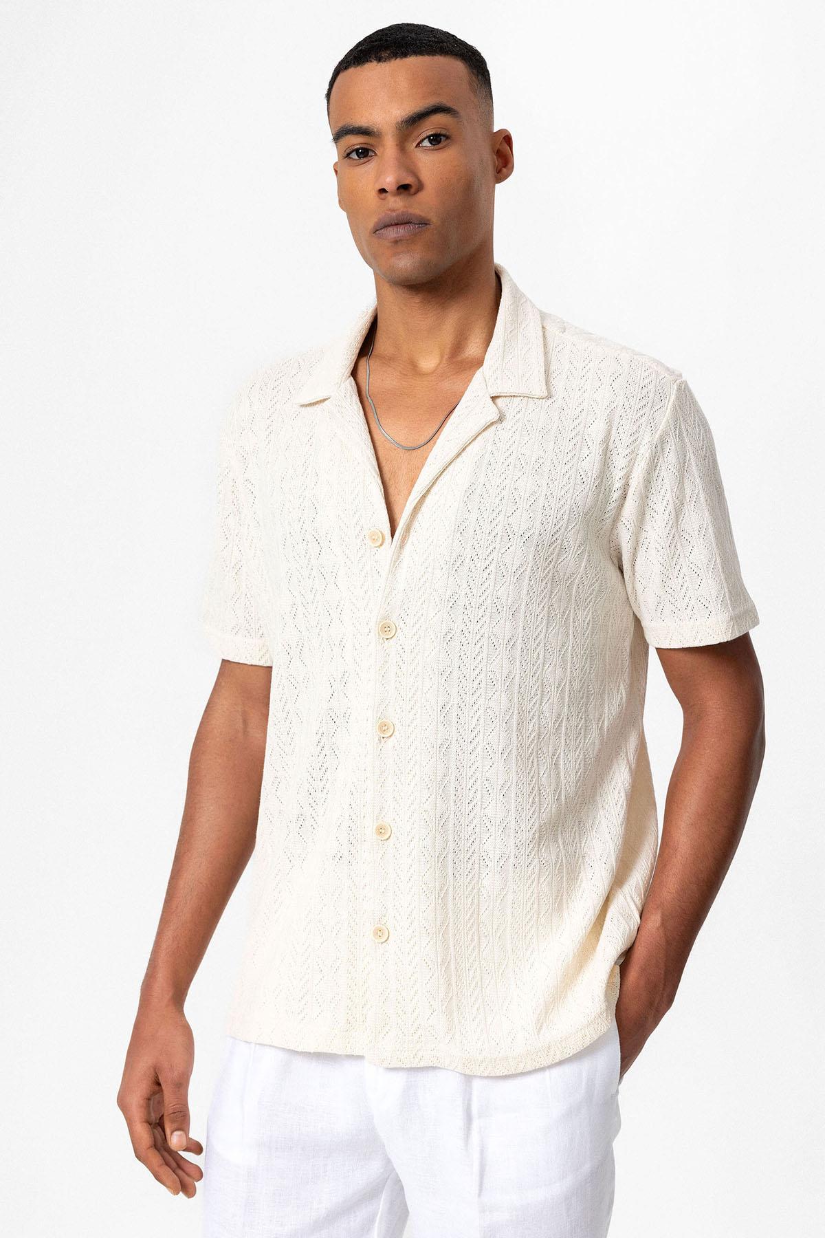 Ekru Apaş Yaka Örme Desenli Erkek Gömlek