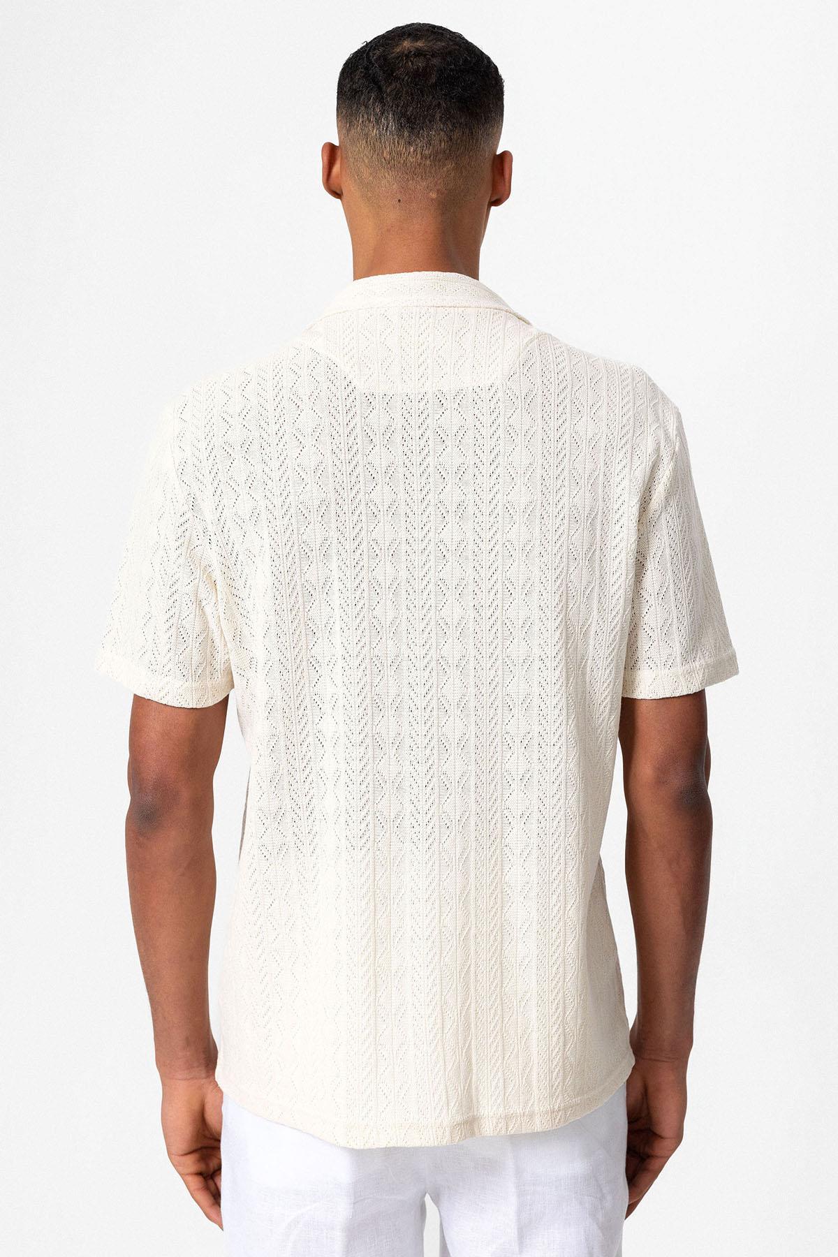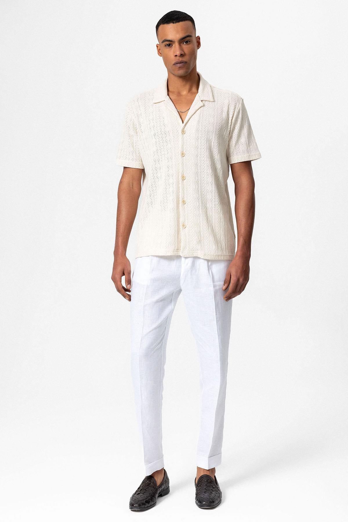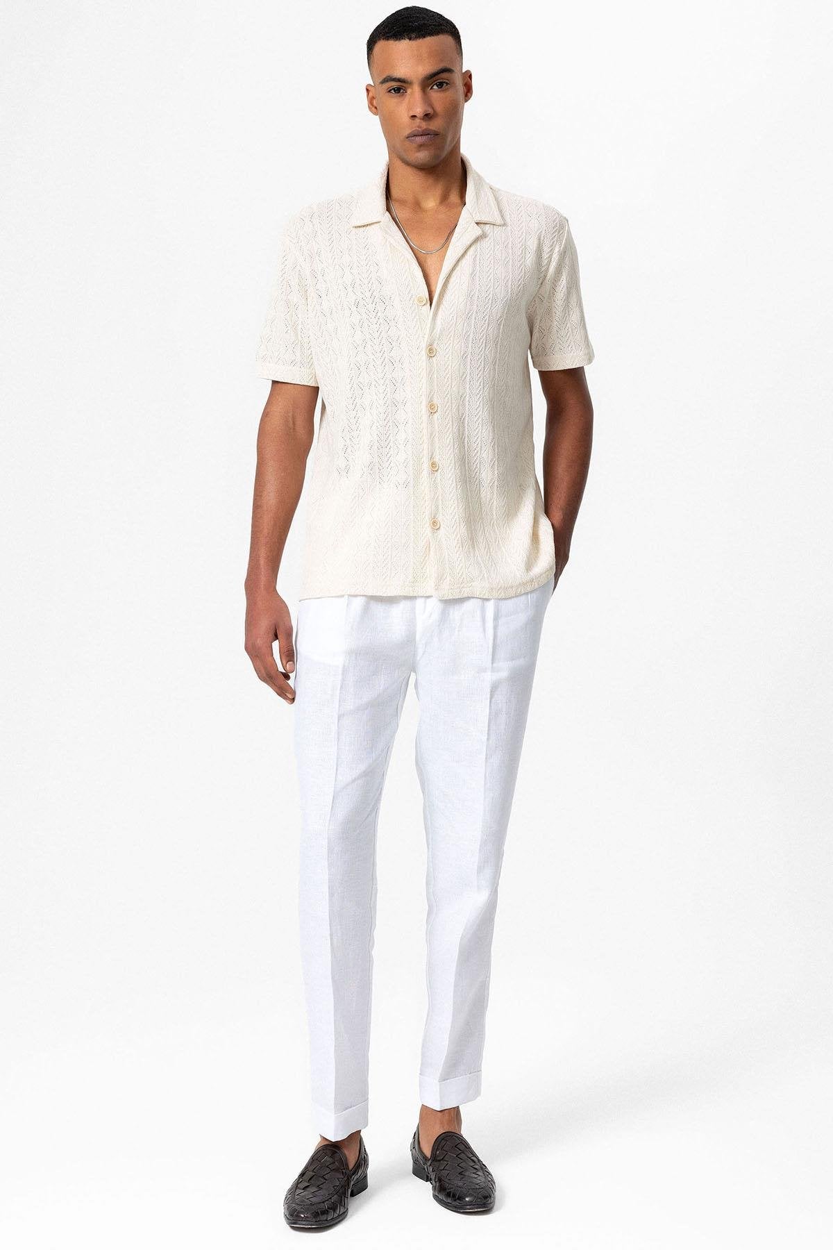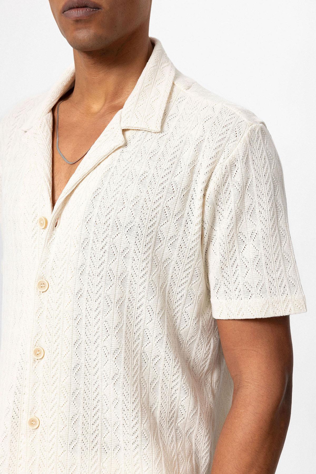 Ekru Apaş Yaka Örme Desenli Erkek Gömlek