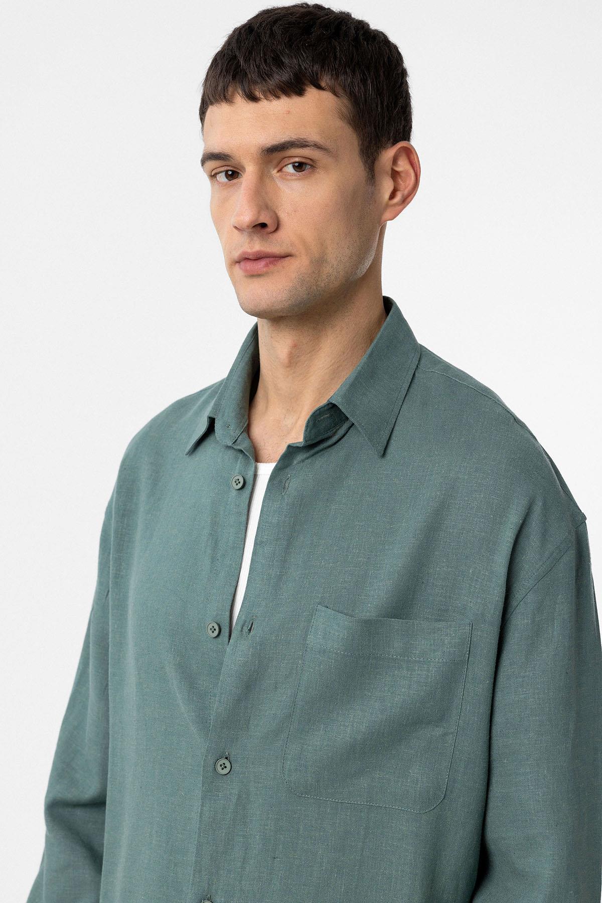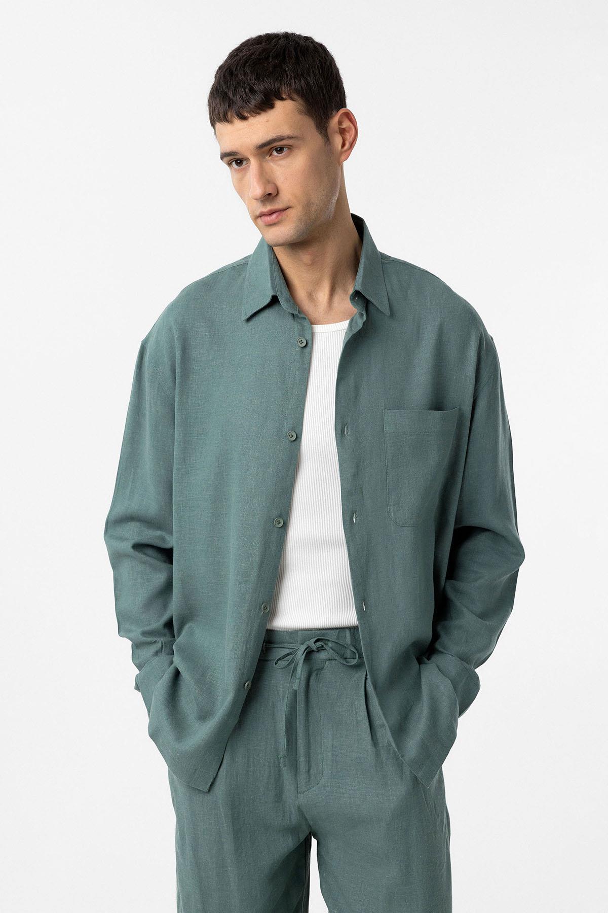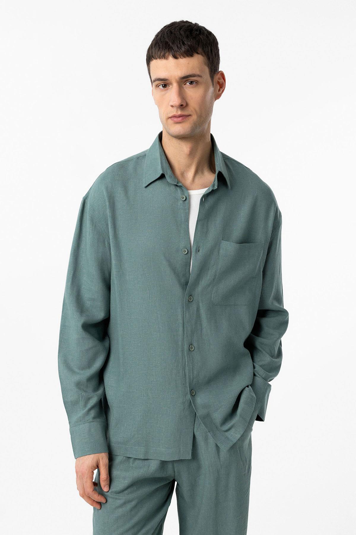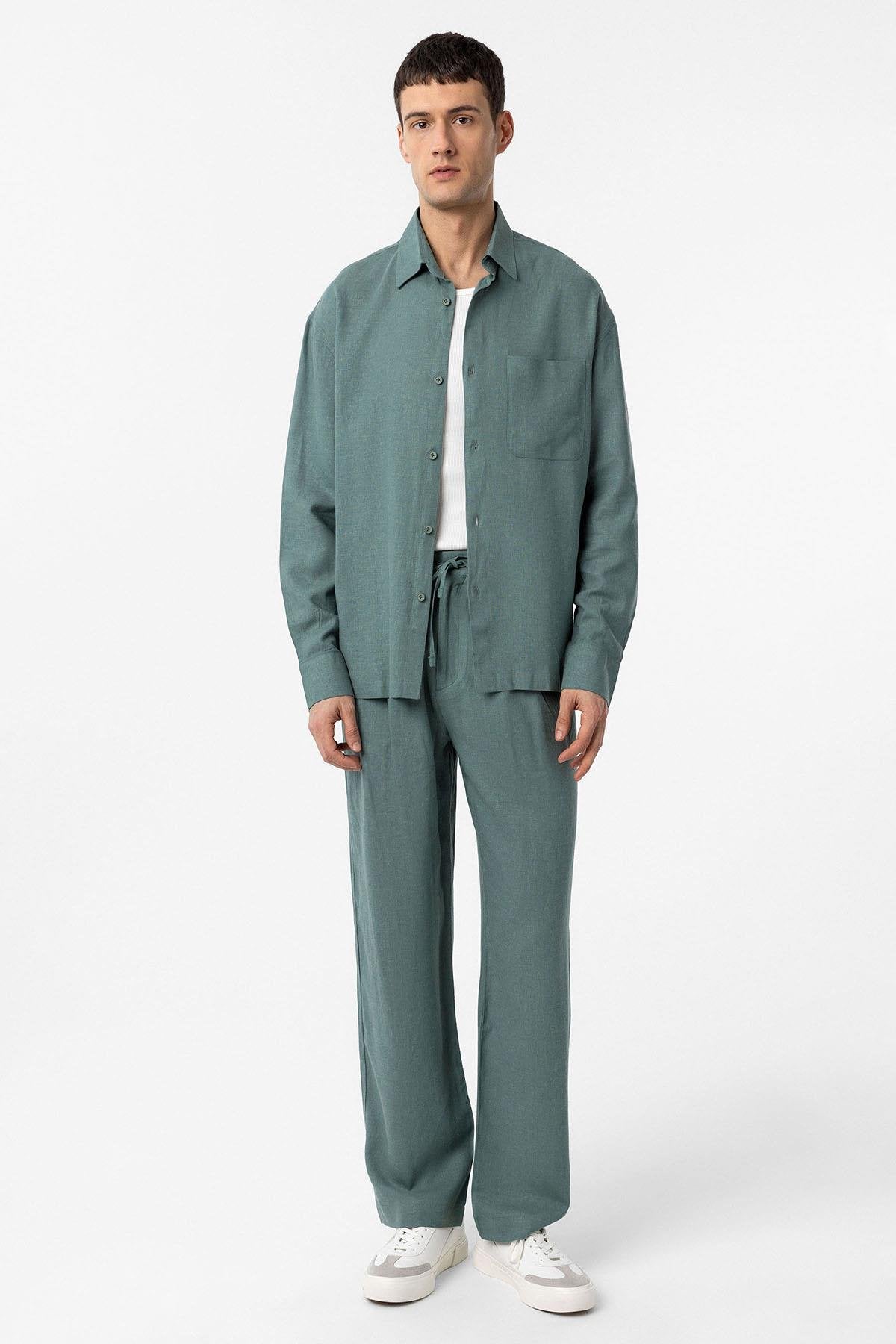 Yeşil Keten Karışımlı Relax Fit Erkek Gömlek