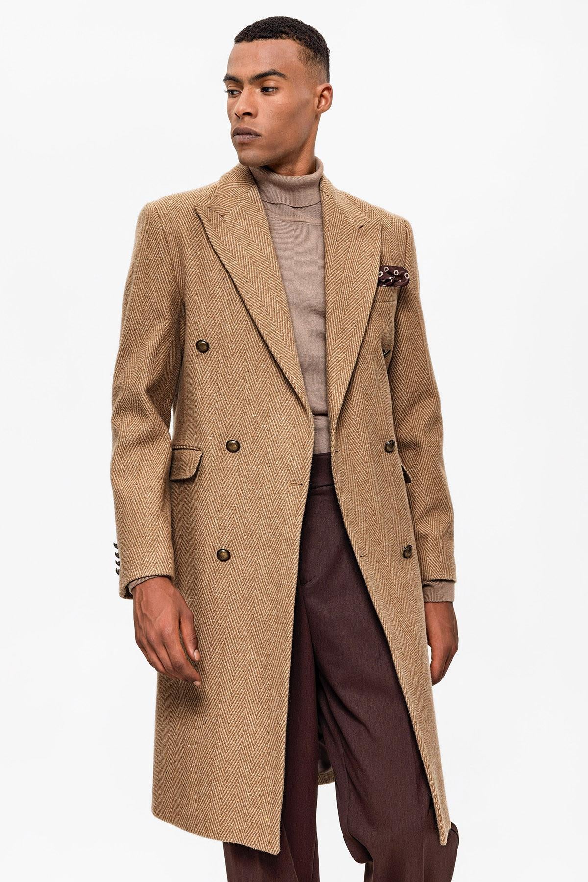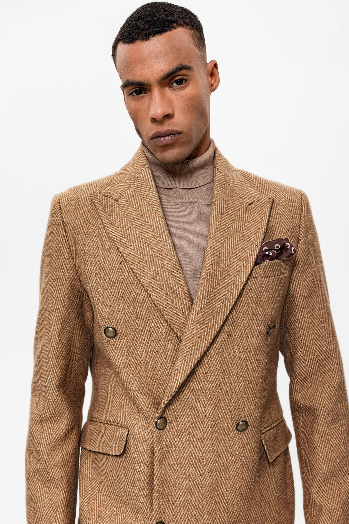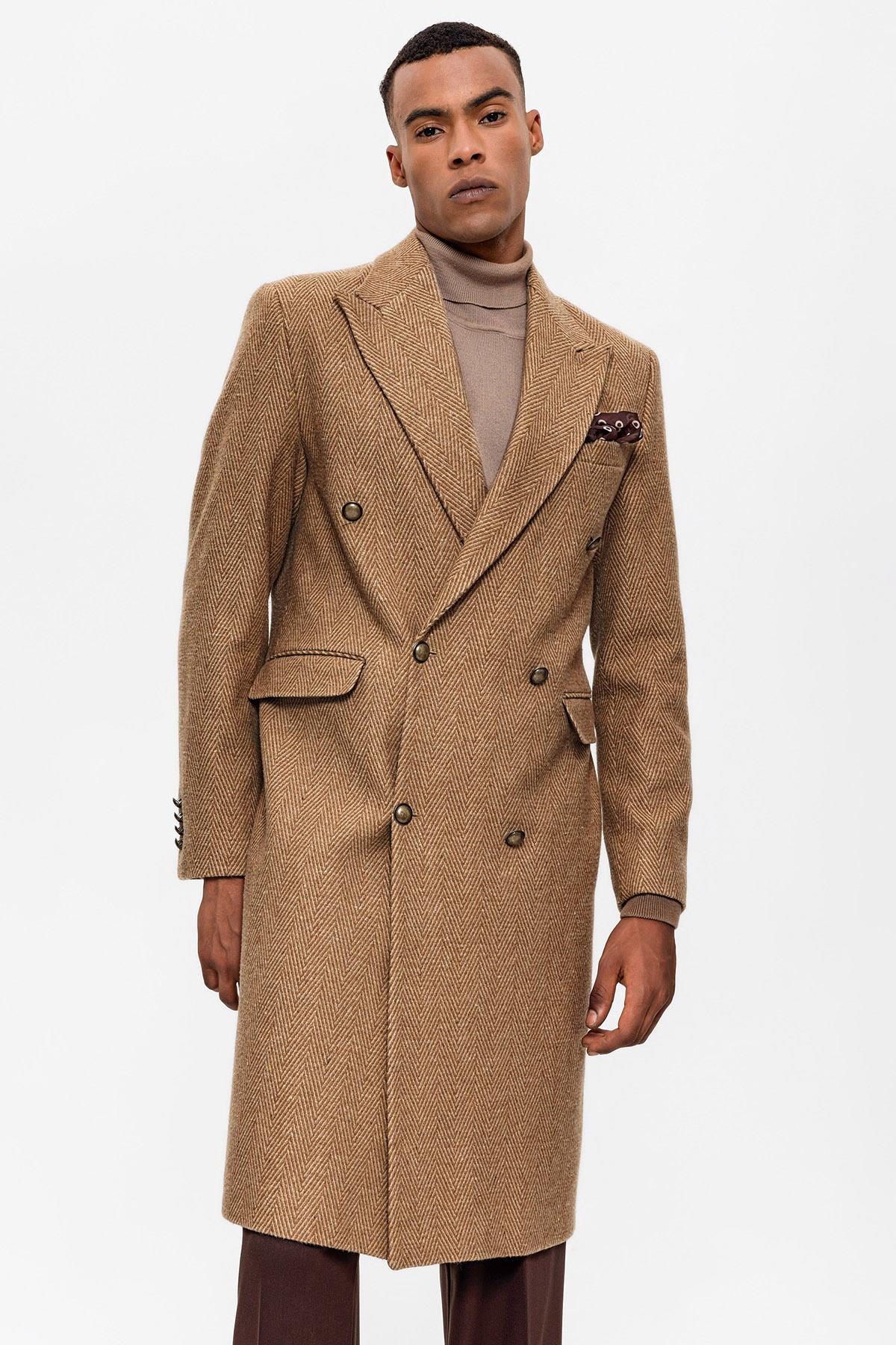 Camel Balıksırtı Desenli Kruvaze Erkek Kaban
