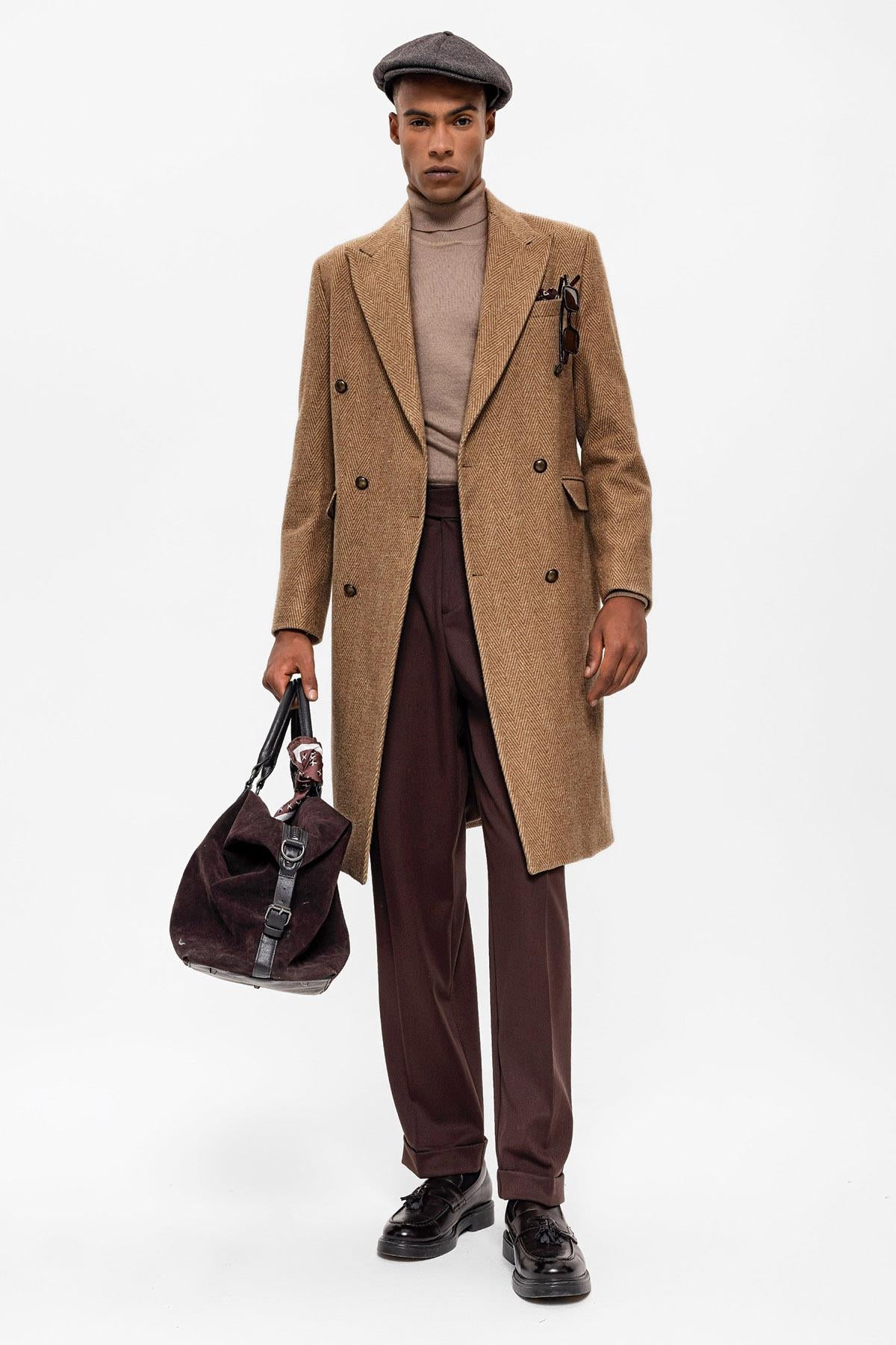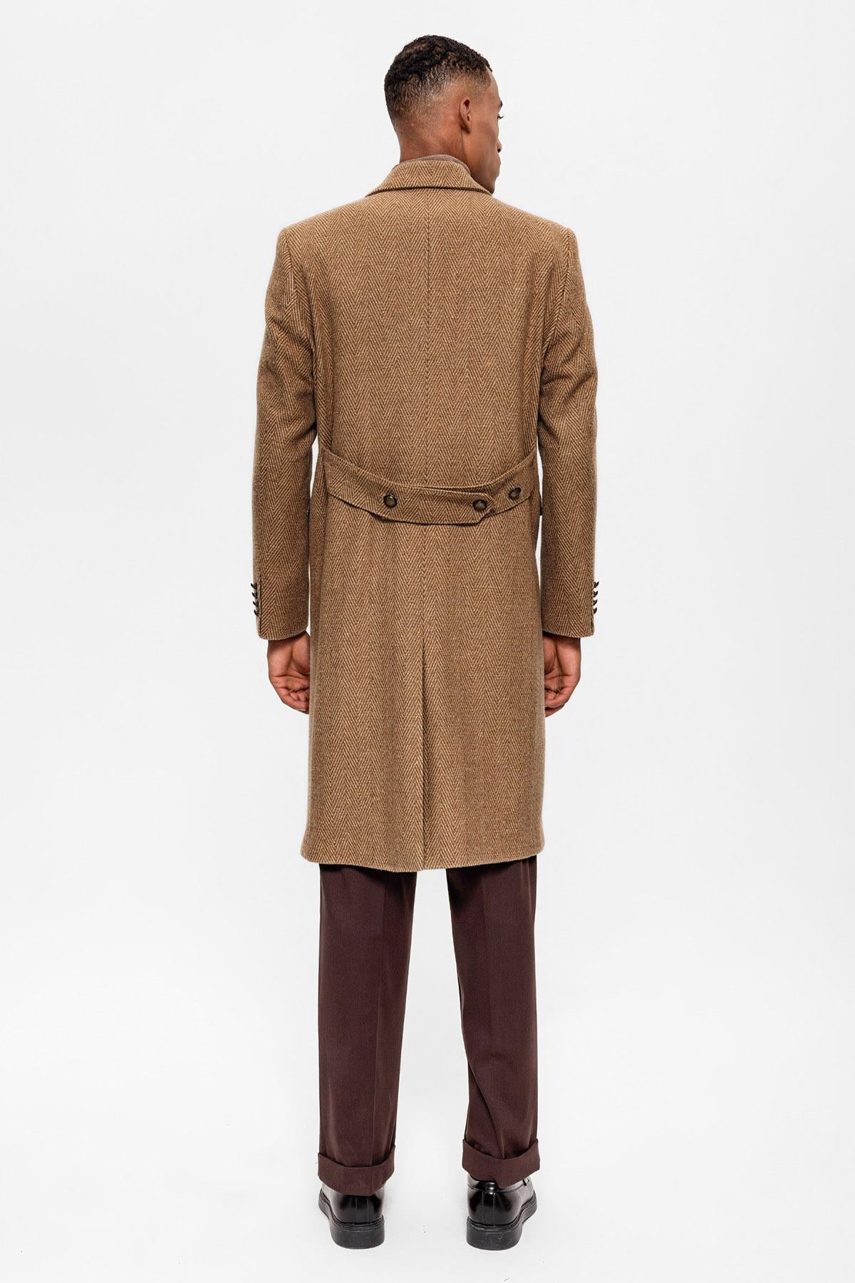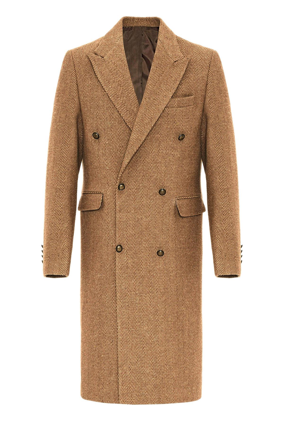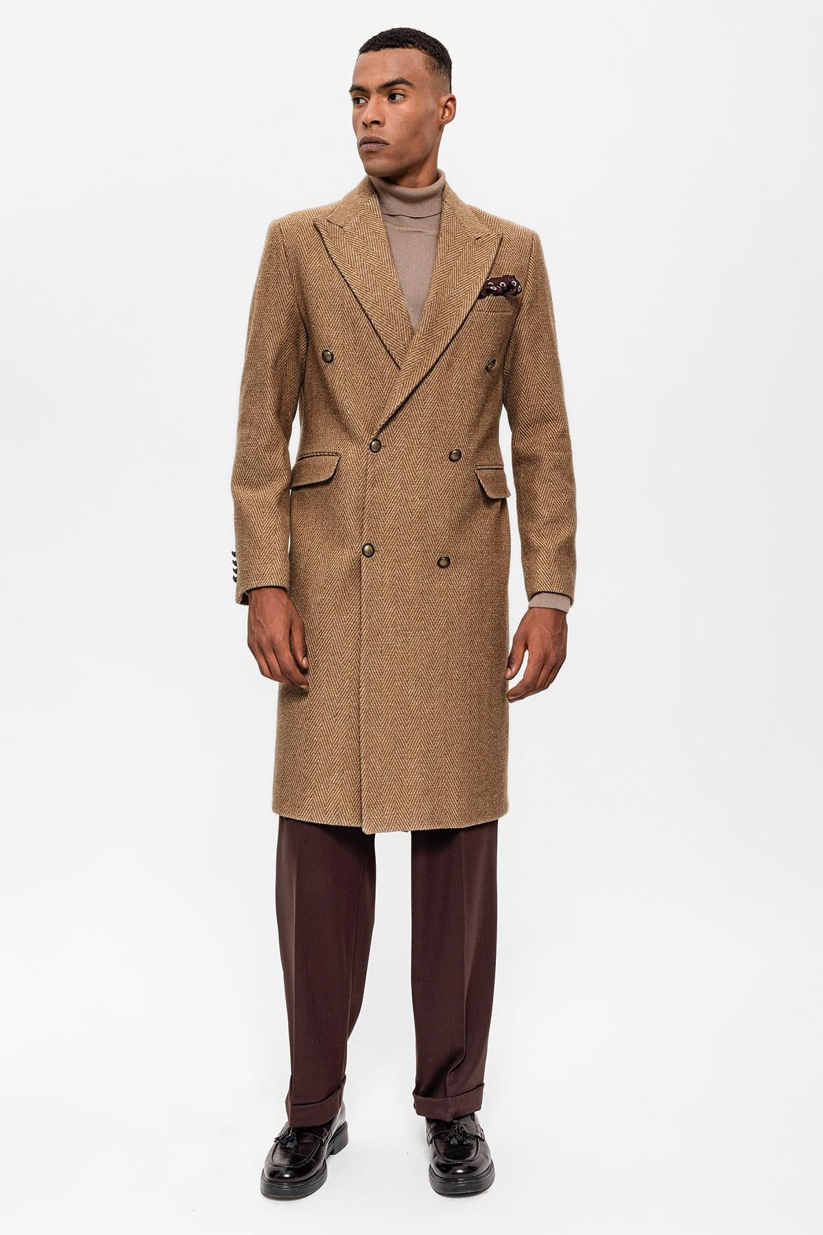 Camel Balıksırtı Desenli Kruvaze Erkek Kaban