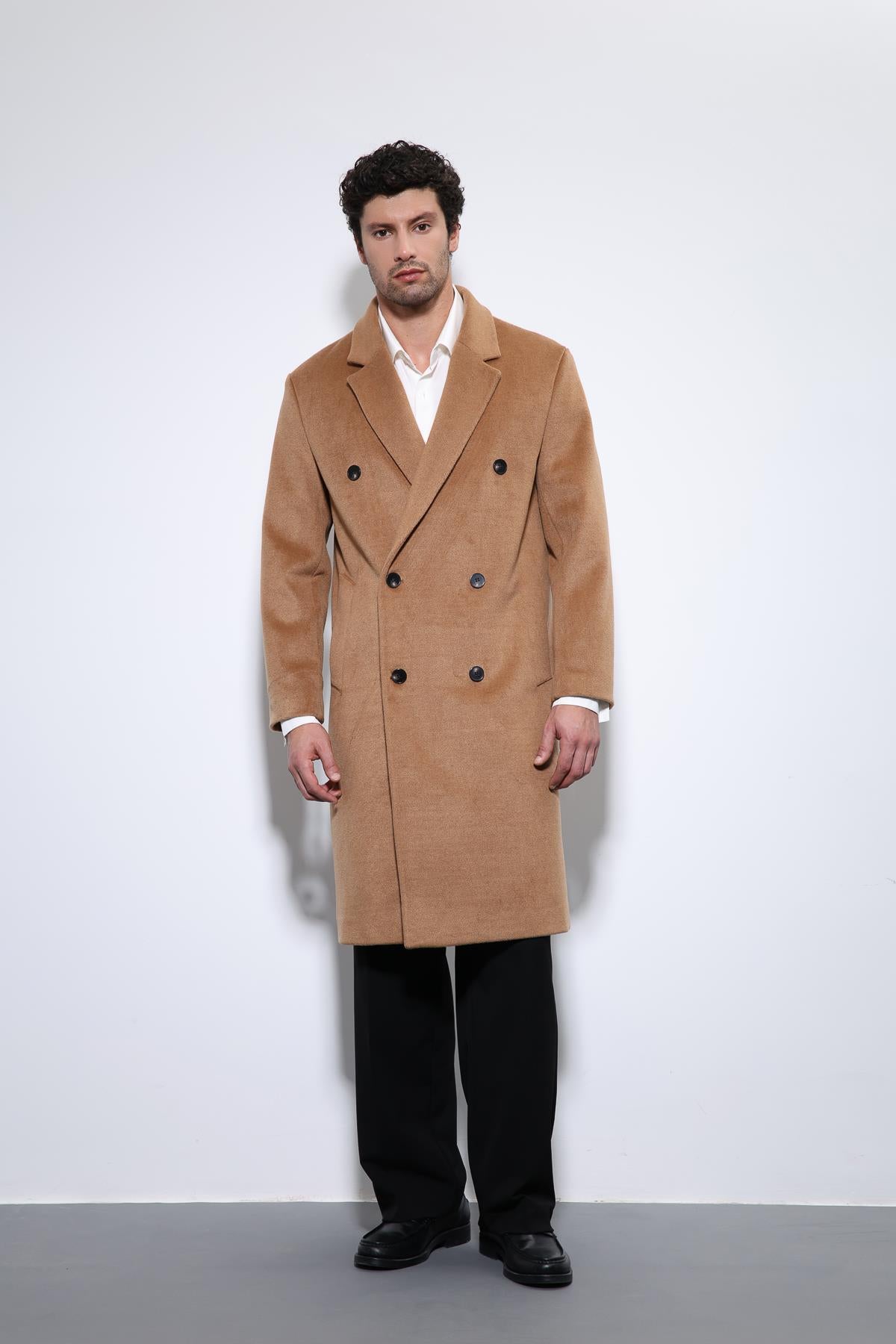 Camel Yün Karışımlı Kruvaze Erkek Kaban