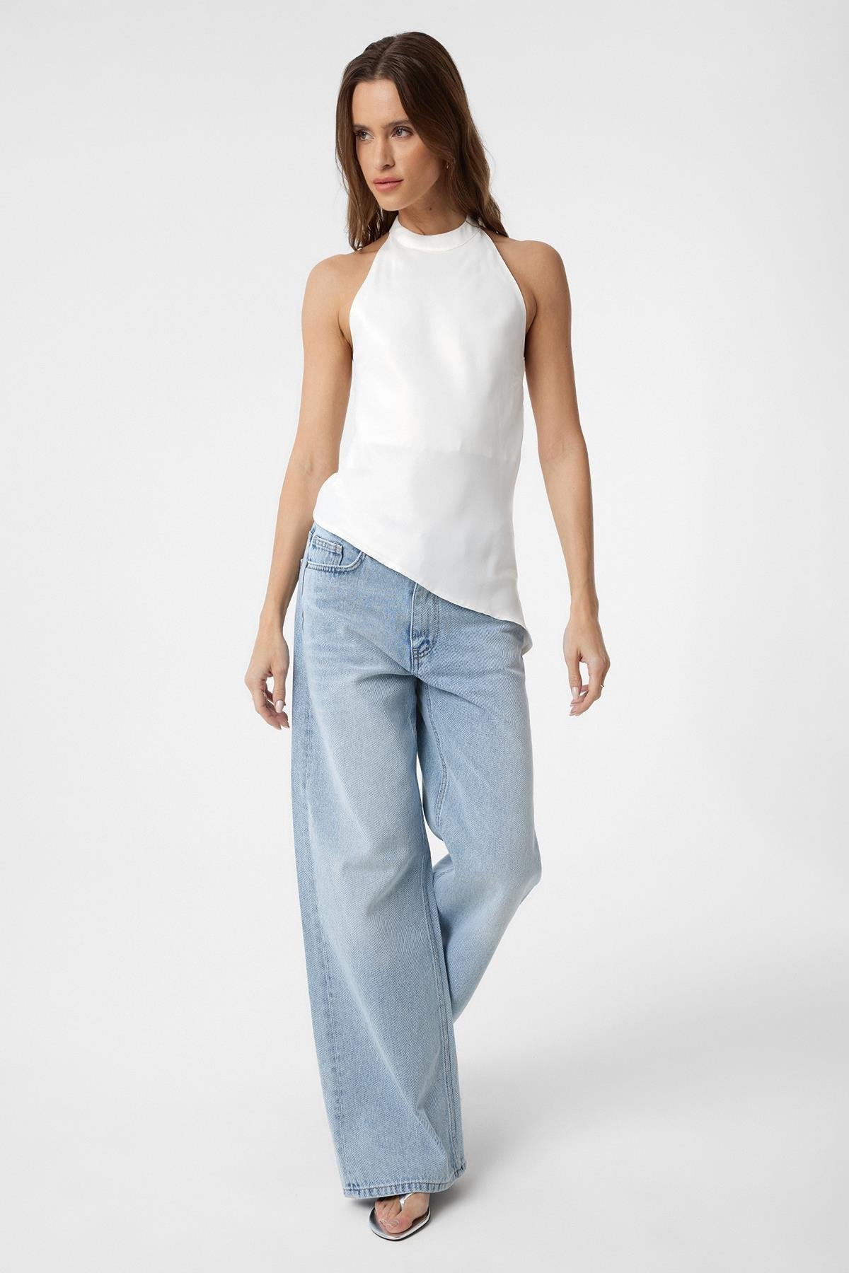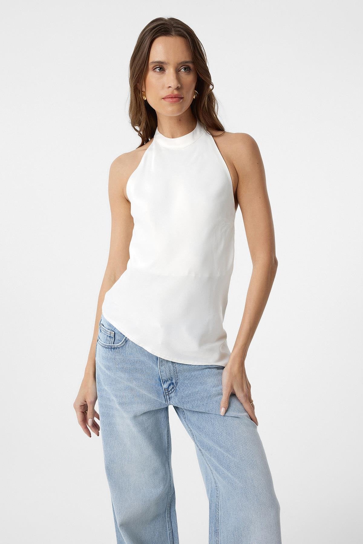 Ekru Asimetrik Saten Sırt Dekolteli Kadın Top
