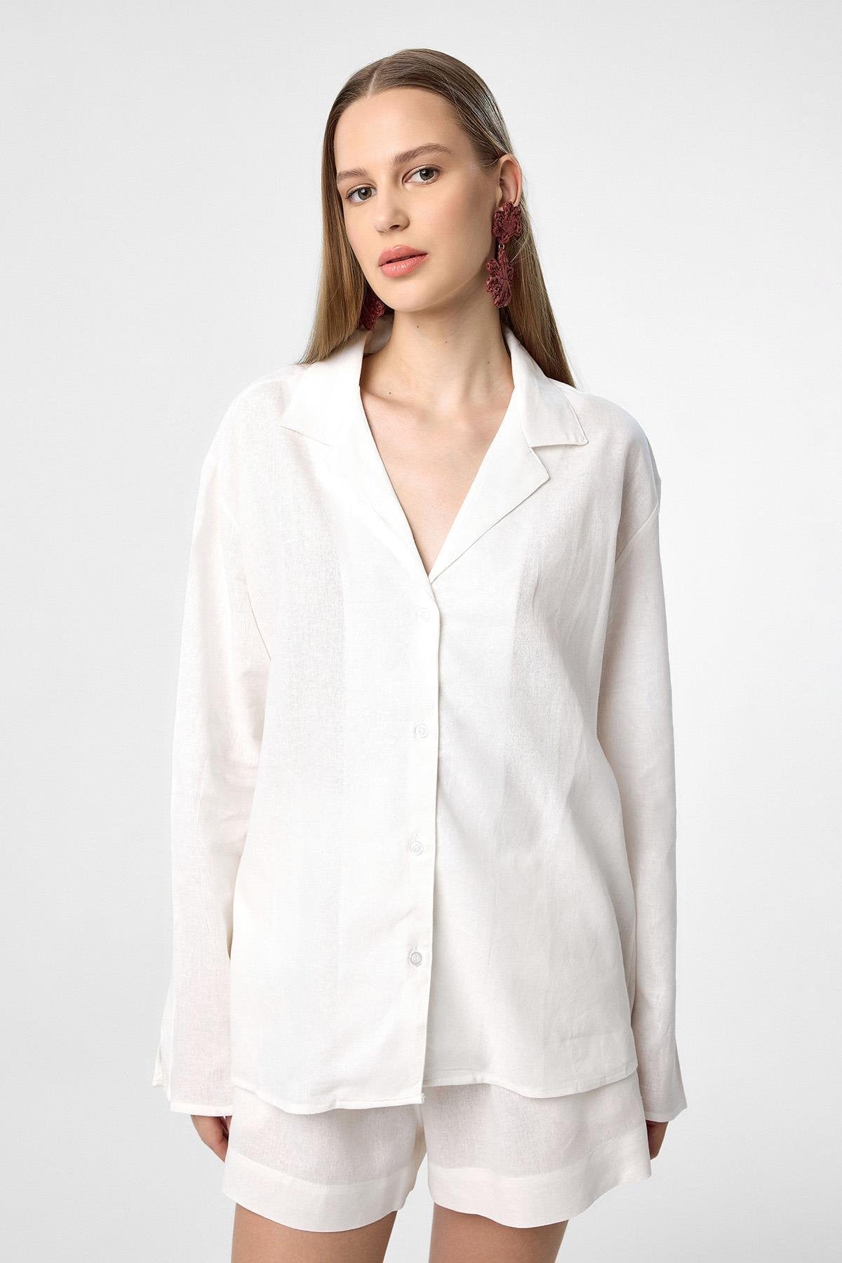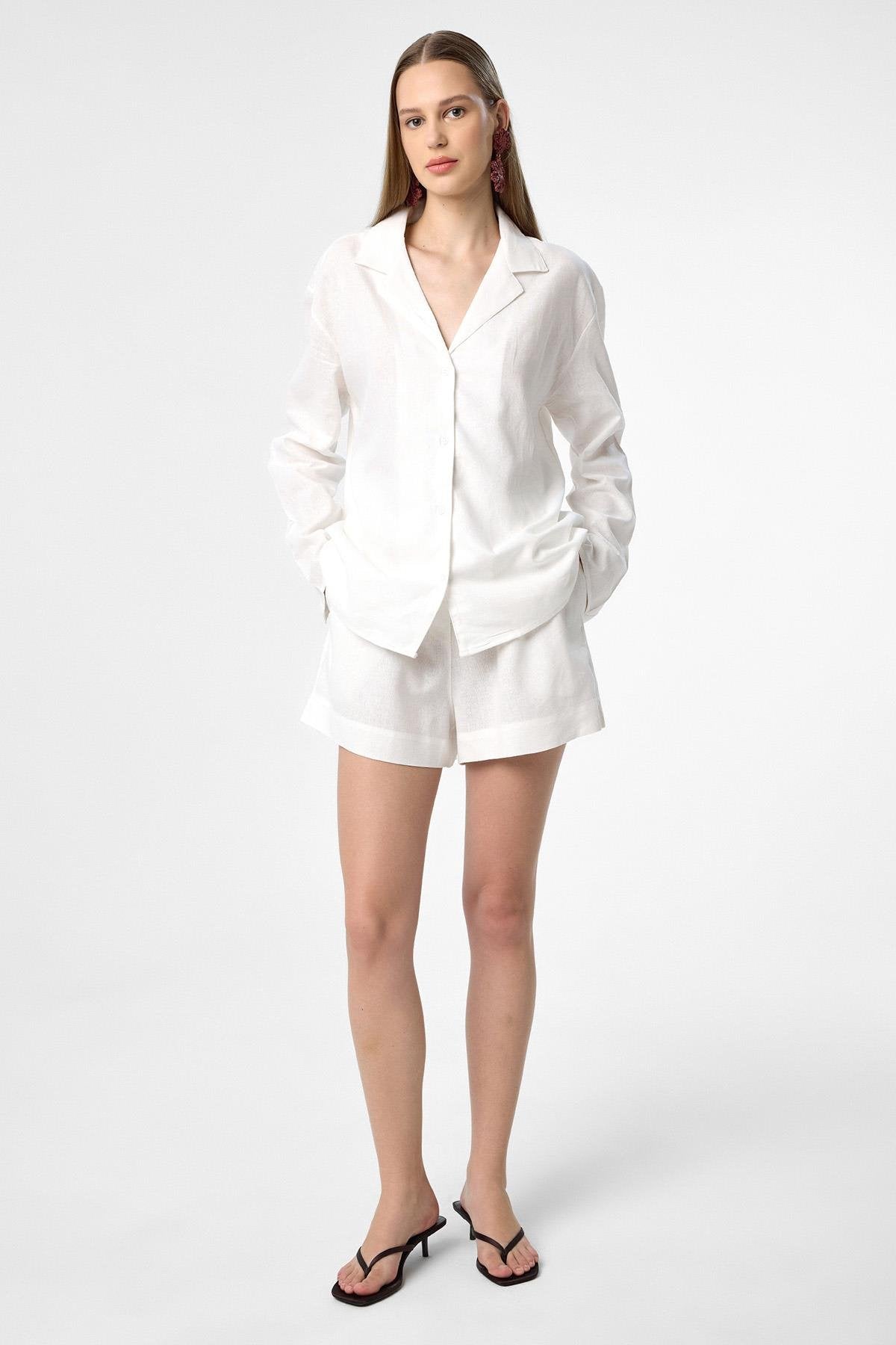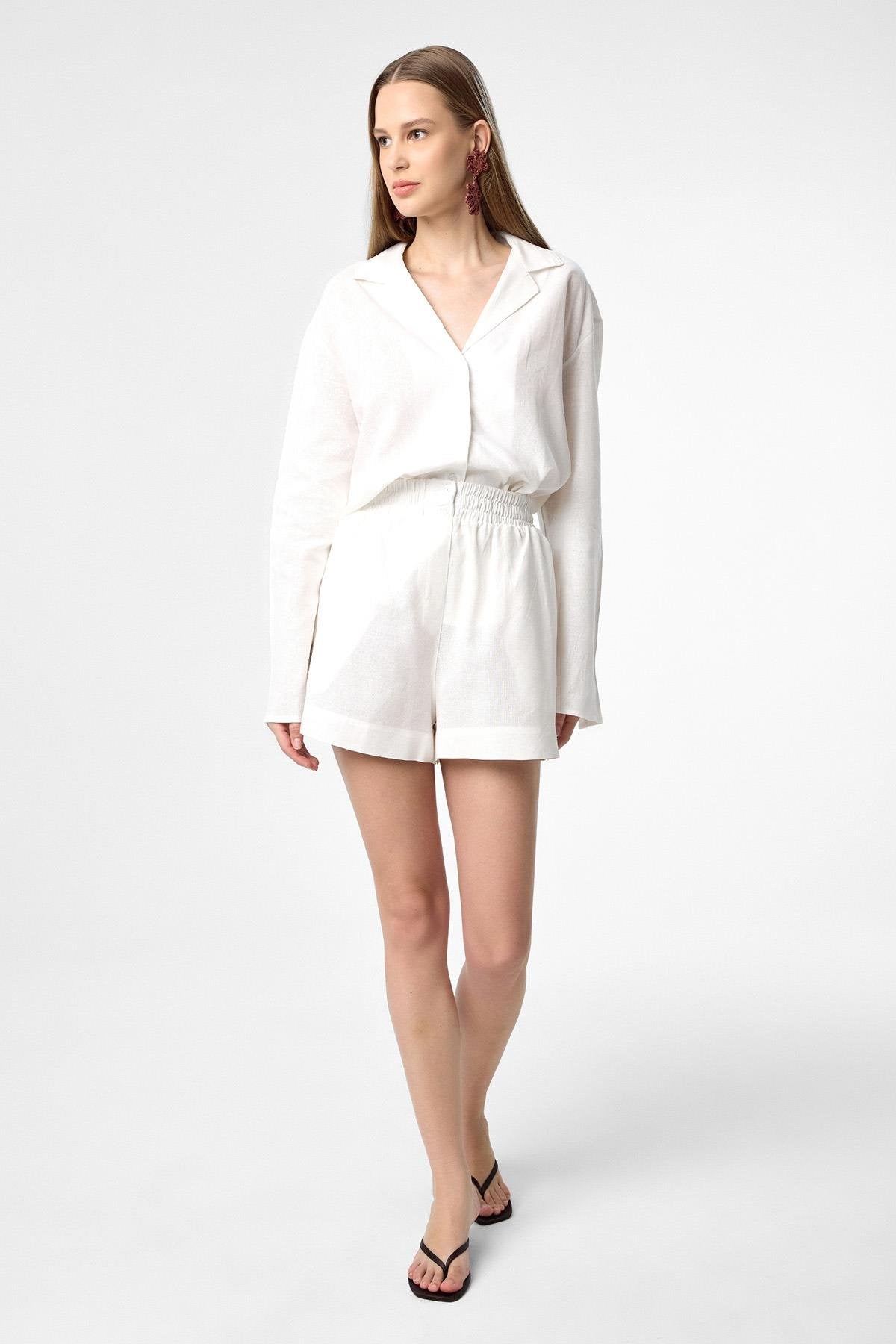 Ekru Keten Karışımlı Şort Gömlek Kadın Takım