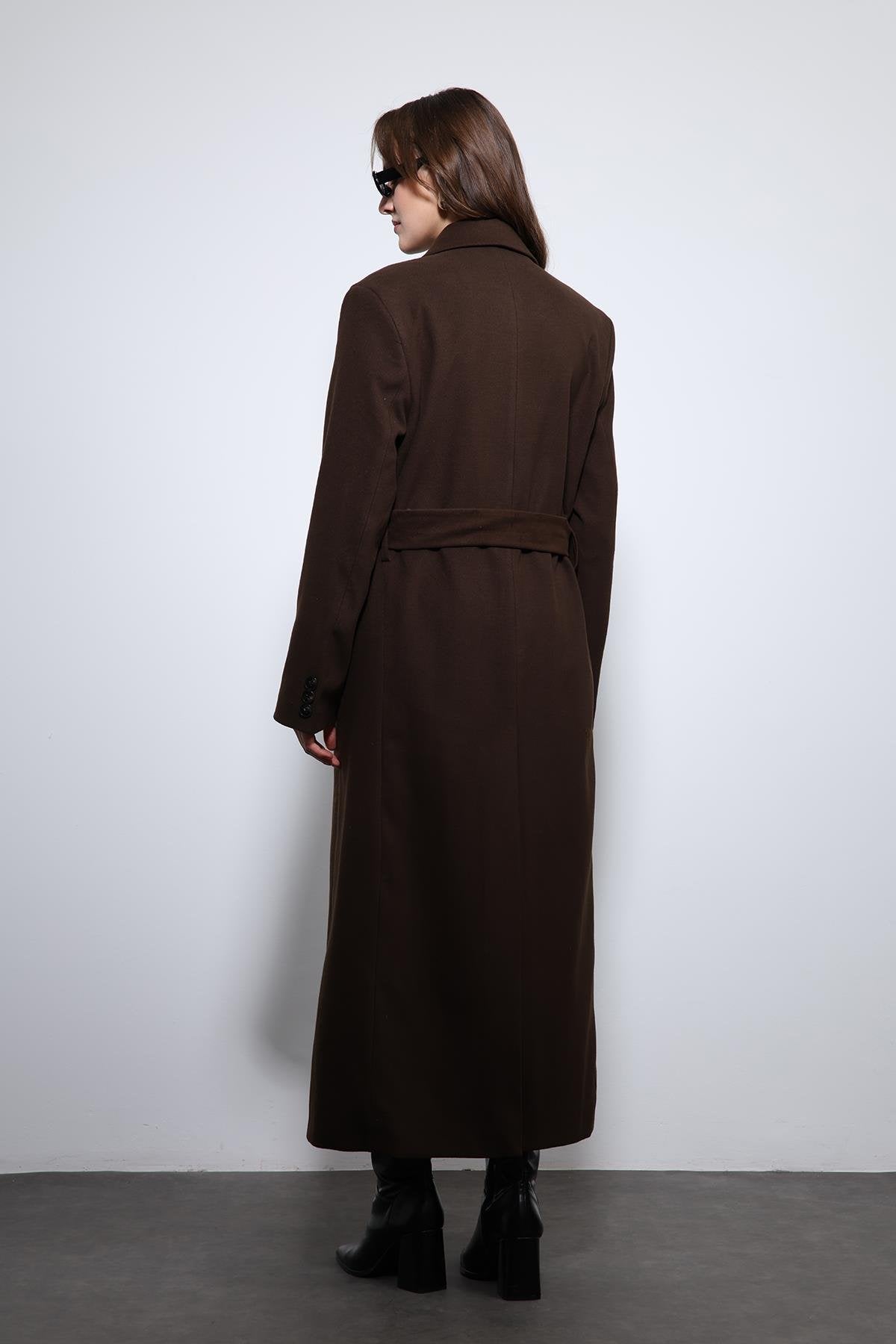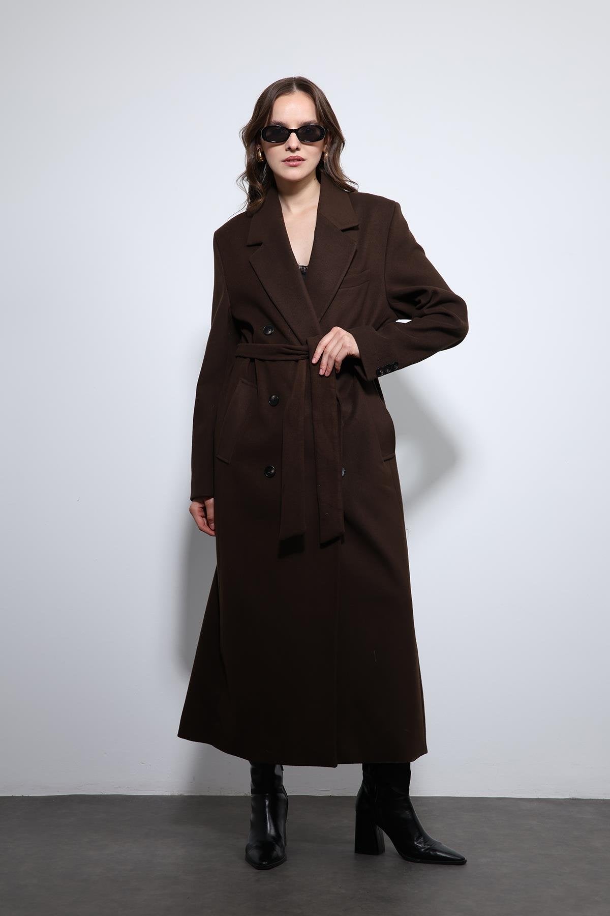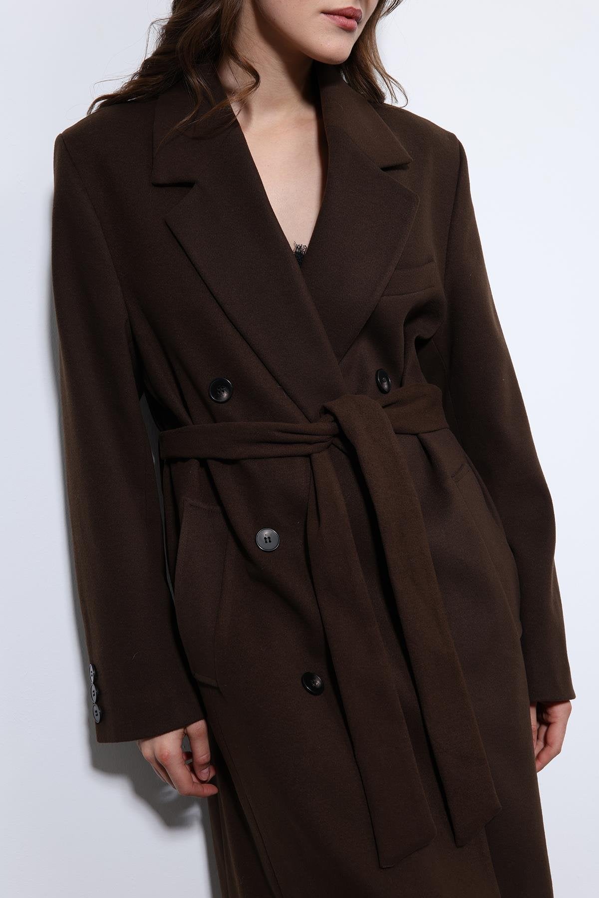 Kahve Kadın Kuşaklı Kruvaze Kaban