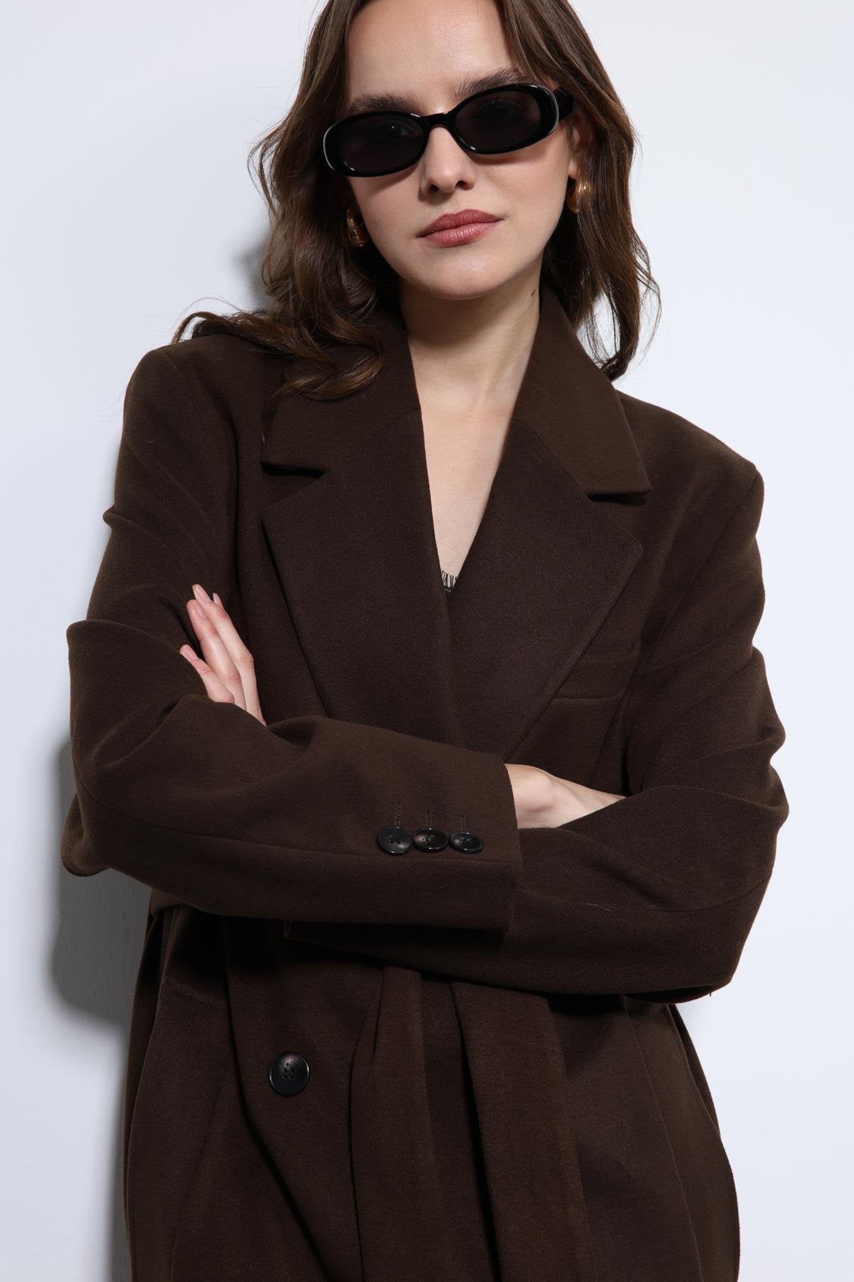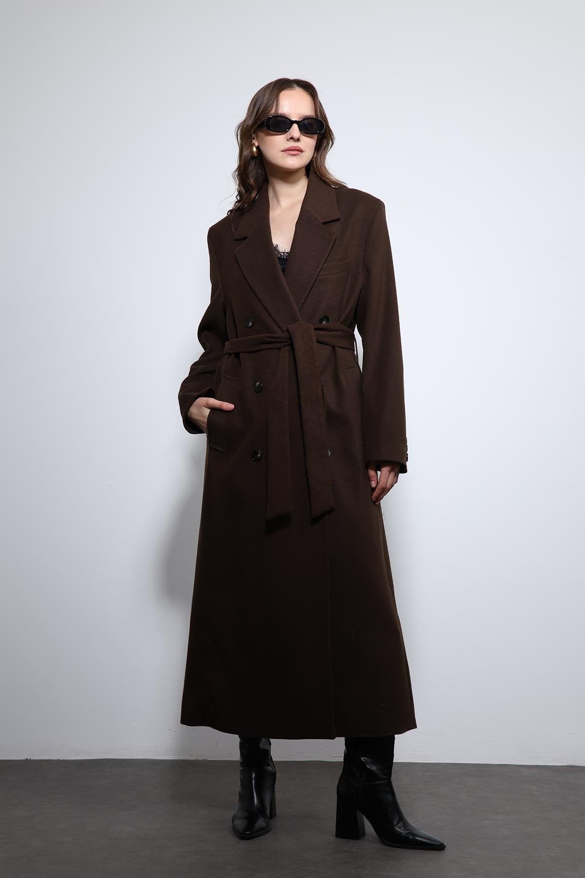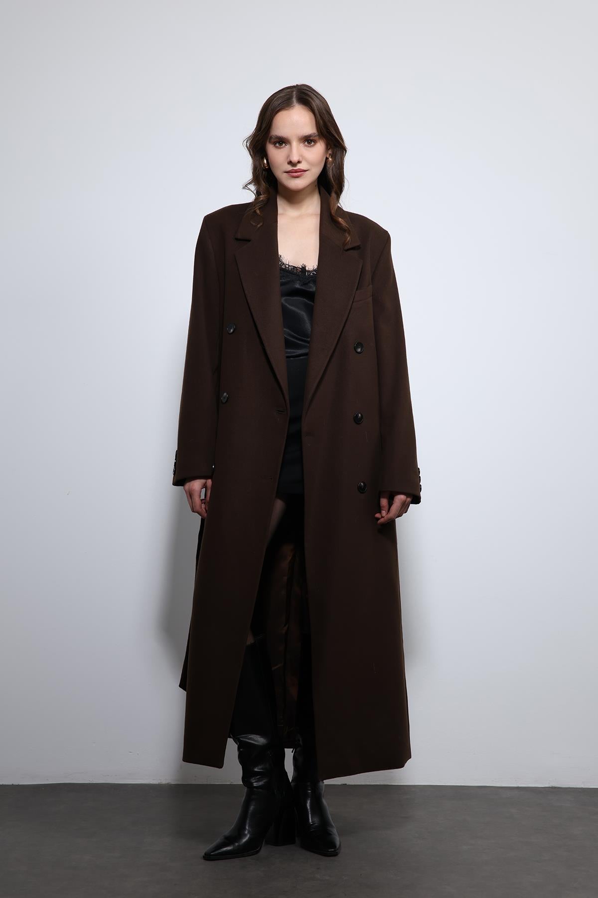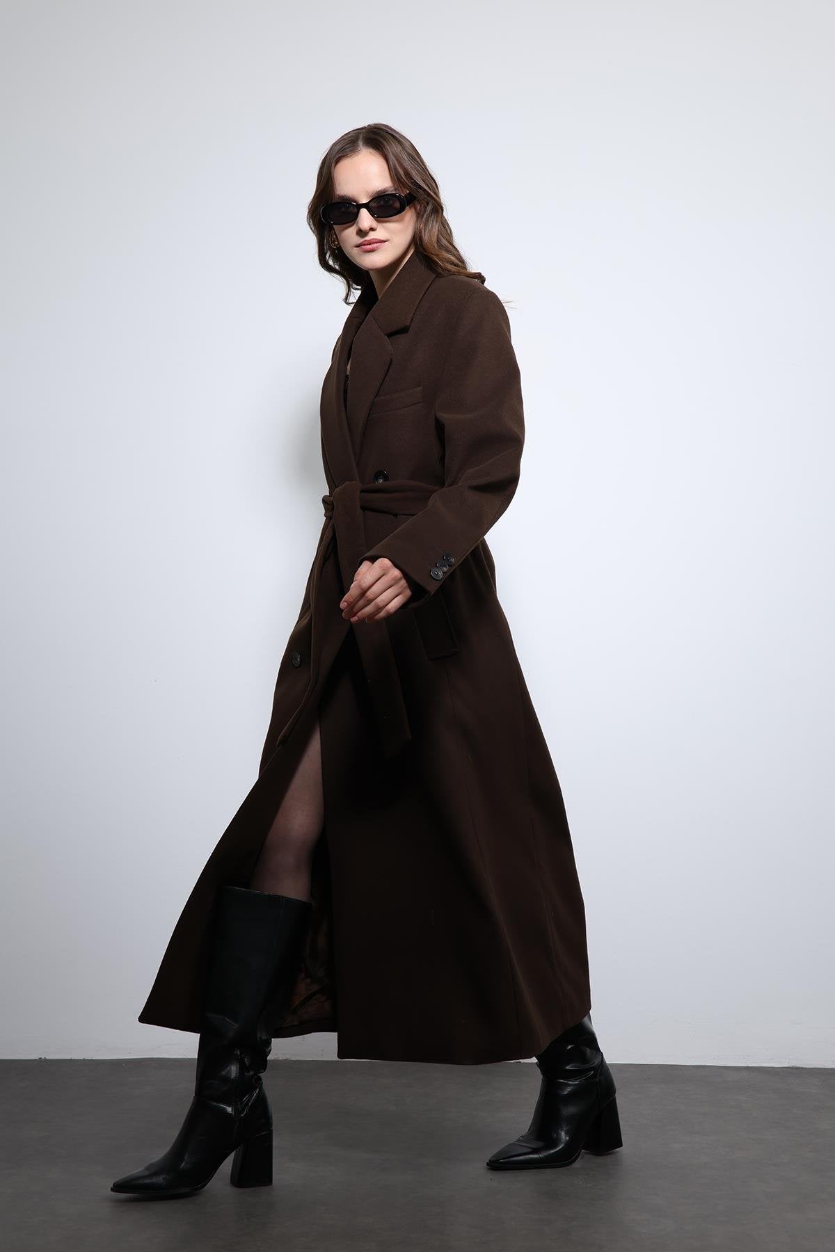 Kahve Kadın Kuşaklı Kruvaze Kaban