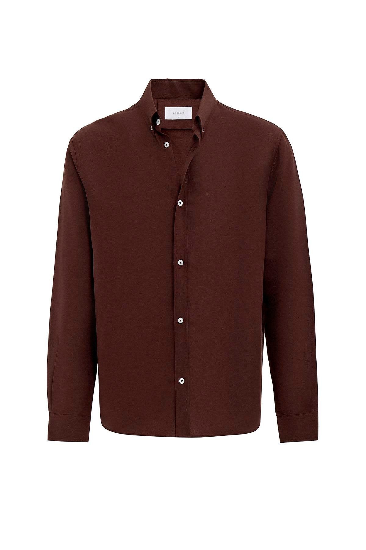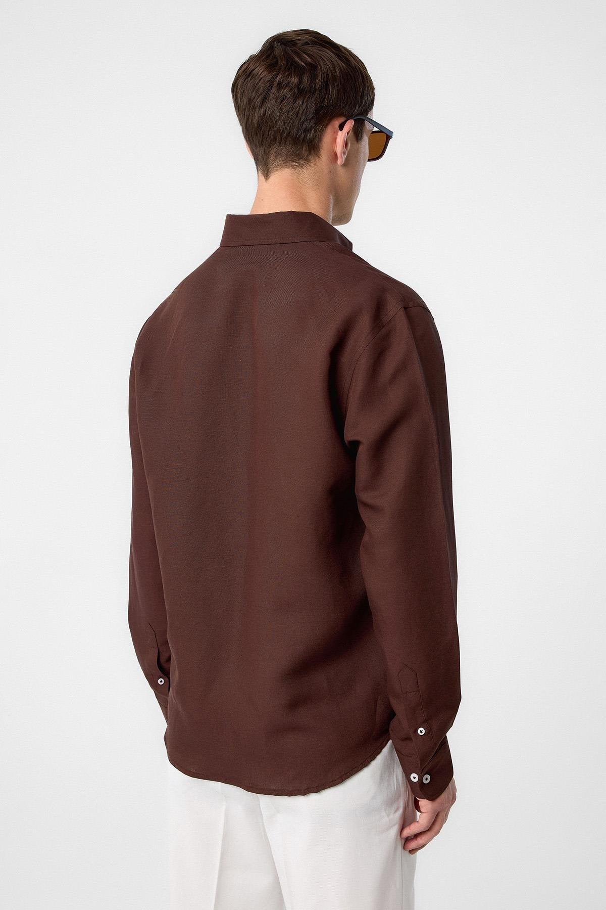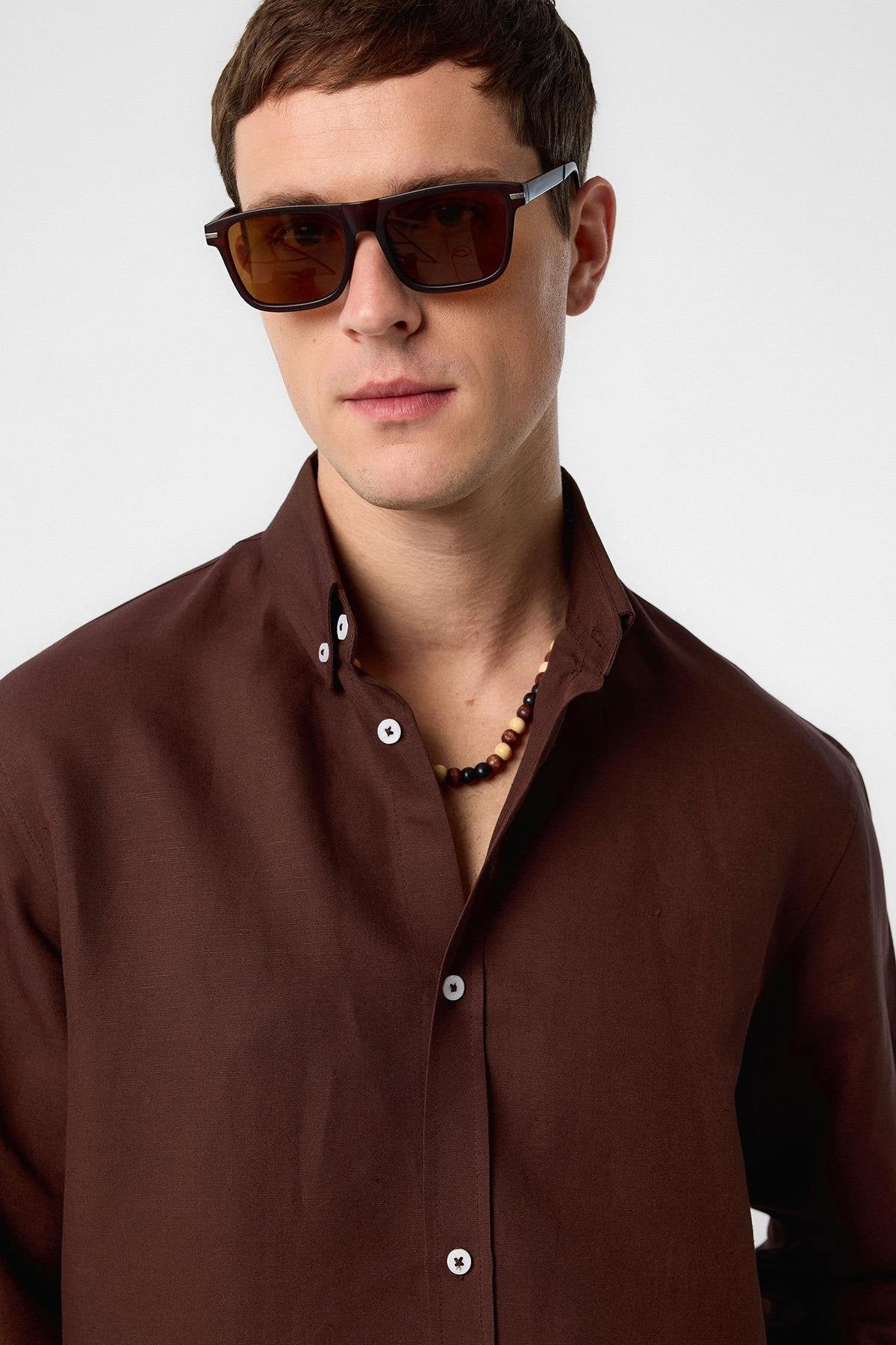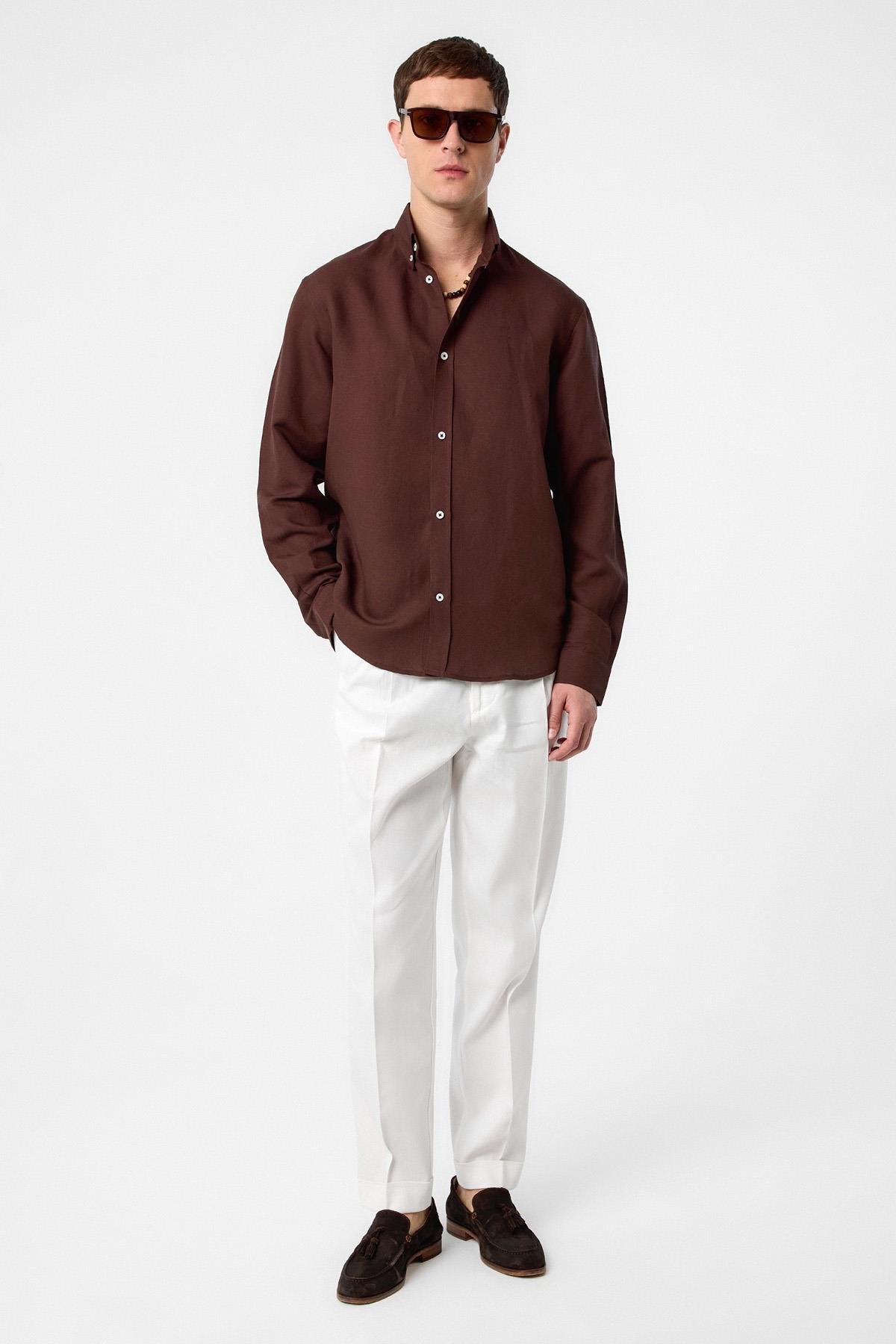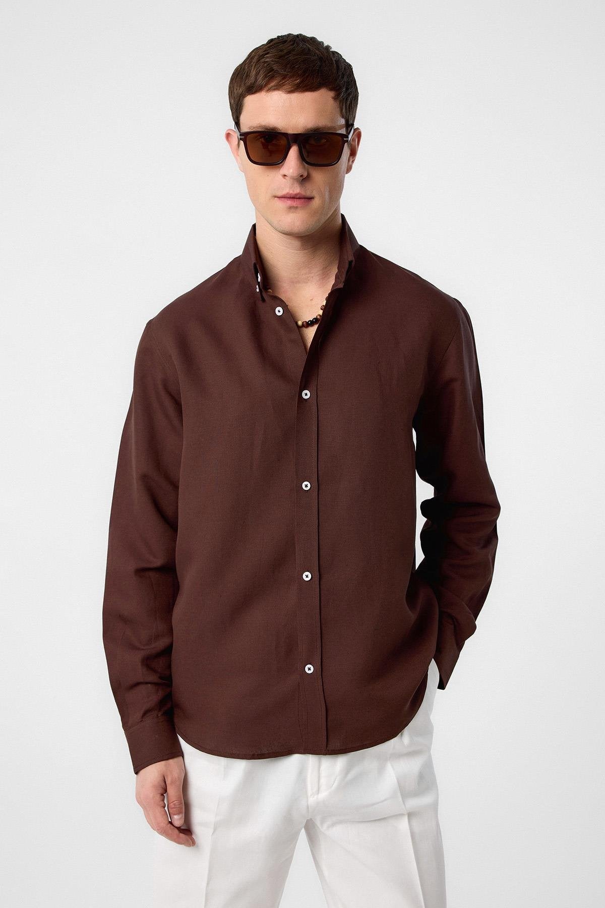 Kahve Keten Karışımlı Yaka Düğmeli Erkek Gömlek