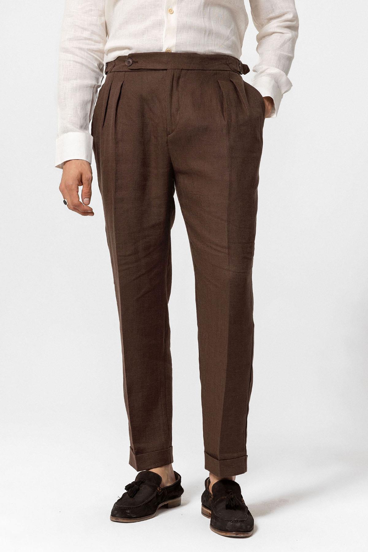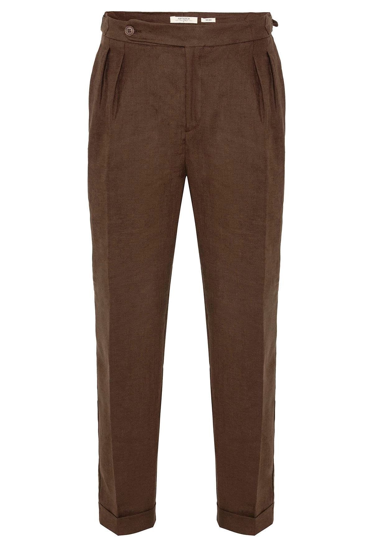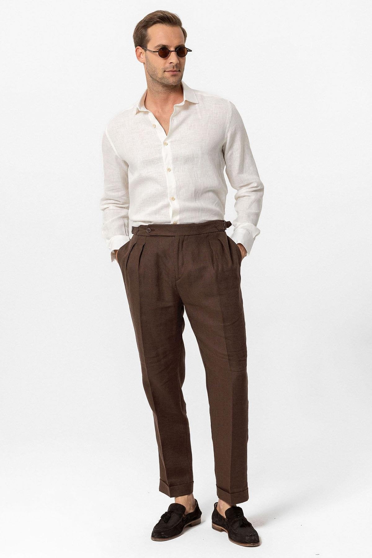Kahve Yüksek Bel %100 Keten Pileli Erkek Pantolon