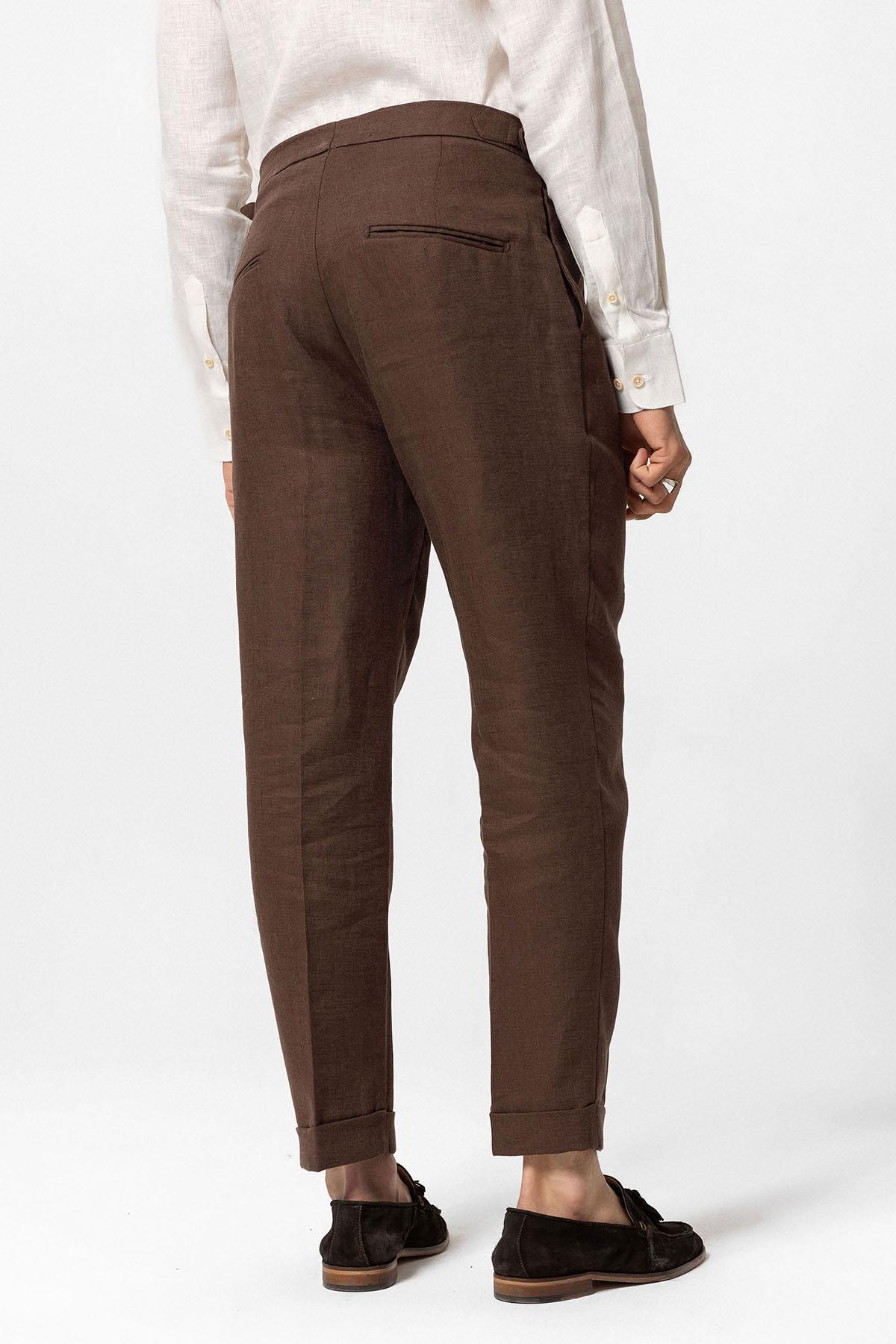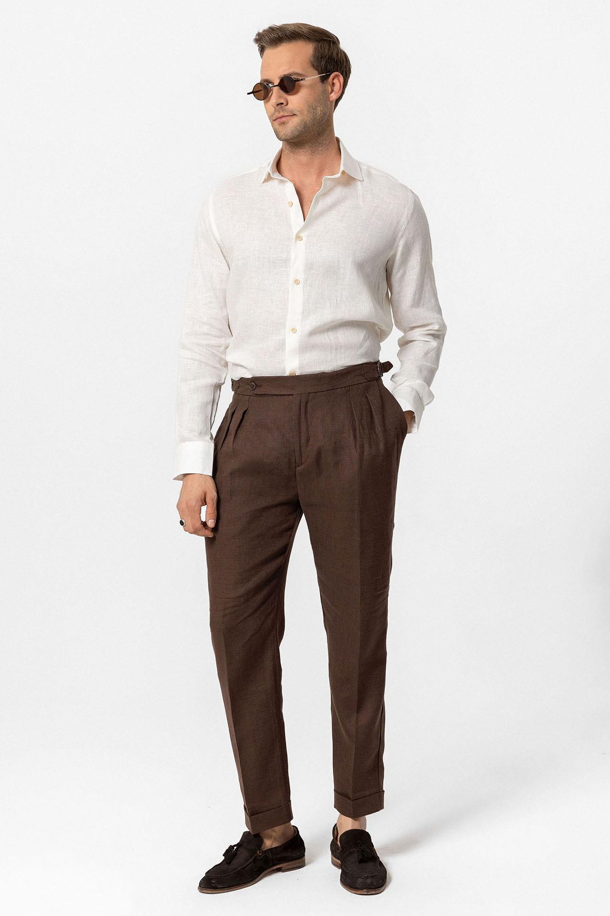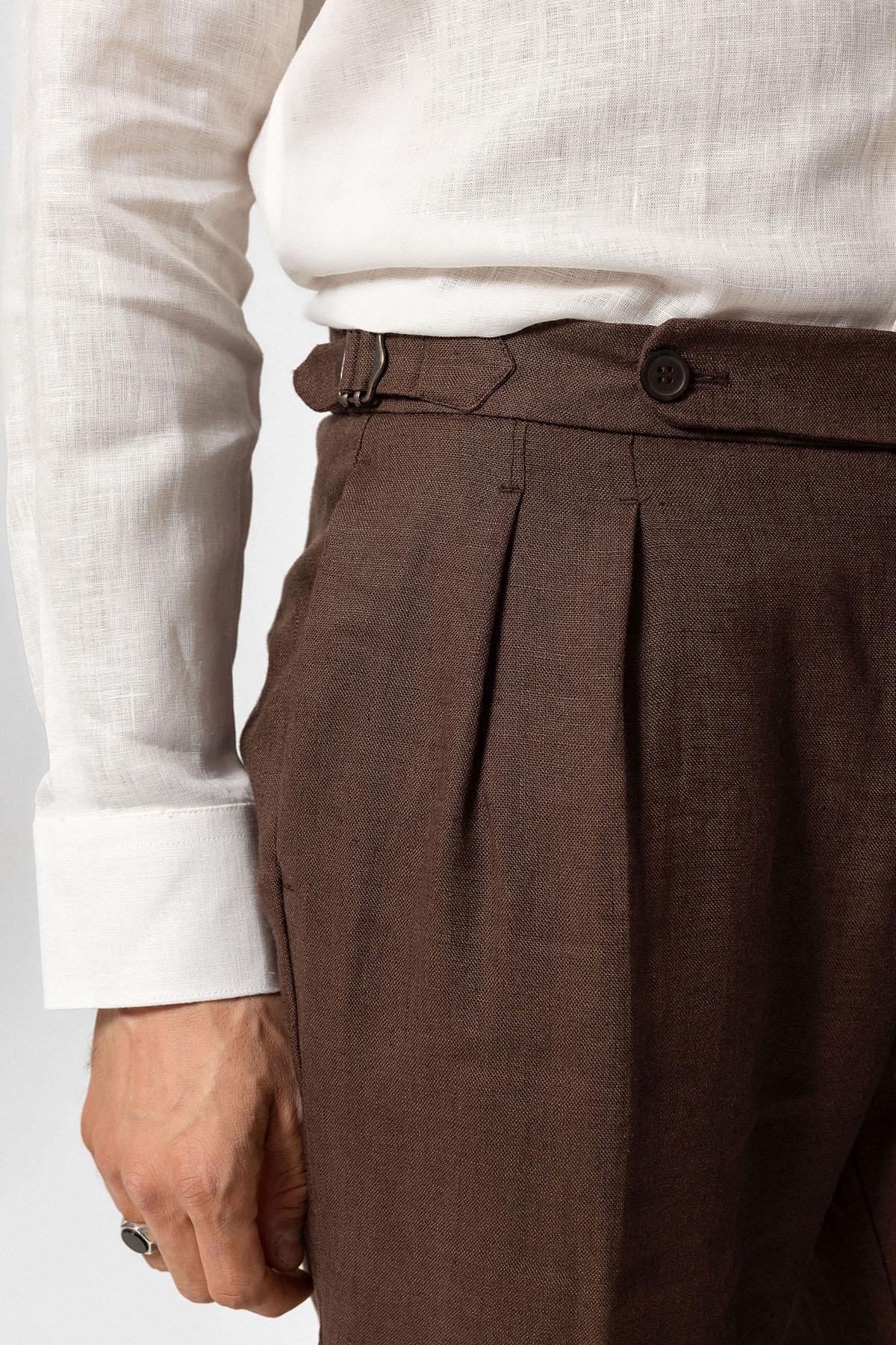 Kahve Yüksek Bel %100 Keten Pileli Erkek Pantolon