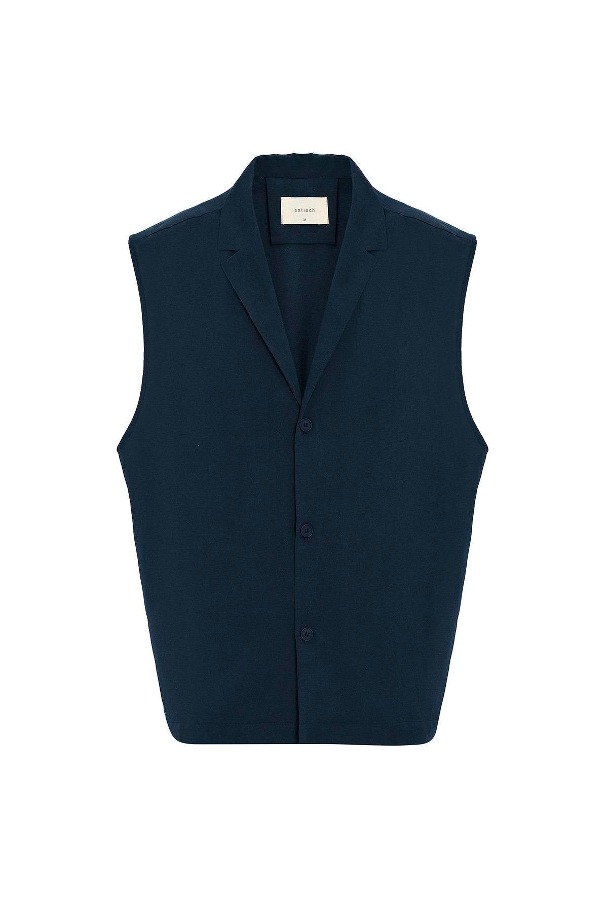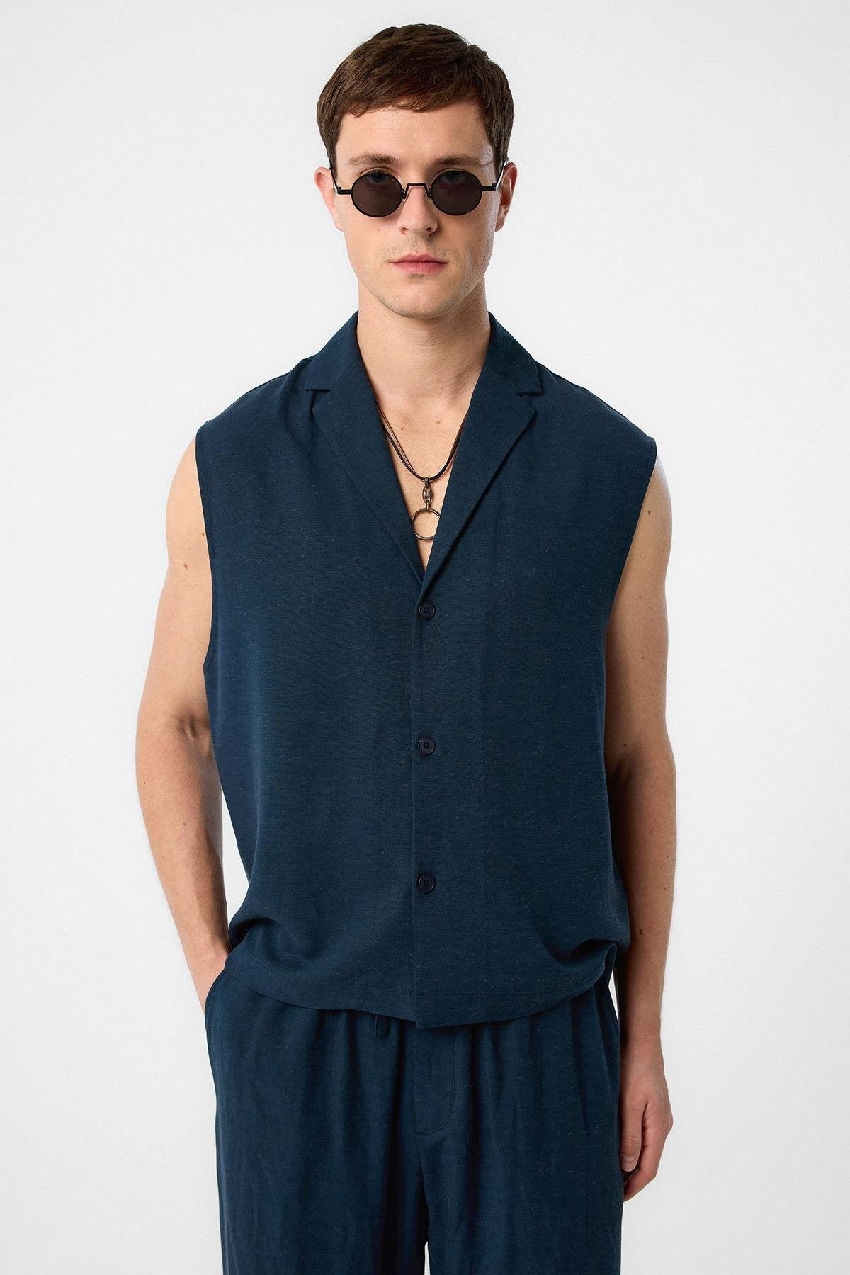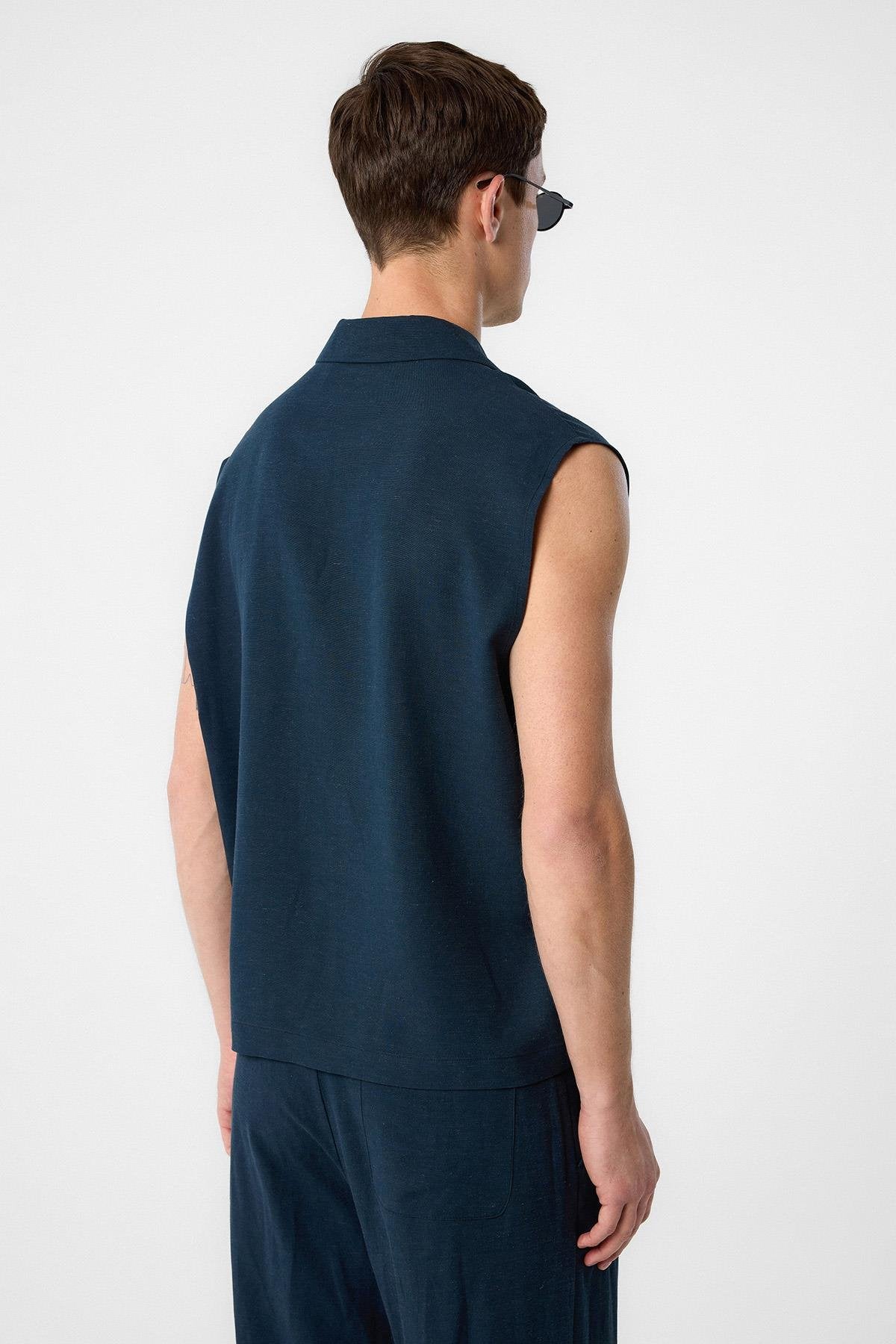 Lacivert Keten Karışımlı Kolsuz Erkek Gömlek