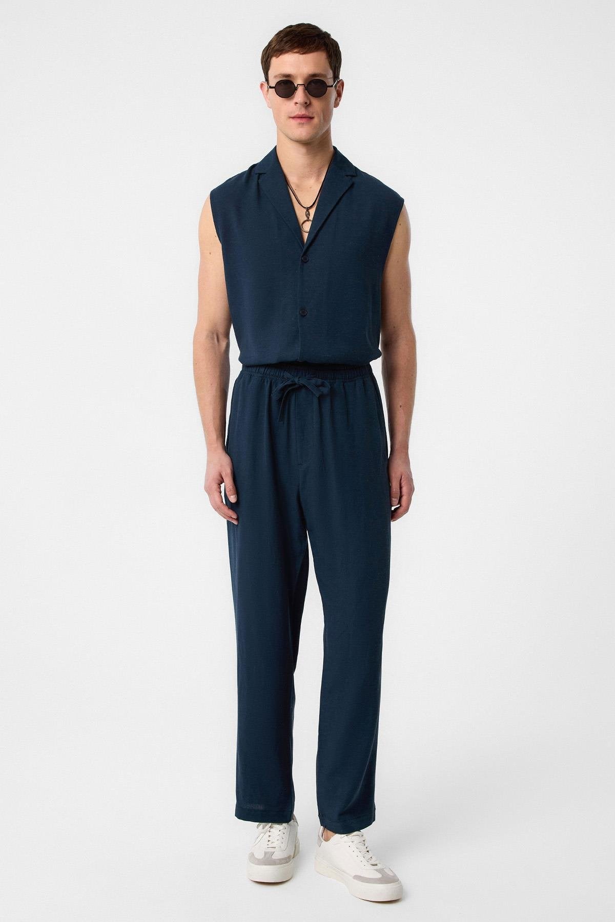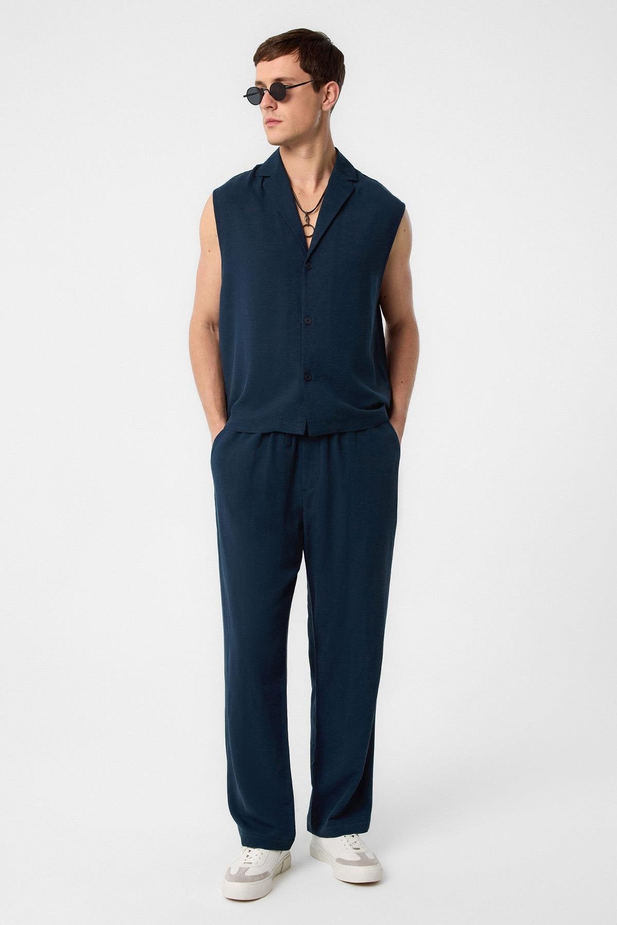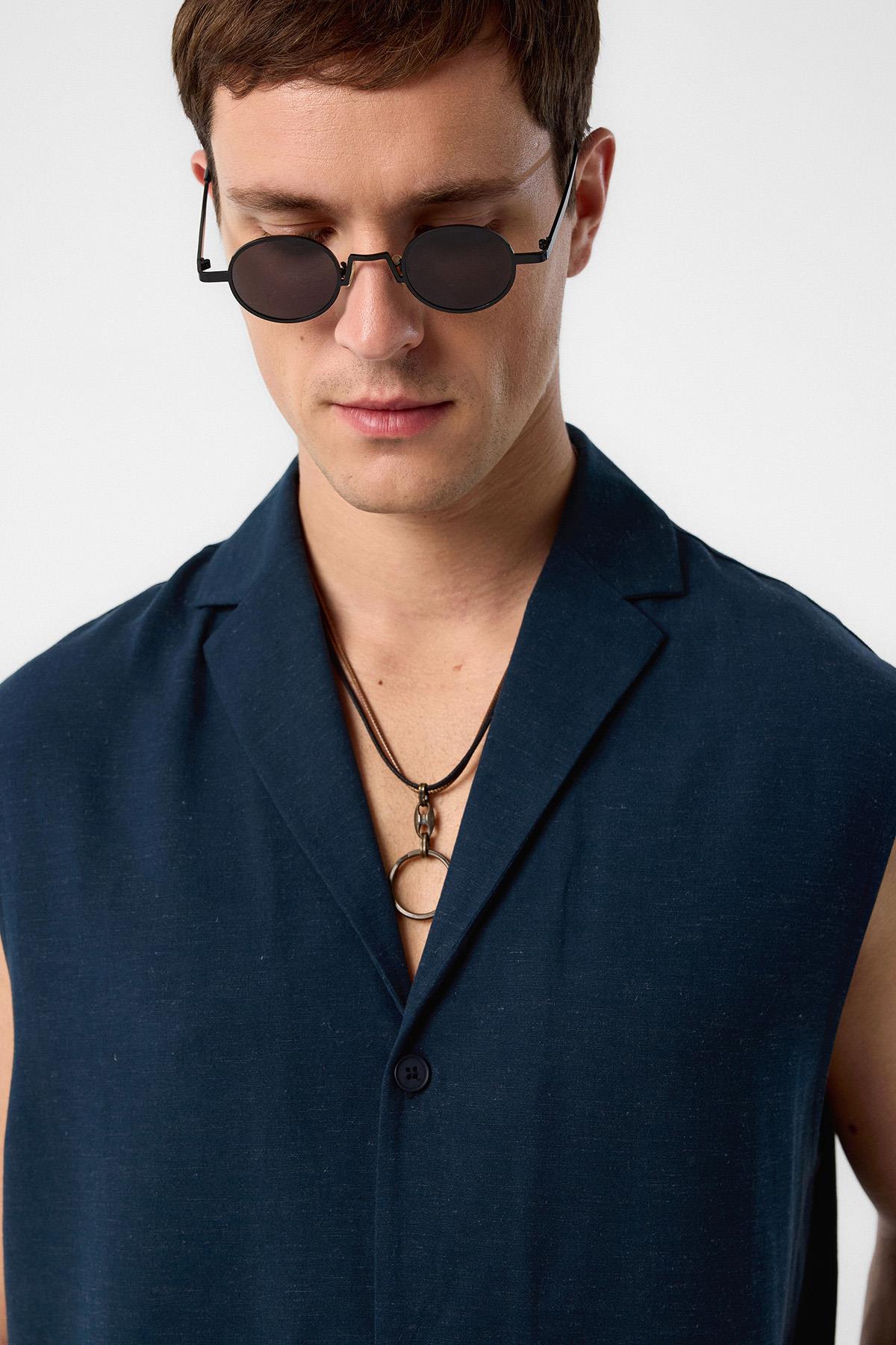 Lacivert Keten Karışımlı Kolsuz Erkek Gömlek