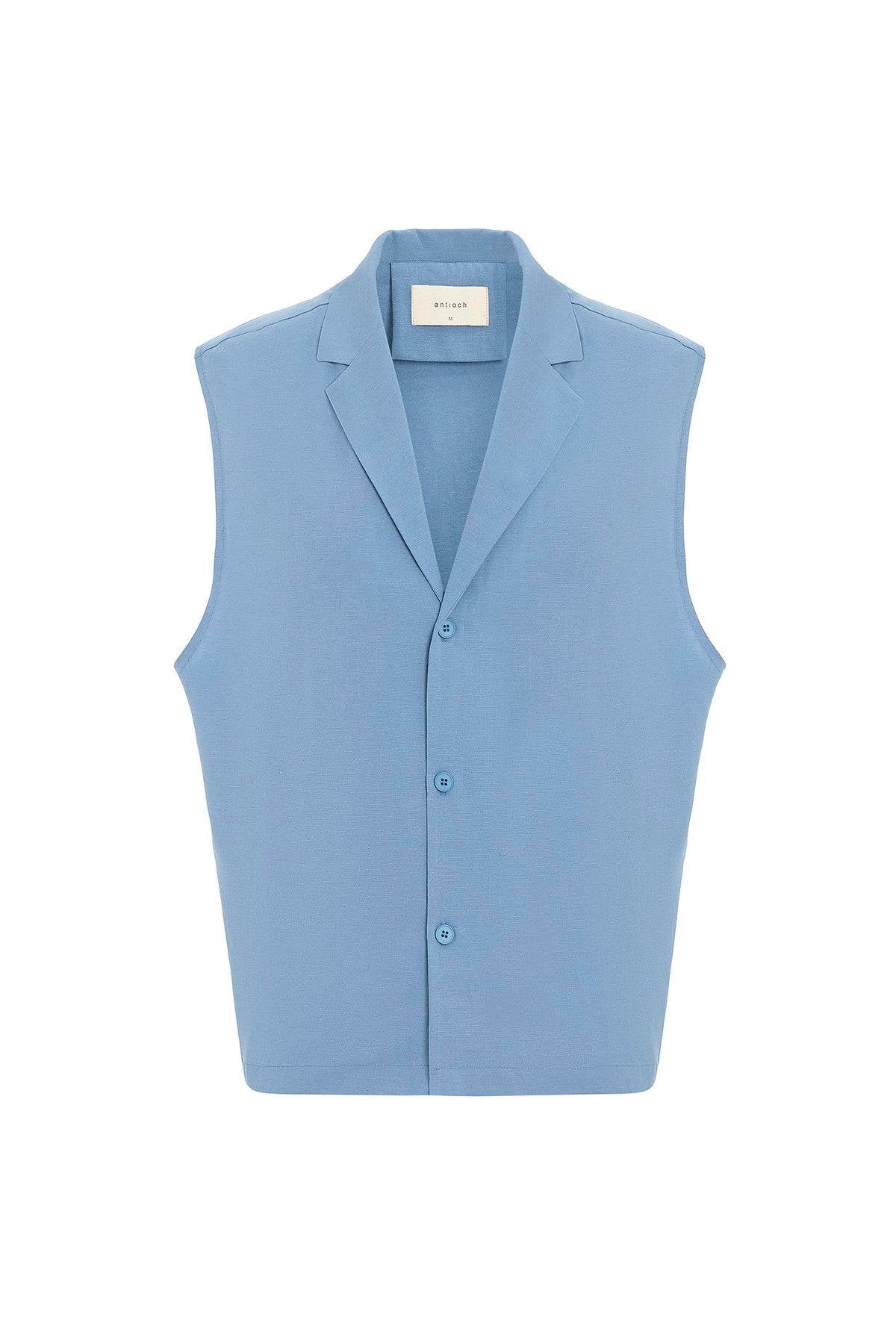 Mavi Keten Karışımlı Kolsuz Erkek Gömlek