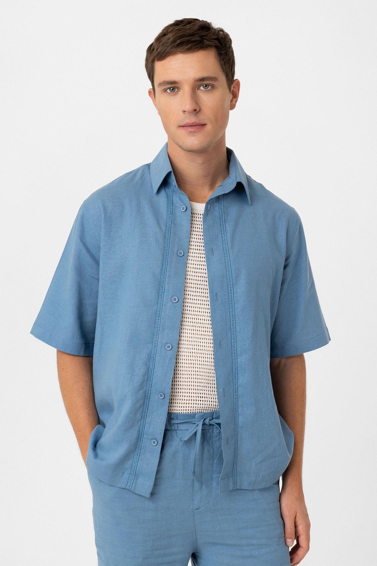 Mavi Keten Karışımlı Relaxed Erkek Gömlek
