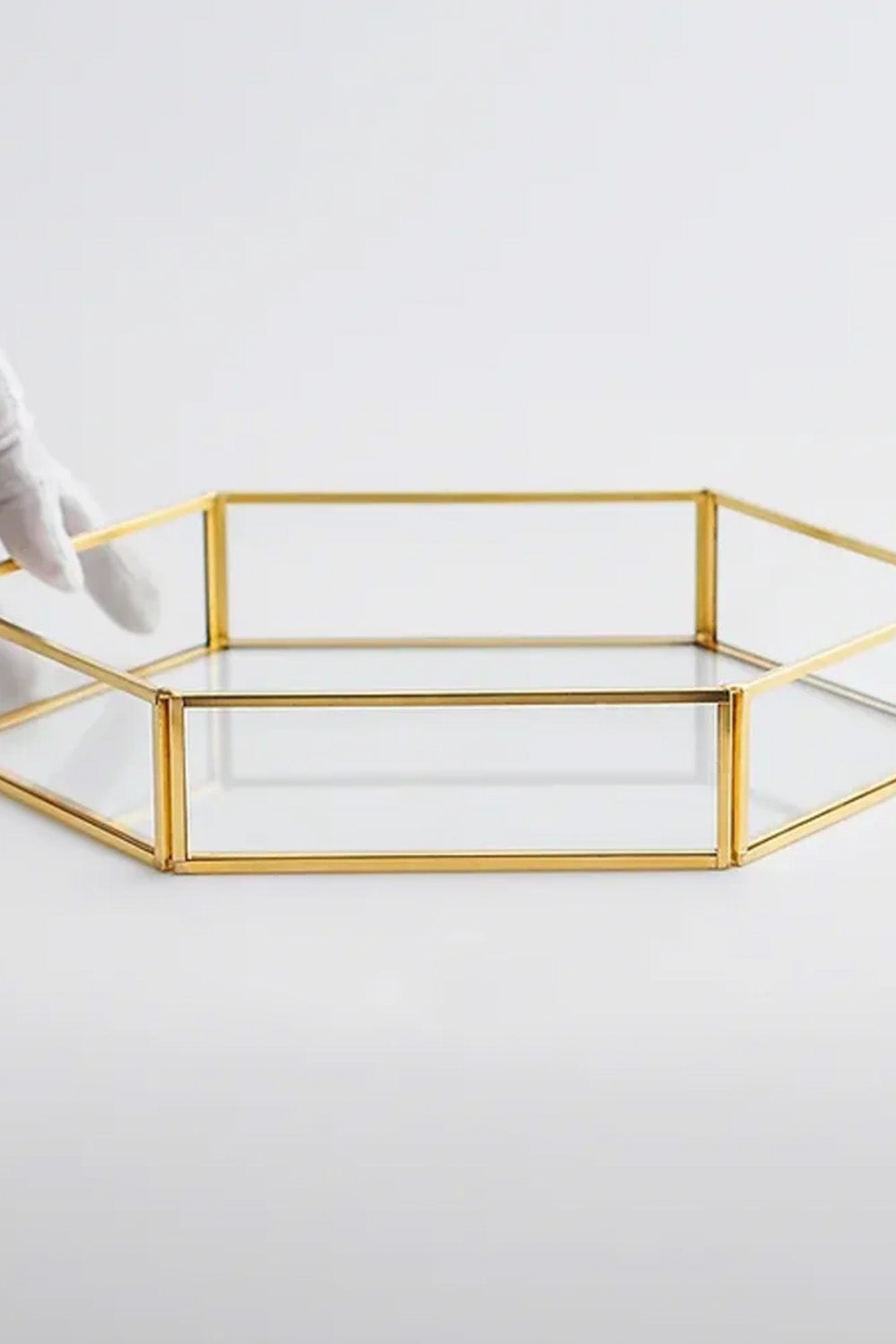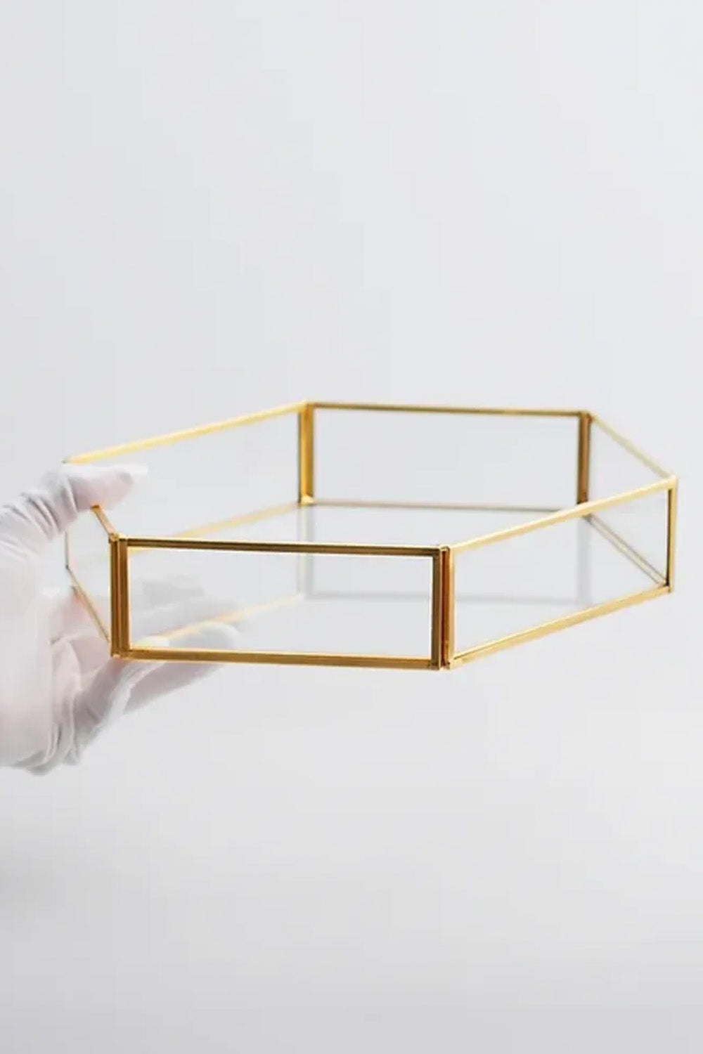 Altıgen Pirinç Gold Tepsi Damat Kahvesi Nişan Sunum Tepsisi 30x20x5cm