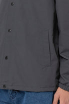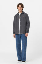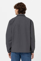 La chaqueta Dickies Oakport gris carbón presenta un estilo de chaqueta de entrenador atemporal con un cuello de camisa deportivo y un frente con botones a presión para una apariencia clásica.