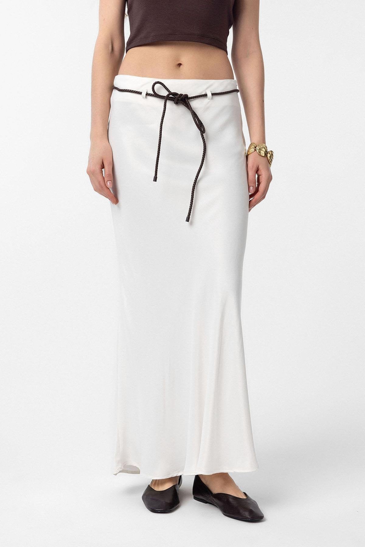 Ekru Kemerli Saten Uzun Kadın Etek