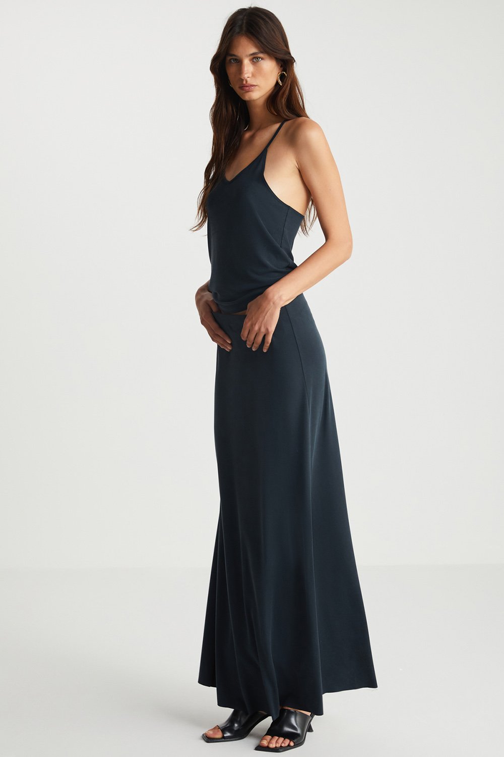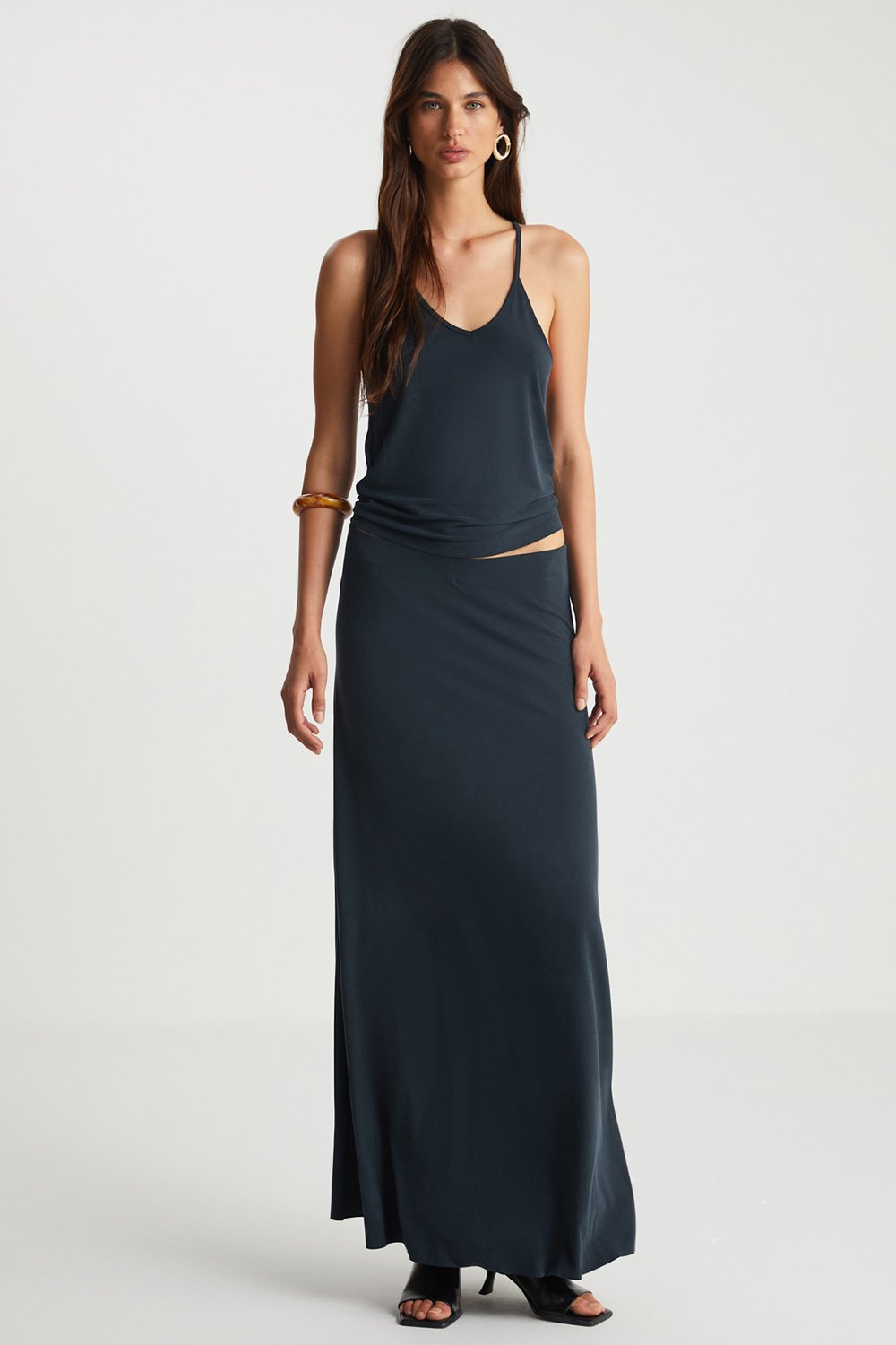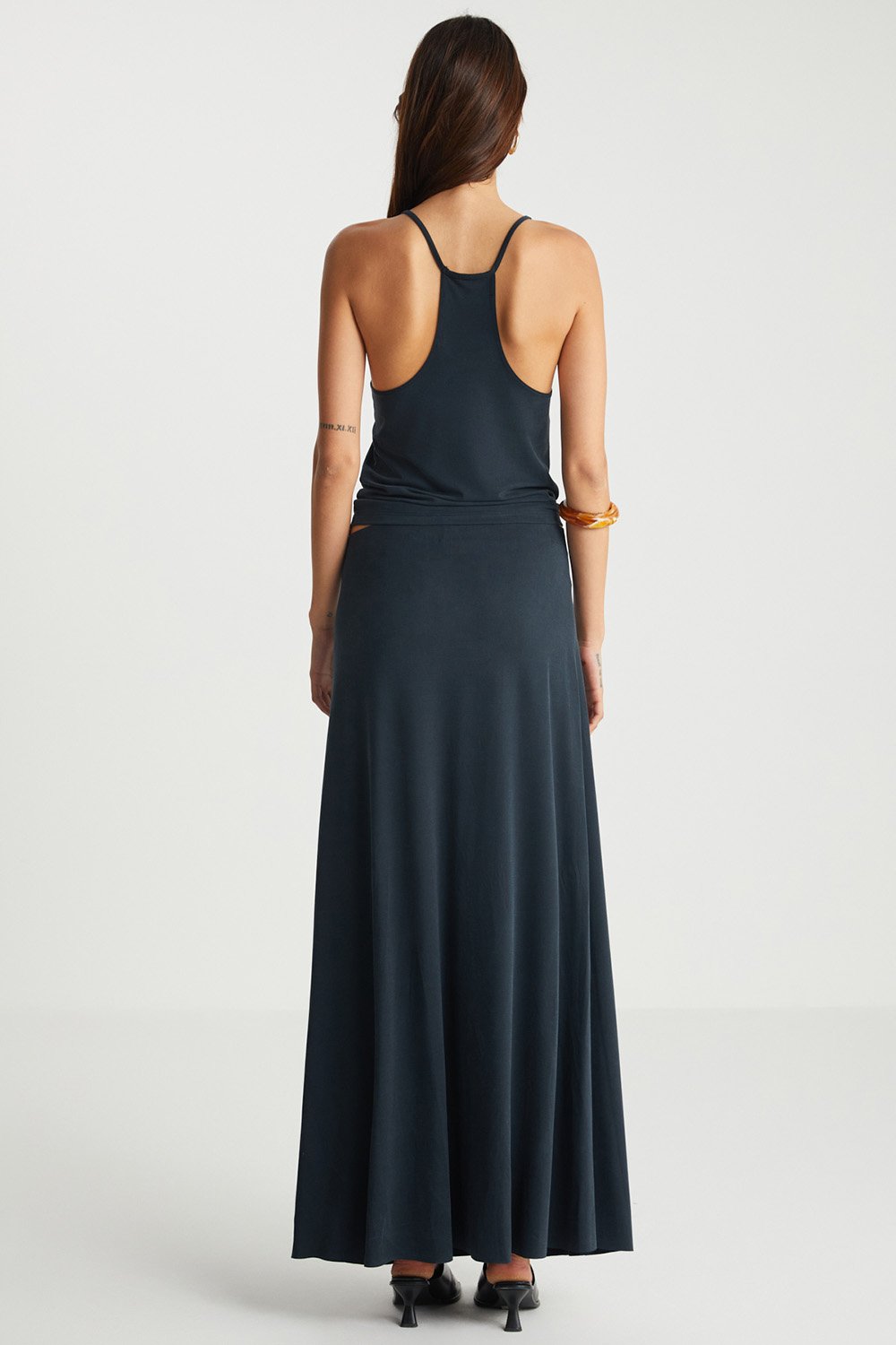 Siyah uzun etek yaz aylarında askılı tişört ve büstiyer altında giyilecek vazgeçilmez bir klasik. Kombinleriniz için şık ve rahat bir görünüm kazandıran bu tasarım özellikle yaz akşamları için harika bir seçenek haline geliyor.