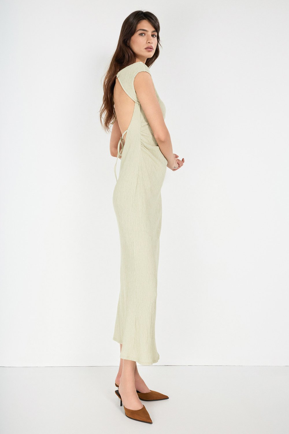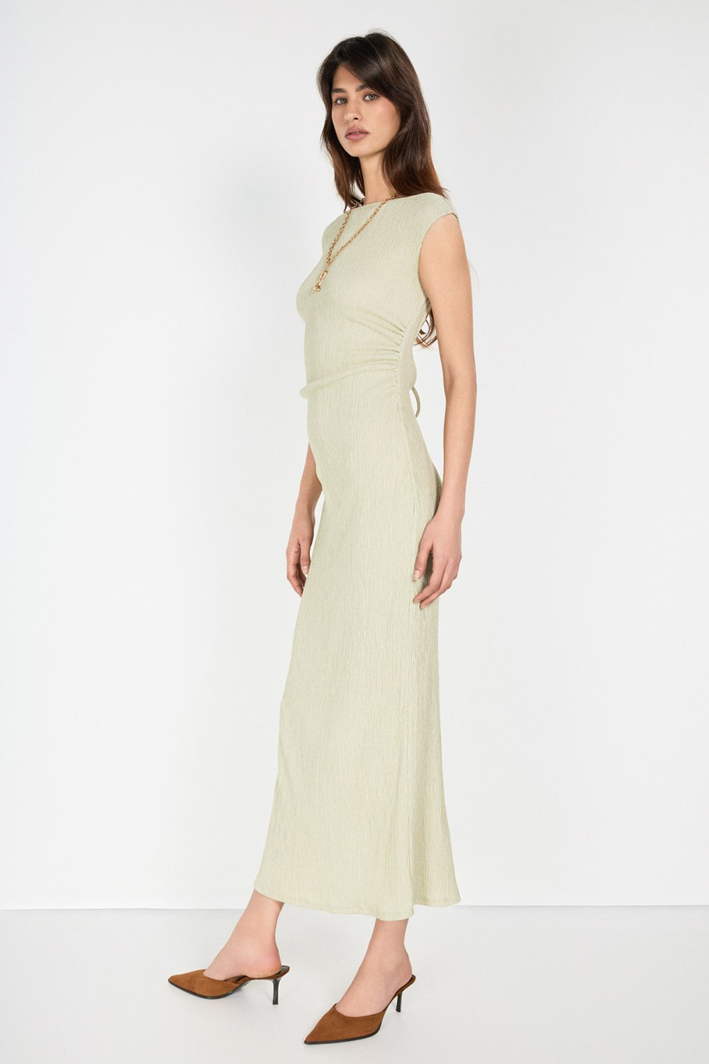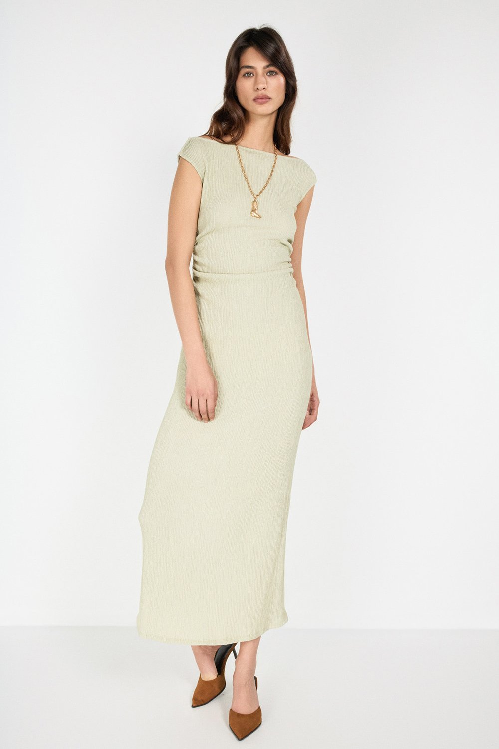 Mint yeşili ve tarçın tonlarındaki tek parça elbise bürümcük kumaş dokusu ile görünümü boyutlandırırken yan büzgü detayları ve sırt dekoltesi ile günlük ve özel buluşmalar için kullanım seçenekleri oluşturuyor.