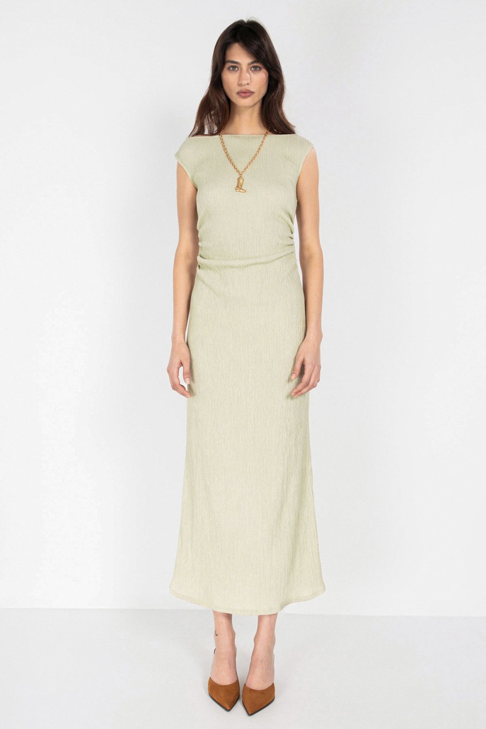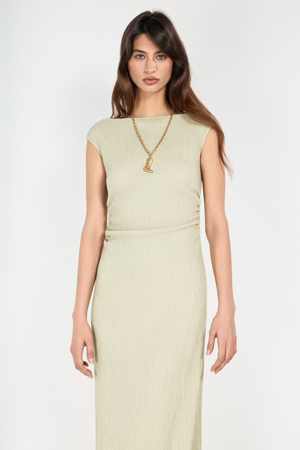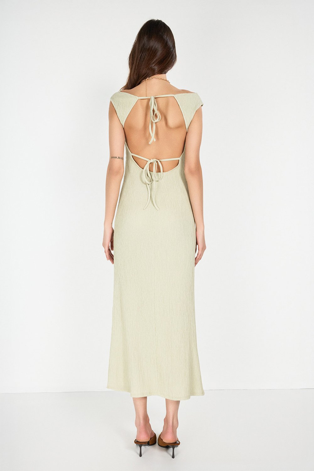 Mint yeşili ve tarçın tonlarındaki tek parça elbise bürümcük kumaş dokusu ile görünümü boyutlandırırken yan büzgü detayları ve sırt dekoltesi ile günlük ve özel buluşmalar için kullanım seçenekleri oluşturuyor.