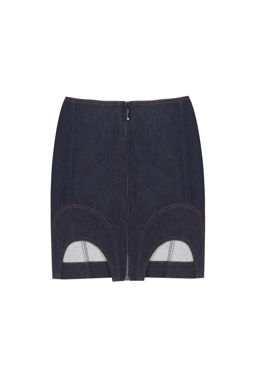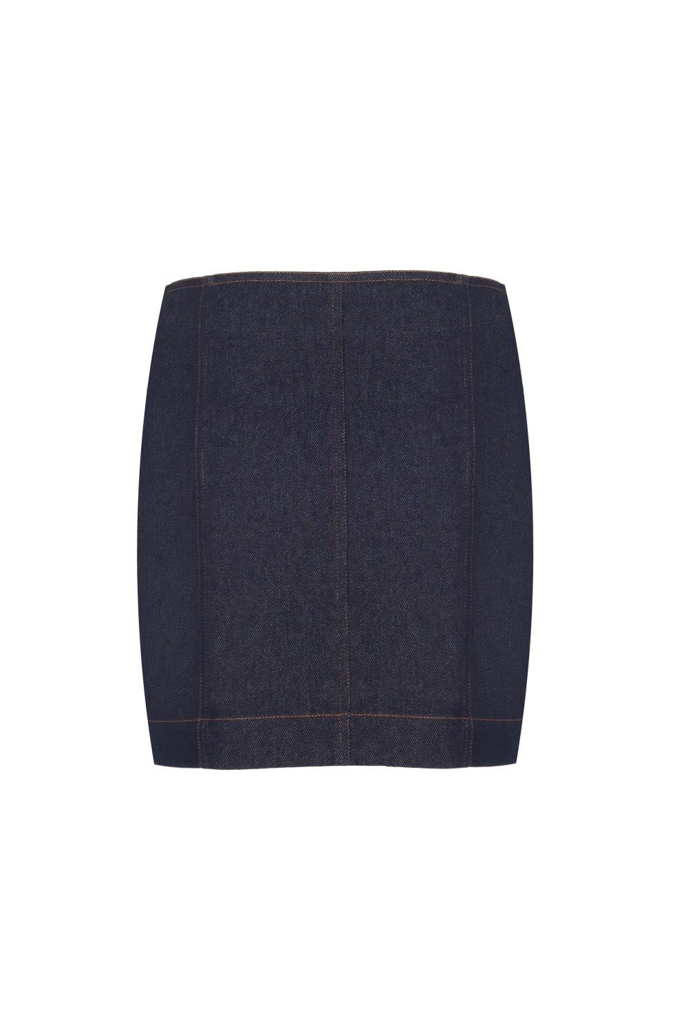 Önü fermuarlı, likralı yıkamasız non-denim mini etek.