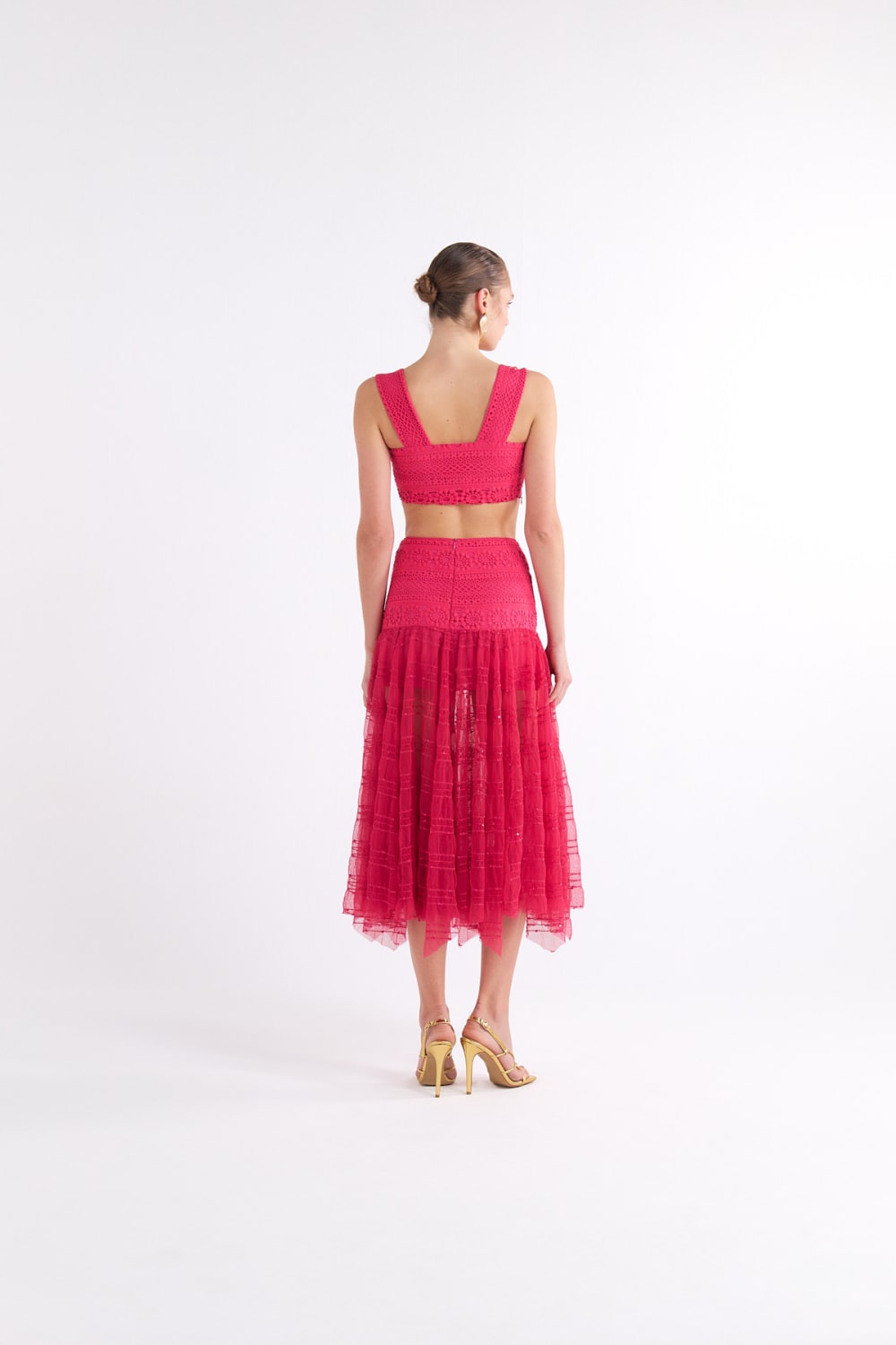 Üstte dantel doku ve altta şeffaf tül kumaşla tasarlanmıştır.