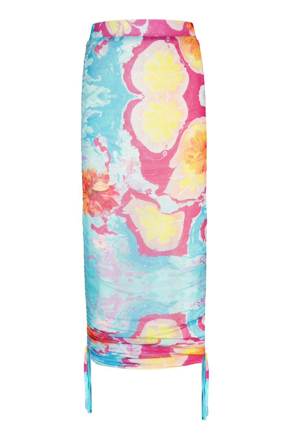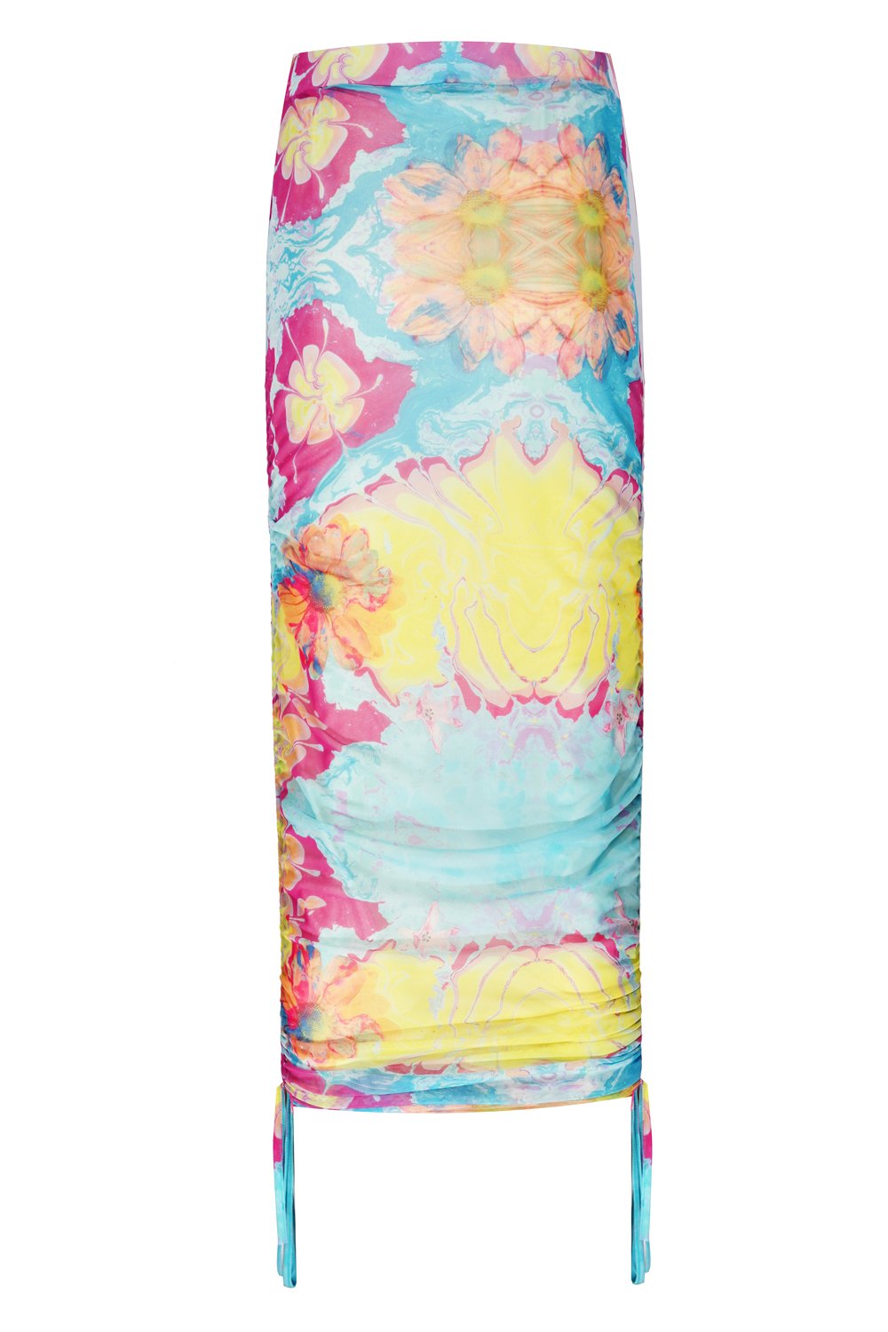 Yanları Büzgülü Baskılı Transparan Tül Midi Boy Etek
