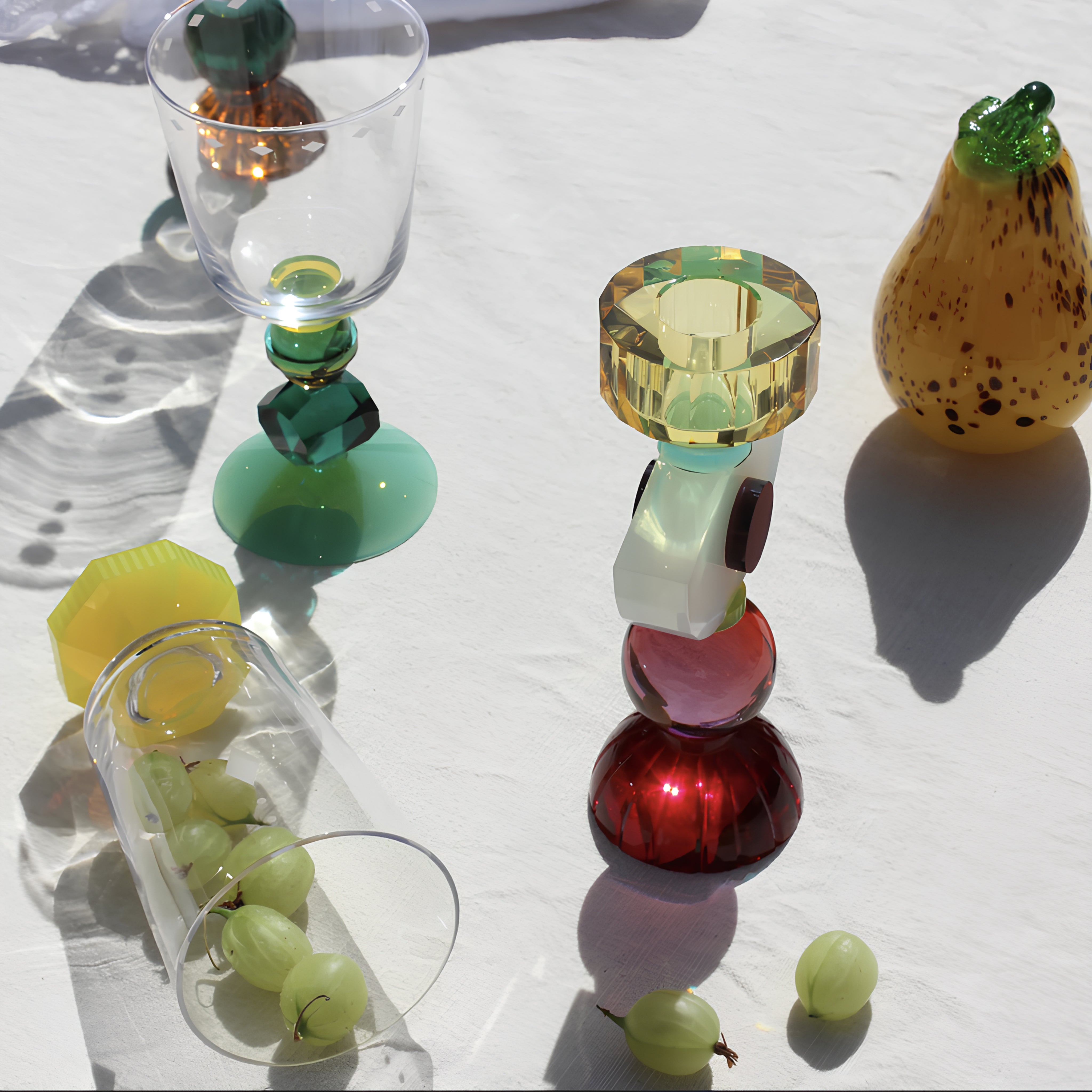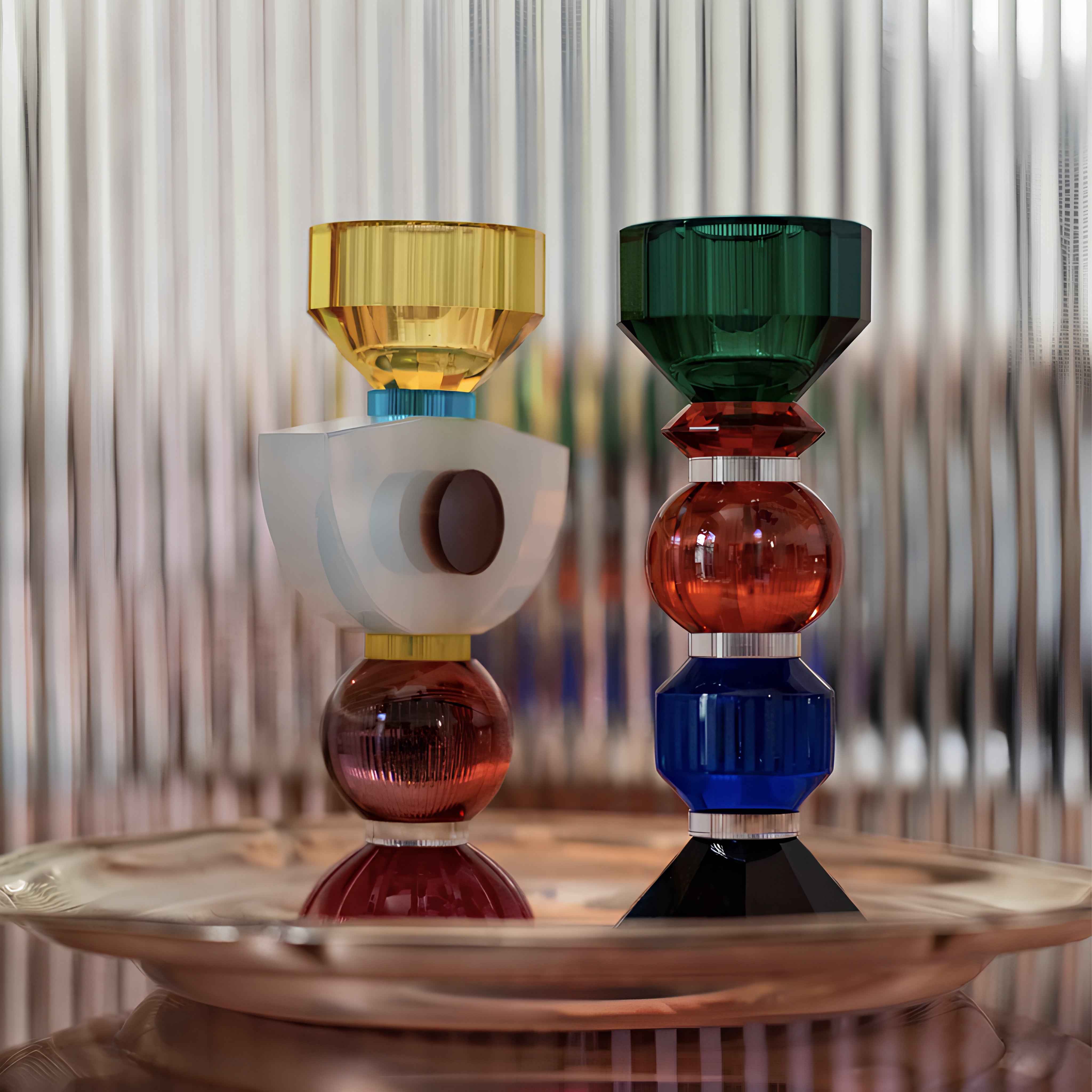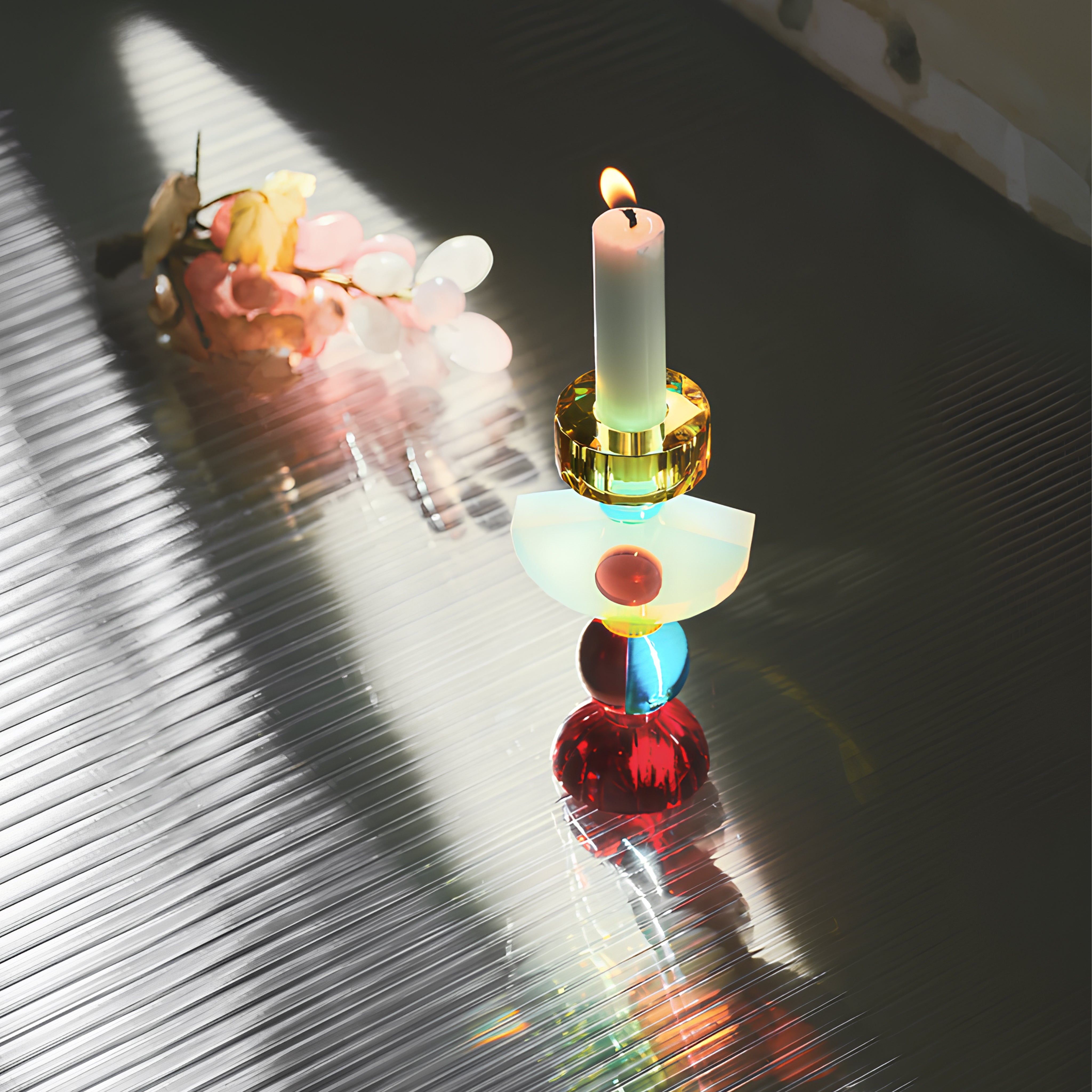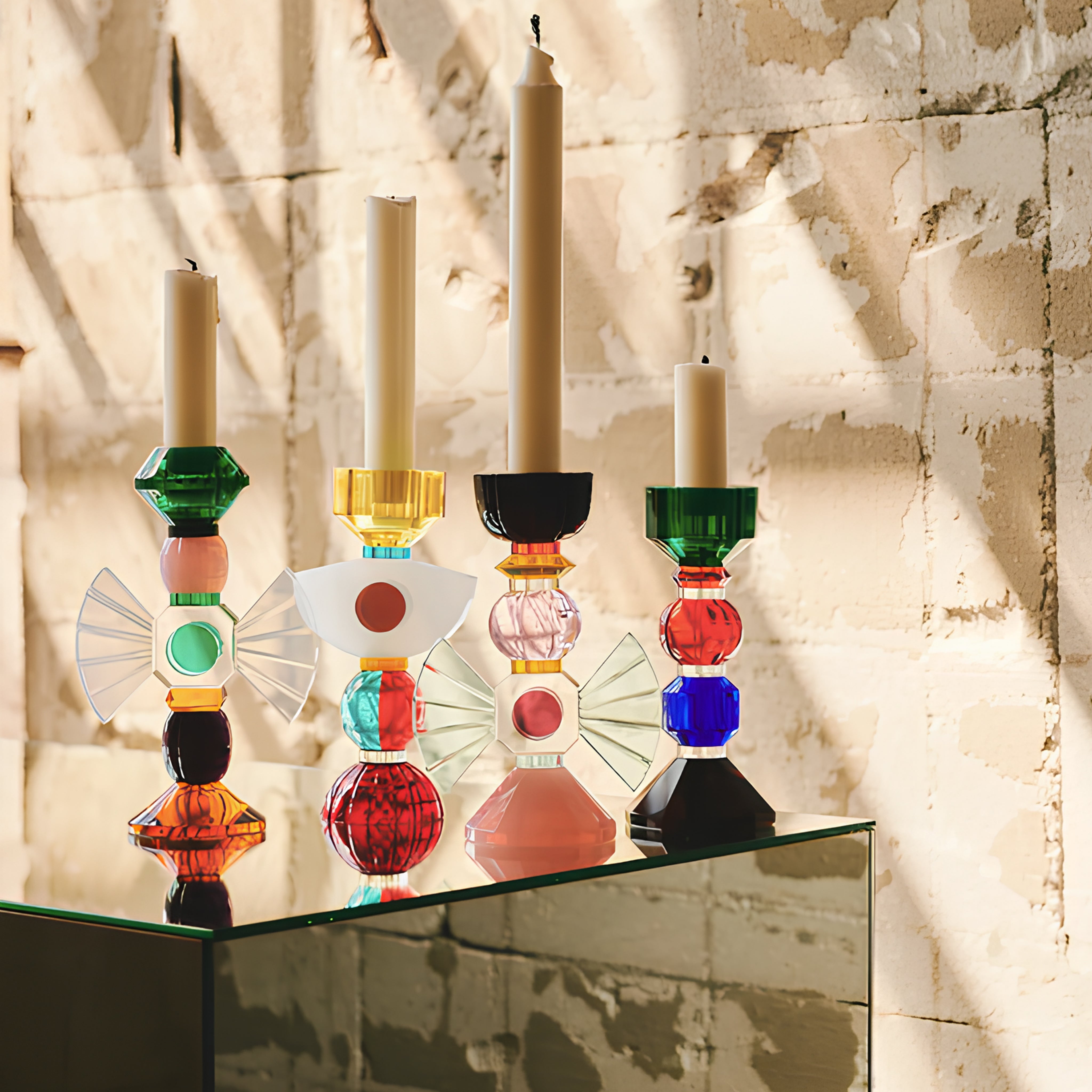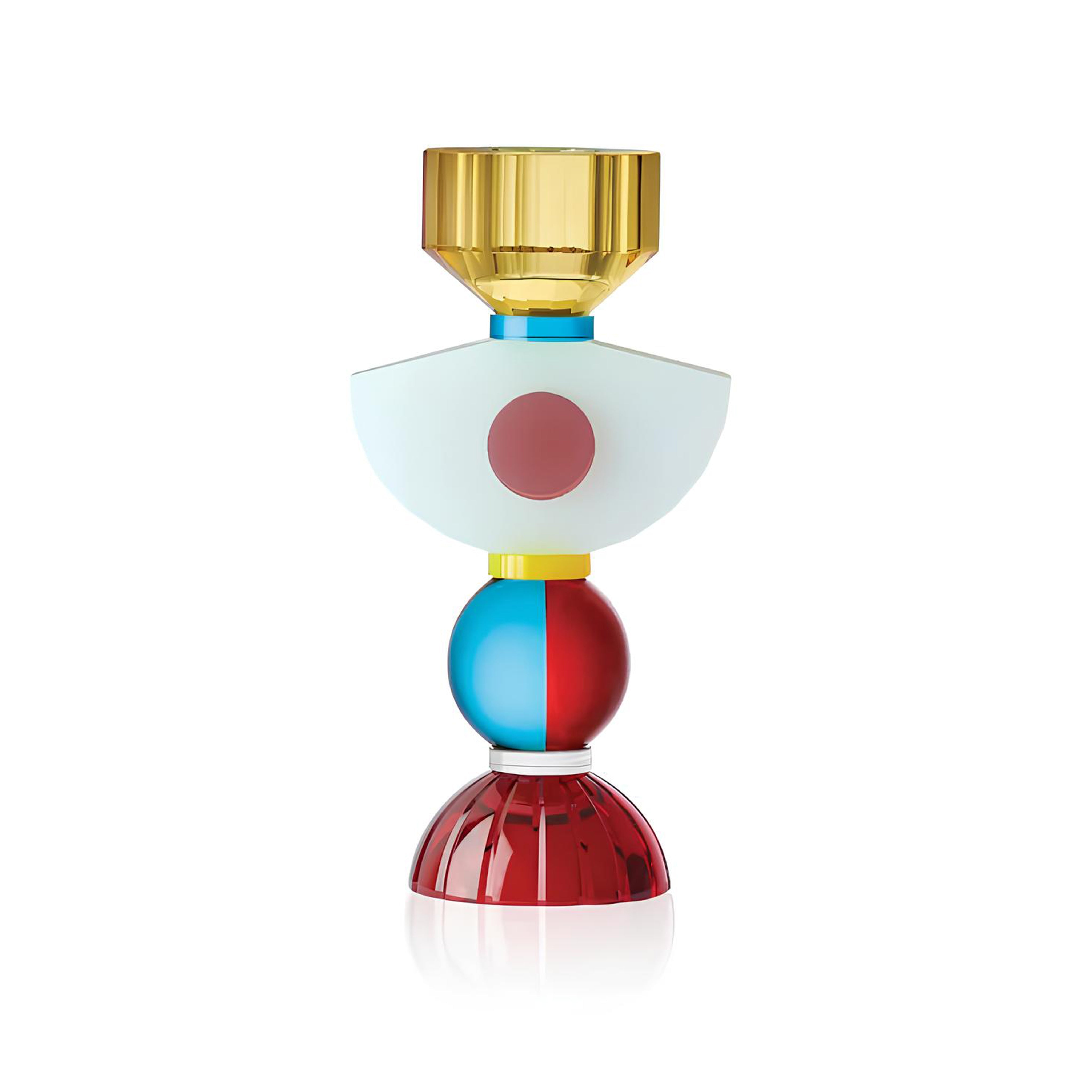Bu ilginç ve canlı mumluk, büyüleyici bir etki yaratmak amacıyla tasarlandı. Yakut kırmızısı kristal taban, üzerine yerleştirilmiş gök mavisi ve turuncu toplar, opal bir küre ile tamamlanmış ve amber rengi bir mumluk elemanıyla sonlandırılmış bu parça, tüm duyularınızı harekete geçirecek. Bu tasarım, ustaca işçilikle yaratılan bir kutlama niteliği taşıyor.