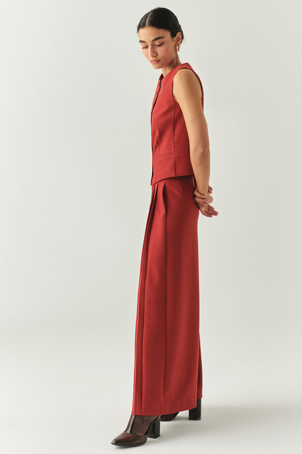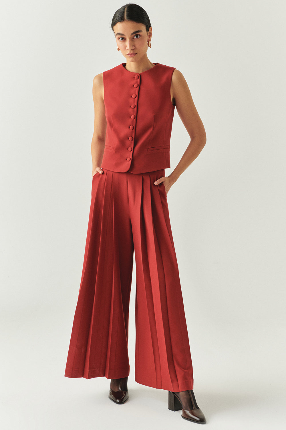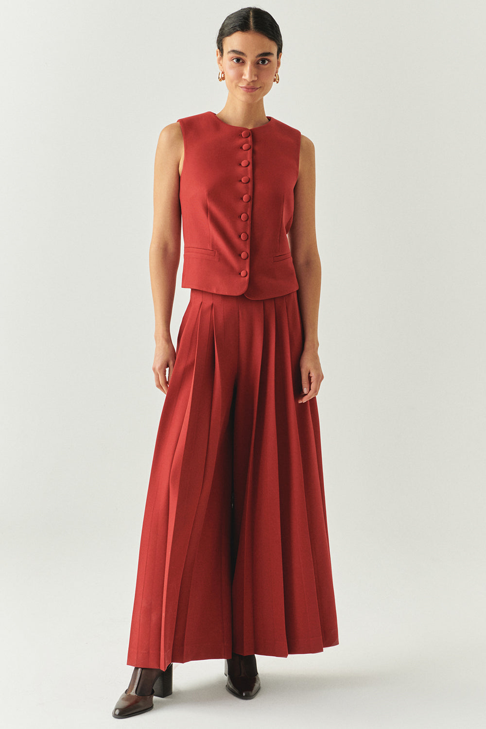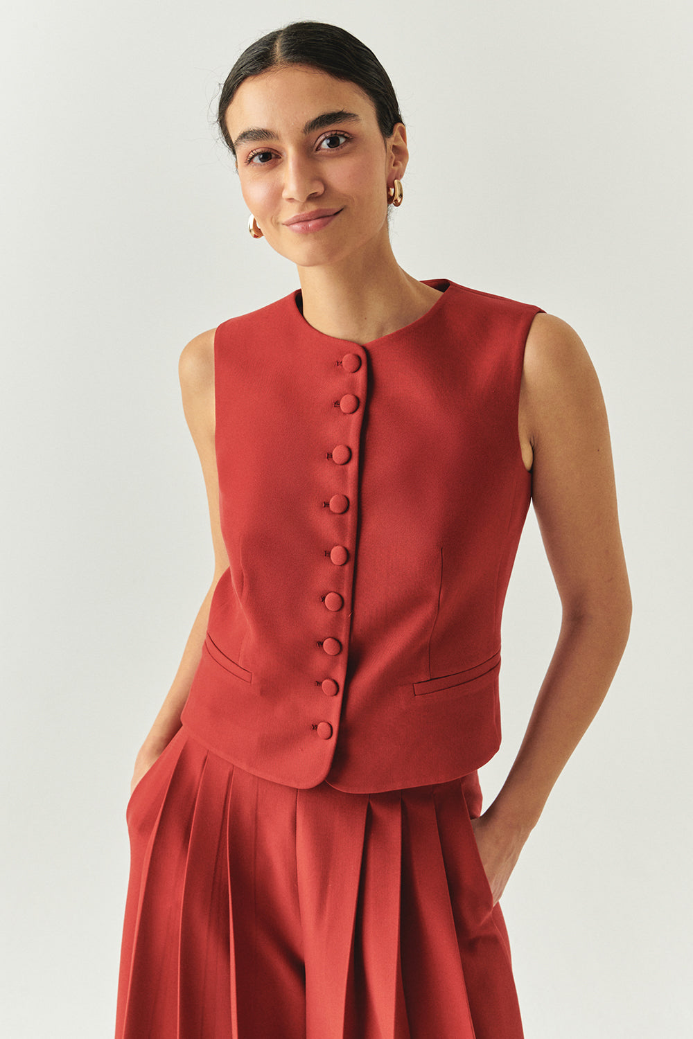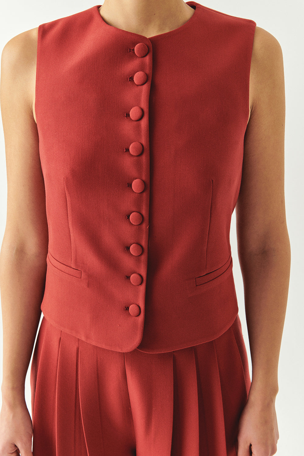 Sade bisiklet yaka formu ve kaplamalı düğmeleriyle zarif bir duruş sergileyen bu yelek, ince işçiliğe sahip fileto cepleri ve astarlı yapısıyla hem şıklığı hem rahatlığı bir arada sunar; beyaz bir gömlek ve topuklularla toplantıya, desenli bir bluz ve loafer’larla ise şehirde keyifli bir güne eşlik eder.