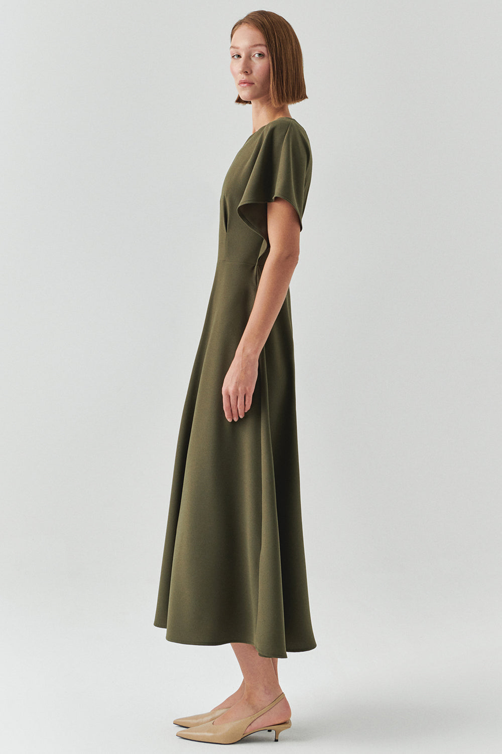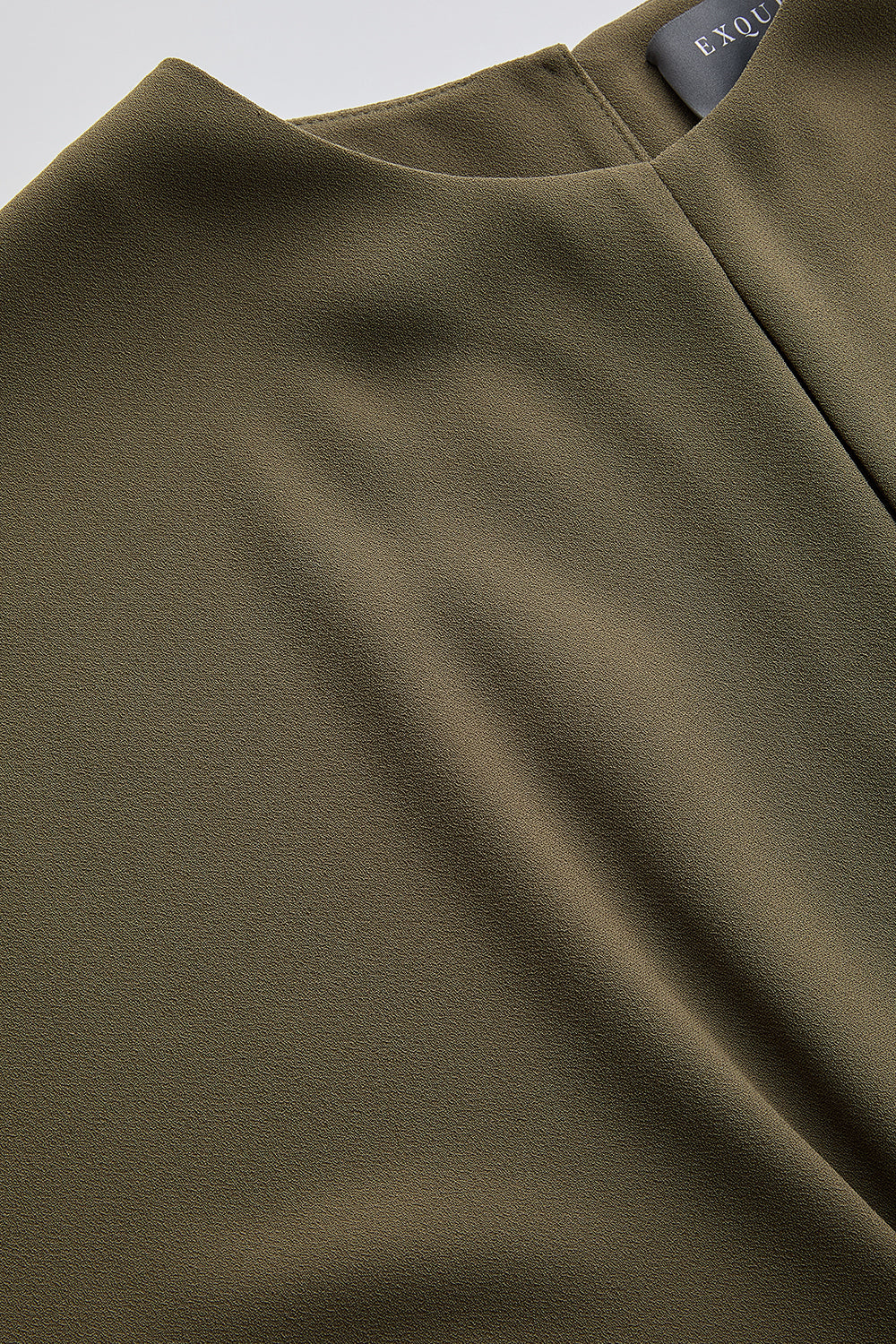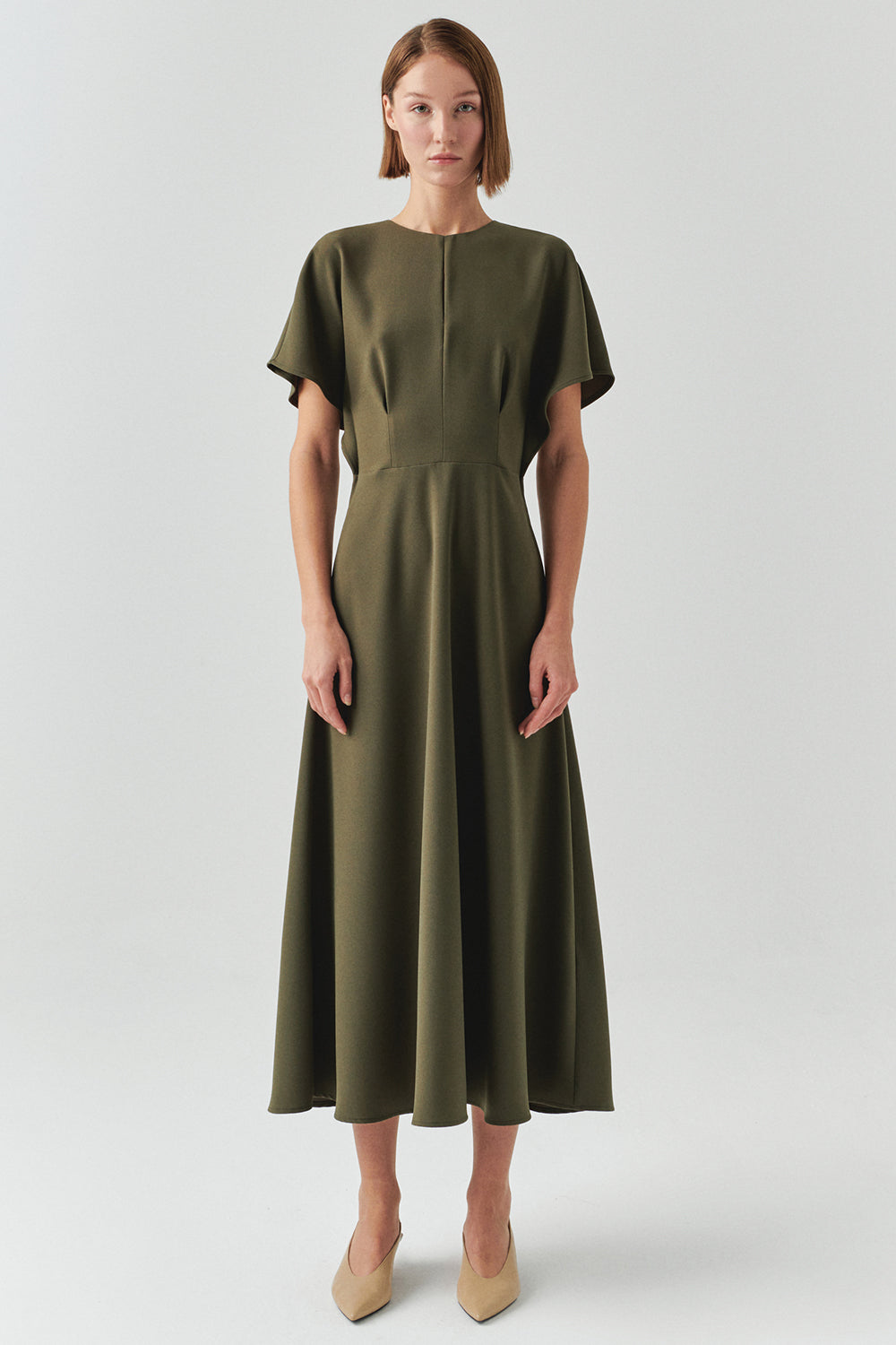Yumuşak dokulu kumaşıyla hareket özgürlüğü sunan bu haki elbise, bisiklet yaka ve kısa kol detayıyla sade ama etkili bir şıklık yaratır. Diz altına uzanan midi boyu, günlük kullanımda olduğu kadar davetlerde de zarif bir görünüm sağlar. Nude tonlarda topuklu ayakkabı ve minimal bir çantayla kombinleyerek modern bir stil oluşturabilirsiniz.