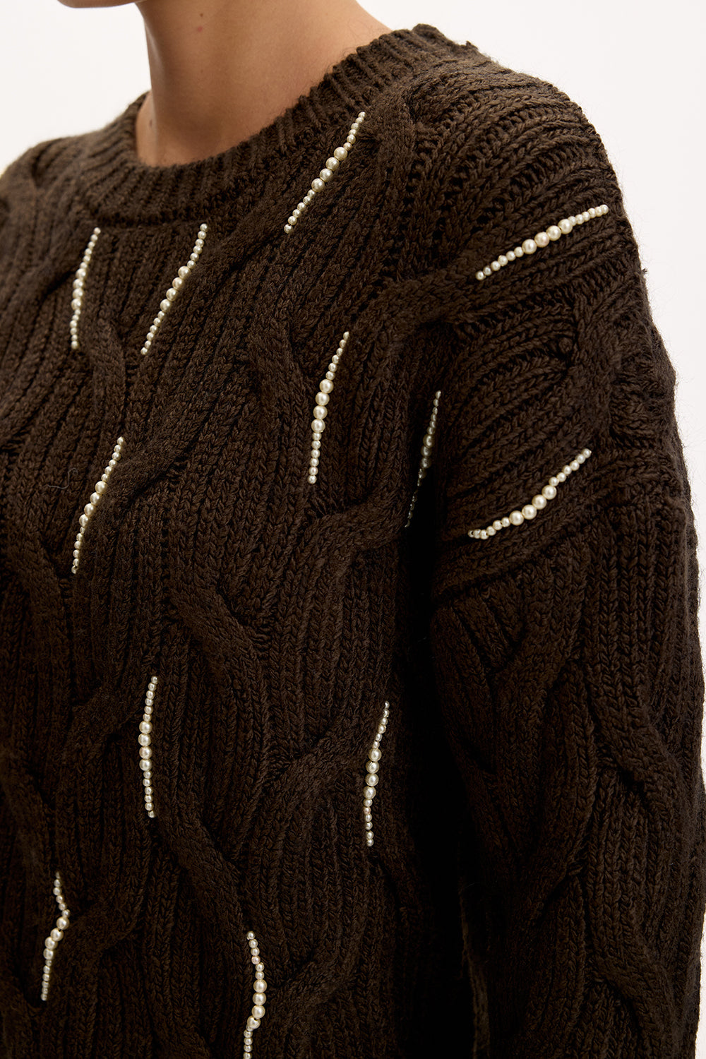 Boncuk İŞlemeli Bisiklet Yaka Regular Triko Kahve Bluz