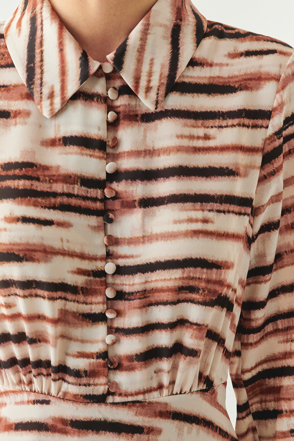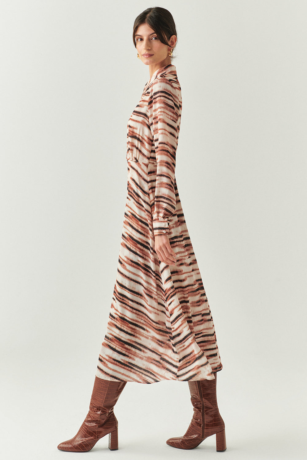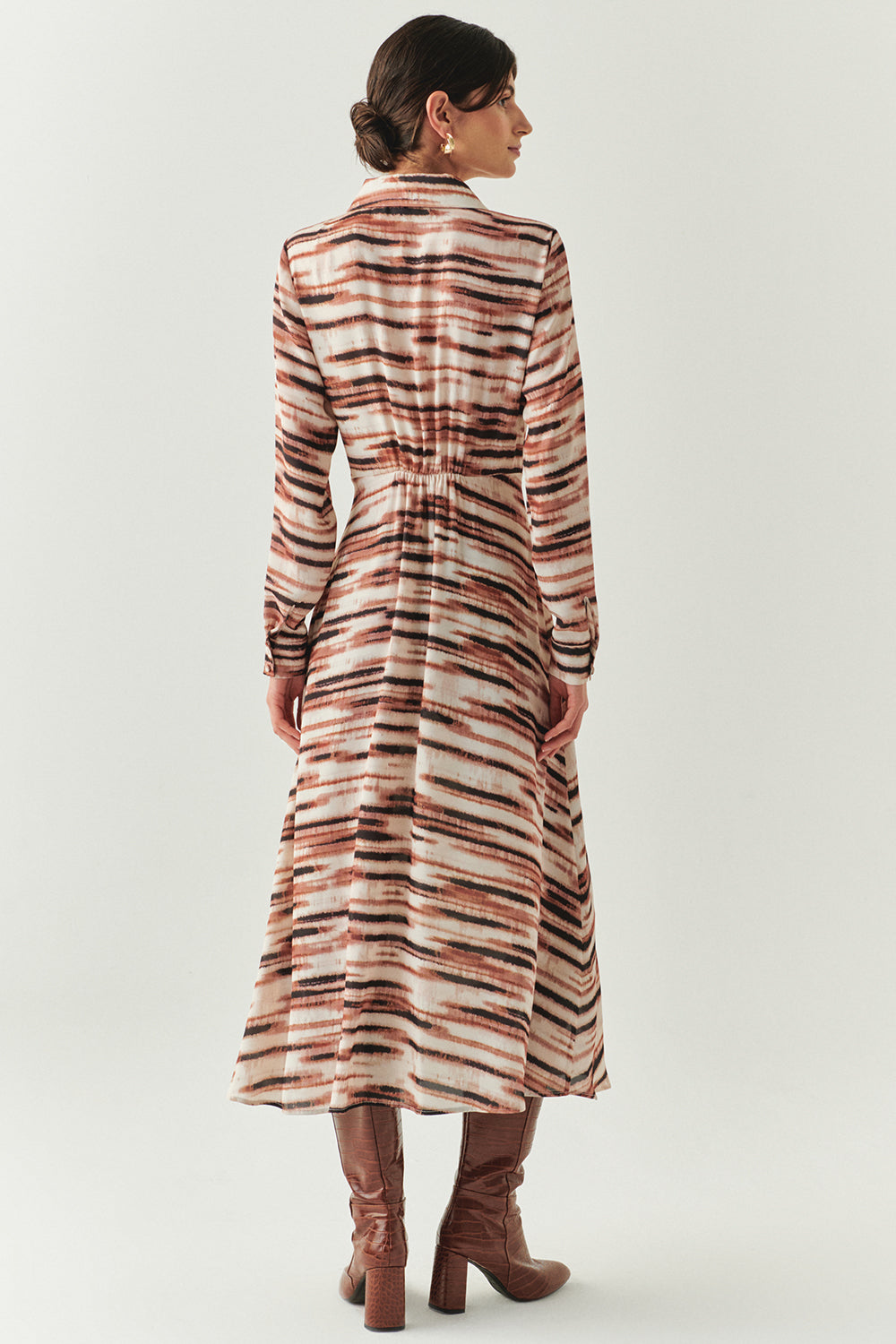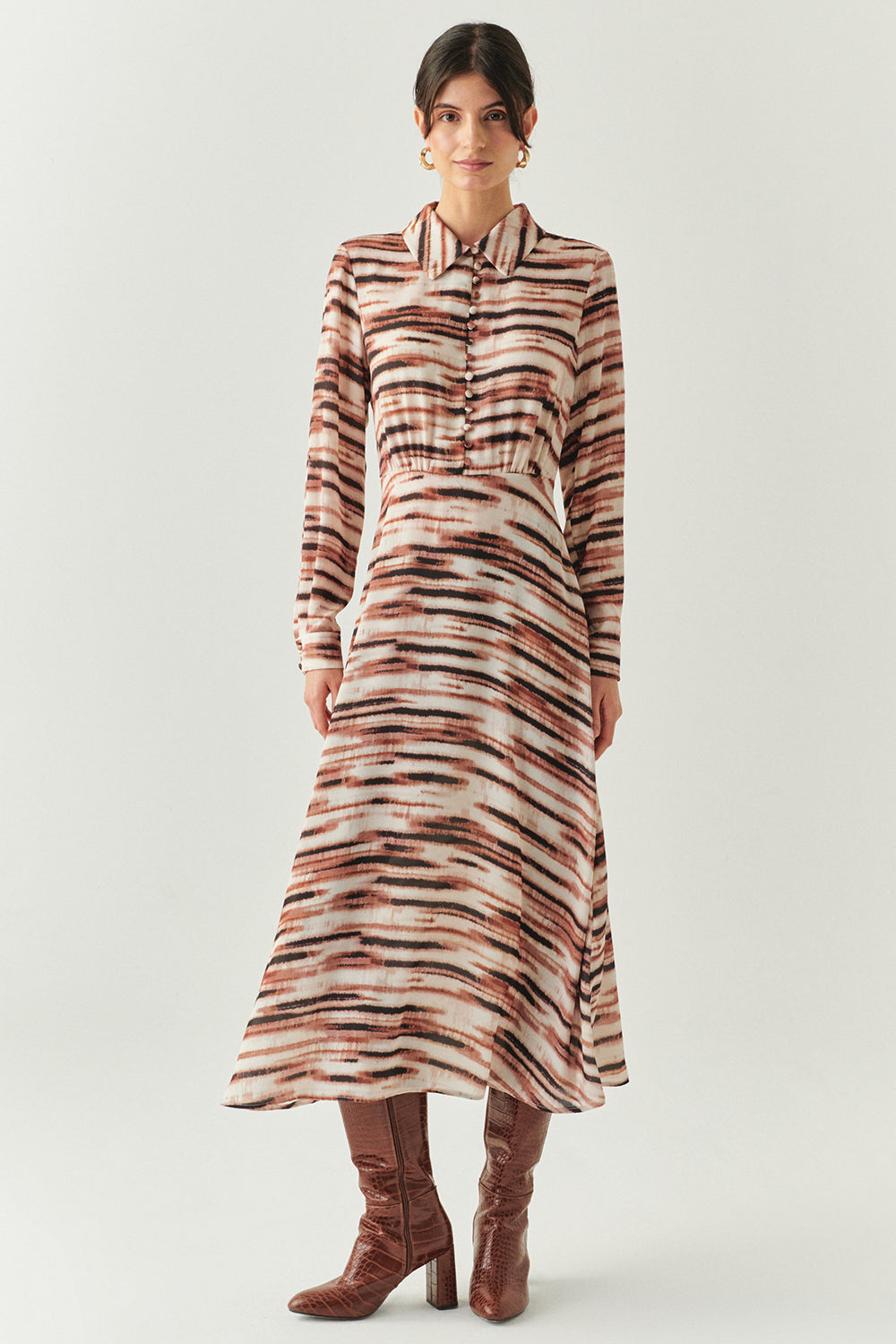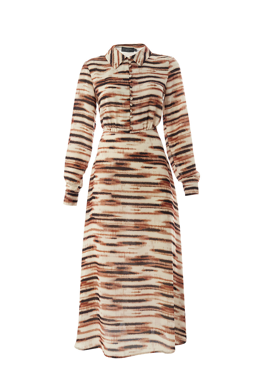 Desenli Gömlek Yaka Slim Fit Uzun Kollu Midi Elbise