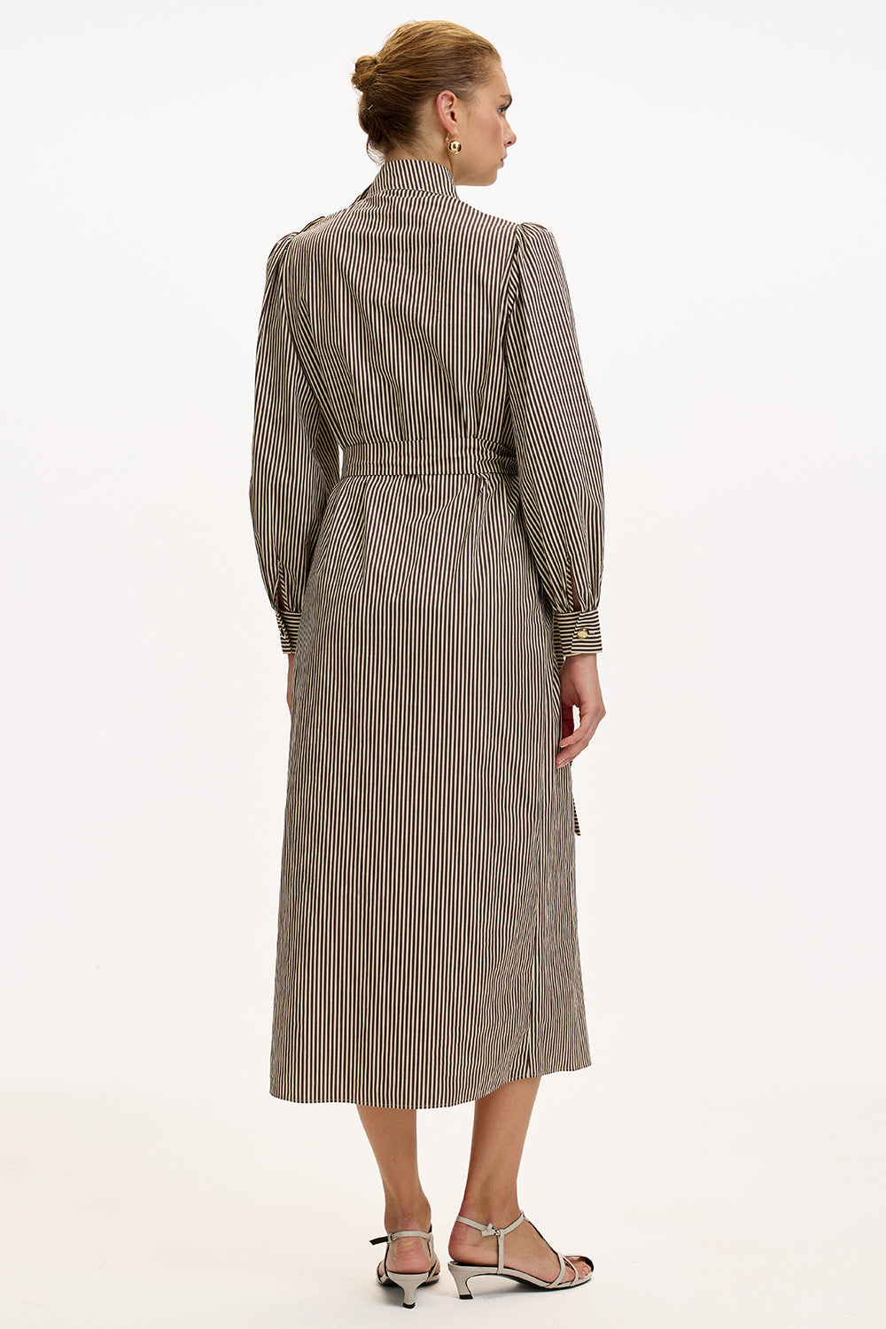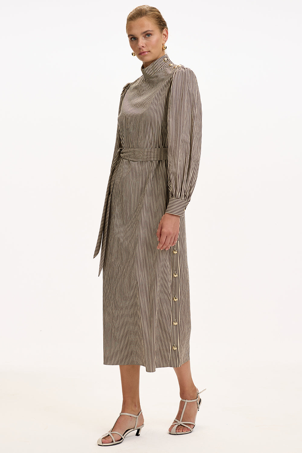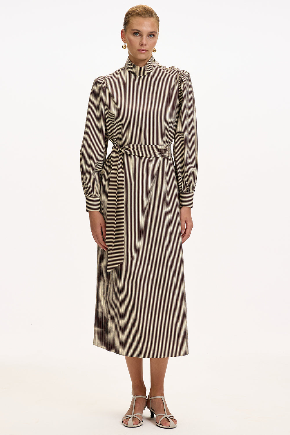 Dik Yaka Uzuz Kollu Çizgili Kuşaklı Regular Kahve Bej Midi Elbise