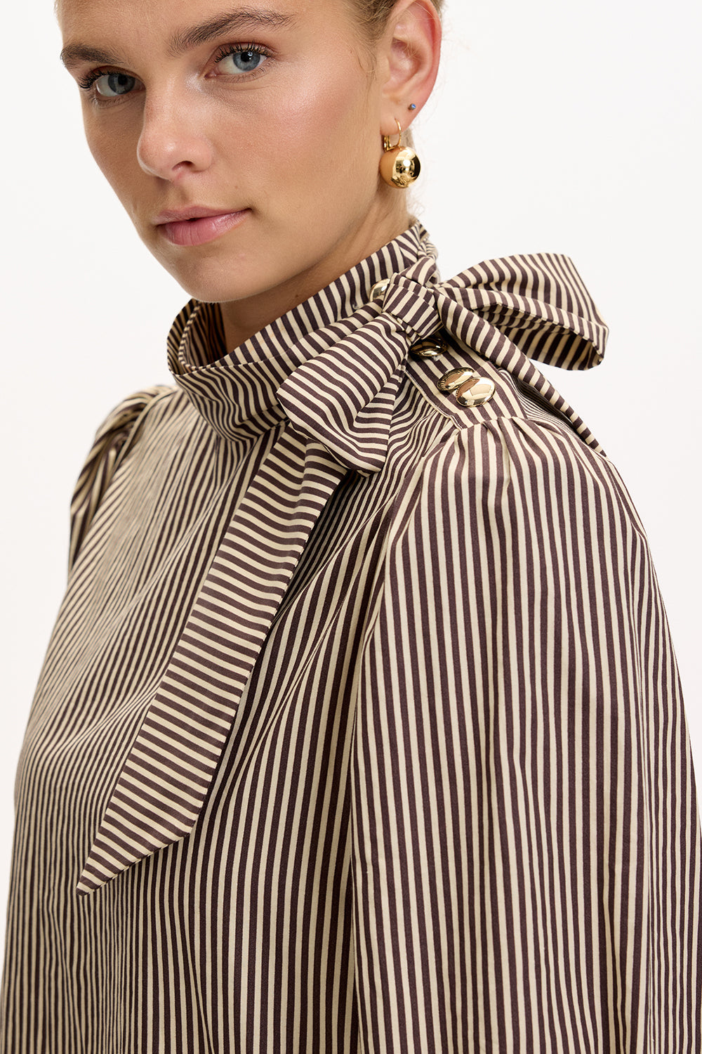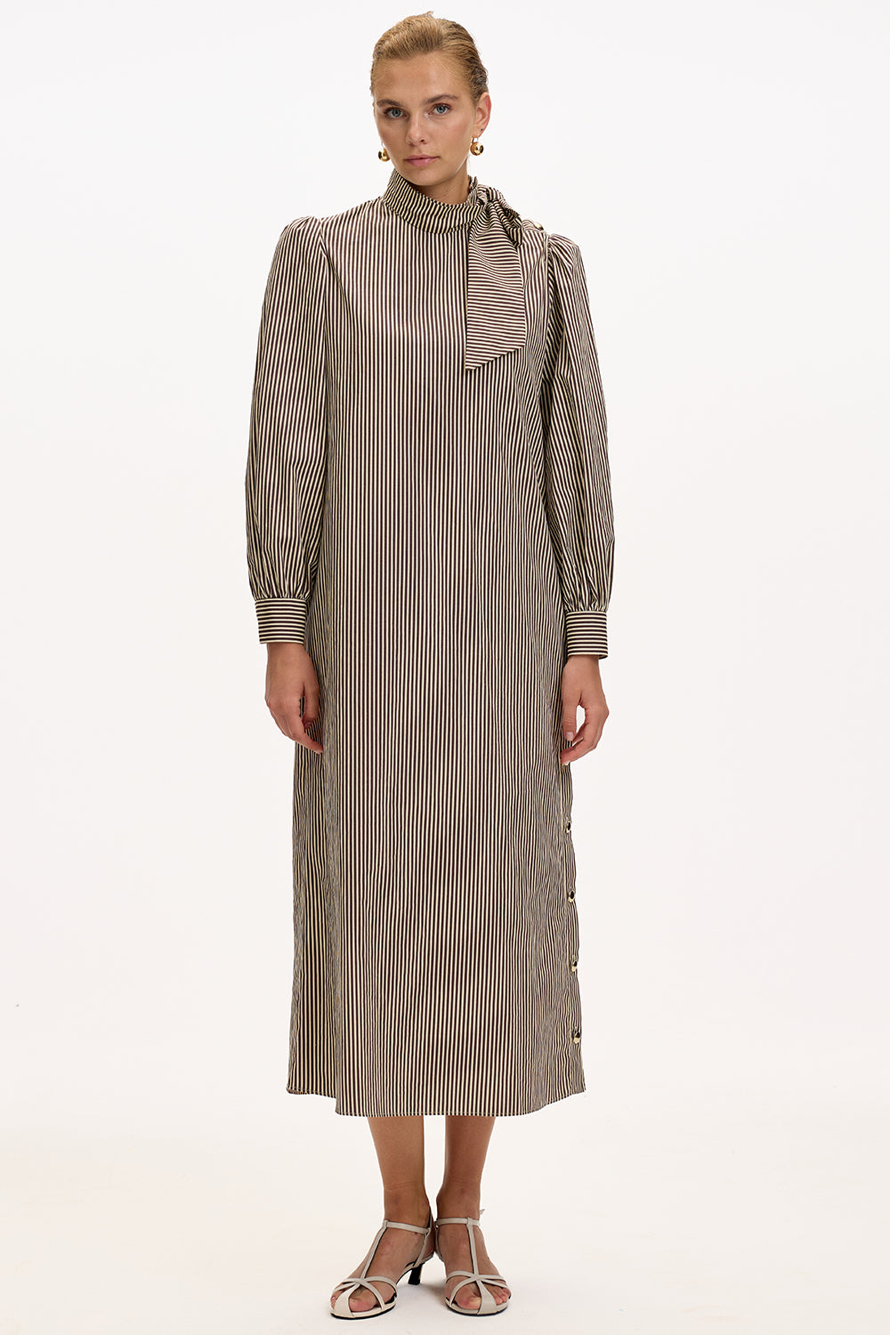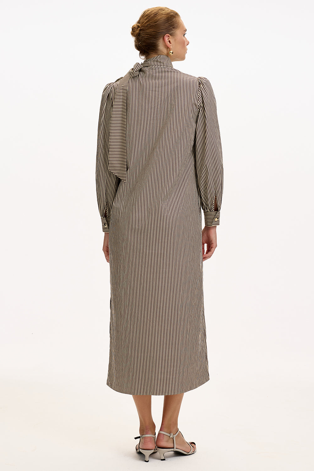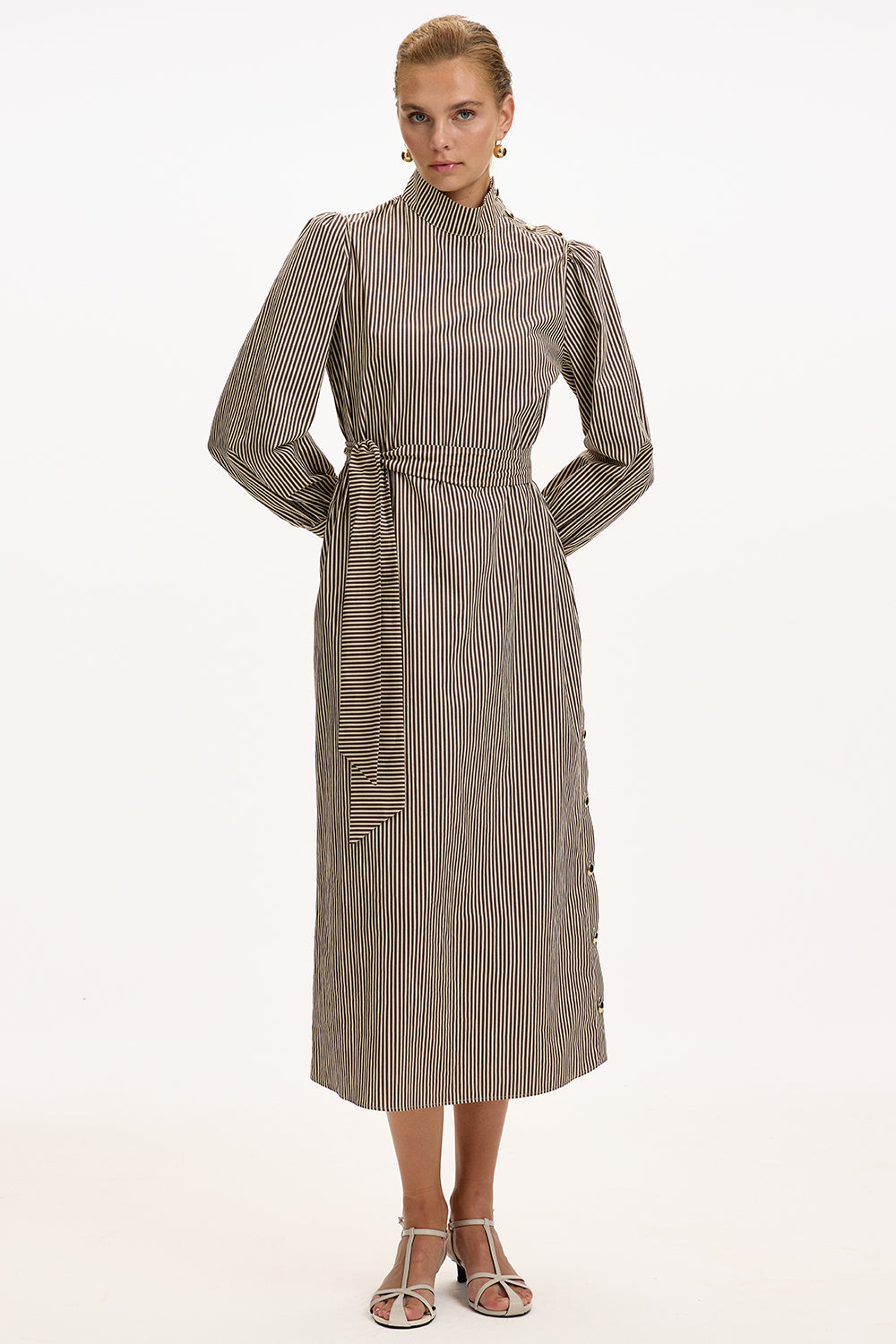 Dik Yaka Uzuz Kollu Çizgili Kuşaklı Regular Kahve Bej Midi Elbise