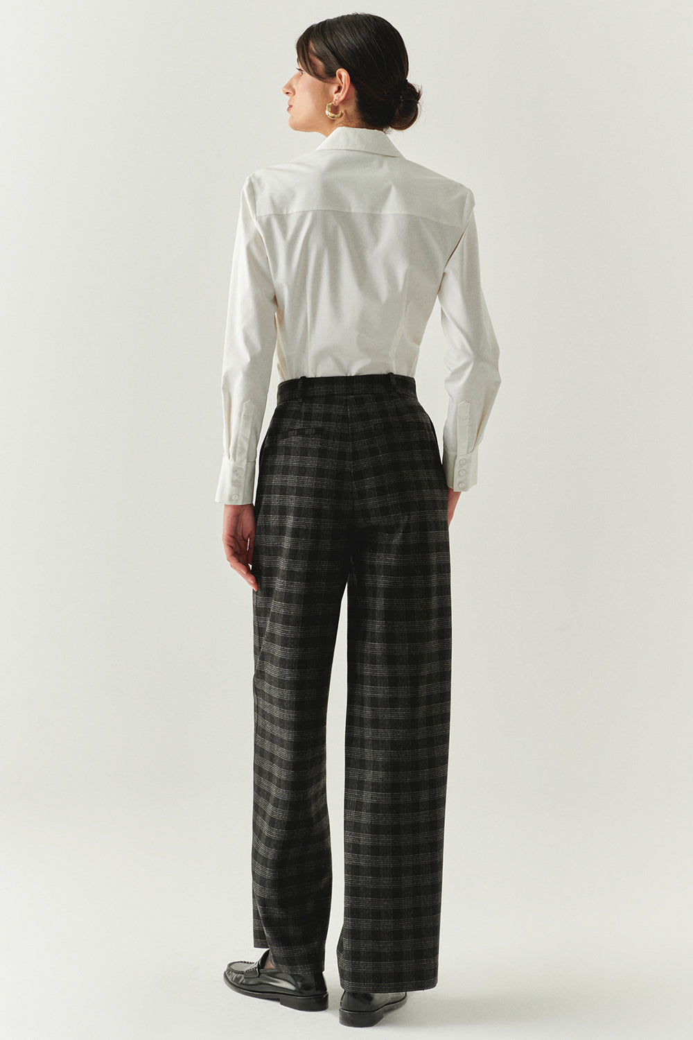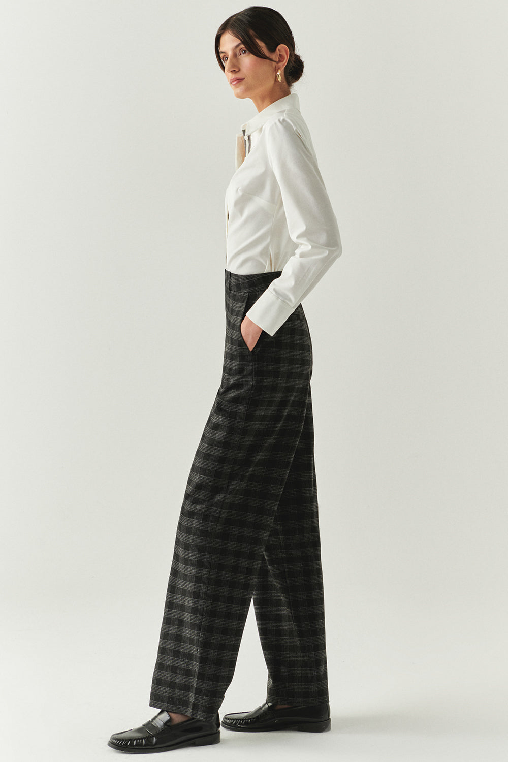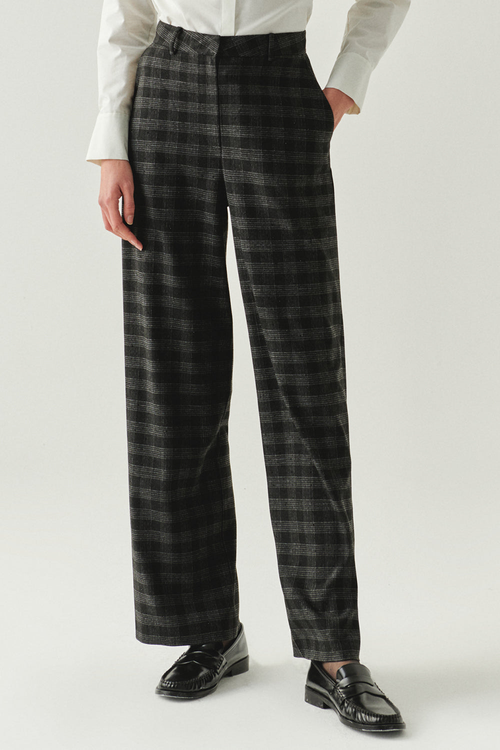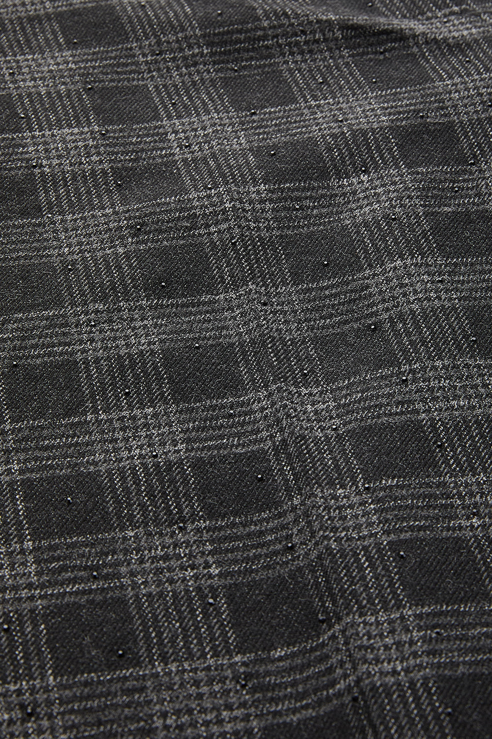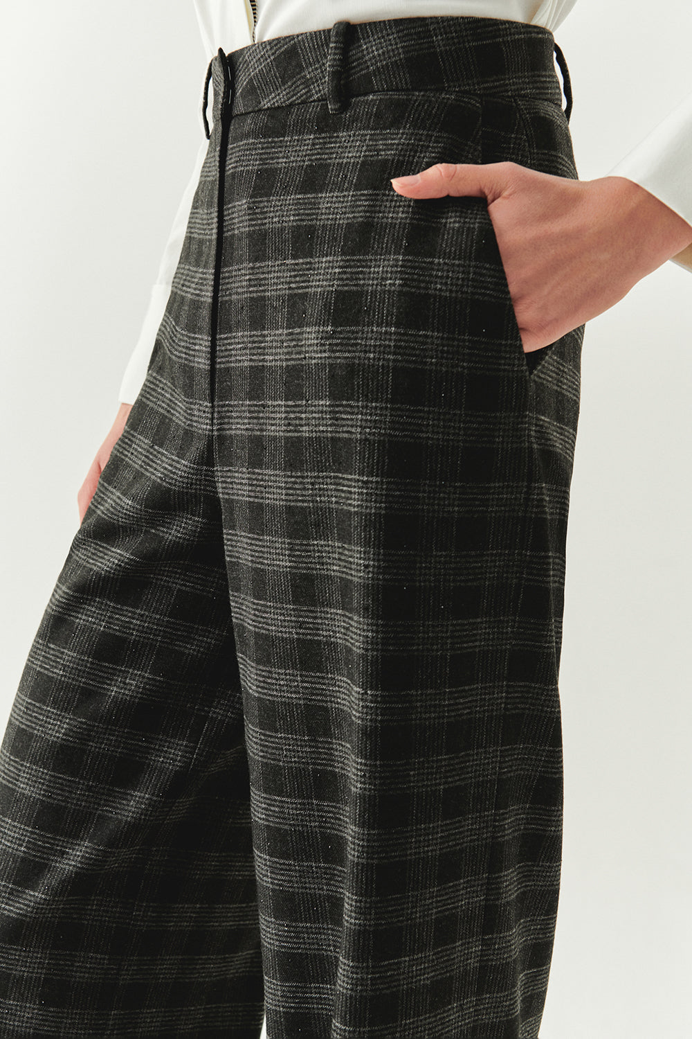 Koyu tonlardaki ekose deseniyle modern bir görünüm sunan bu antrasit pantolon, yan ceplerine eklenen taş detaylarıyla zarif bir ışıltı katar; regular kesimi ve boru paça formu sayesinde gömlek ve loafer’larla ofis şıklığına, triko kazak ve botlarla ise gündelik rahatlığa uyum sağlar.