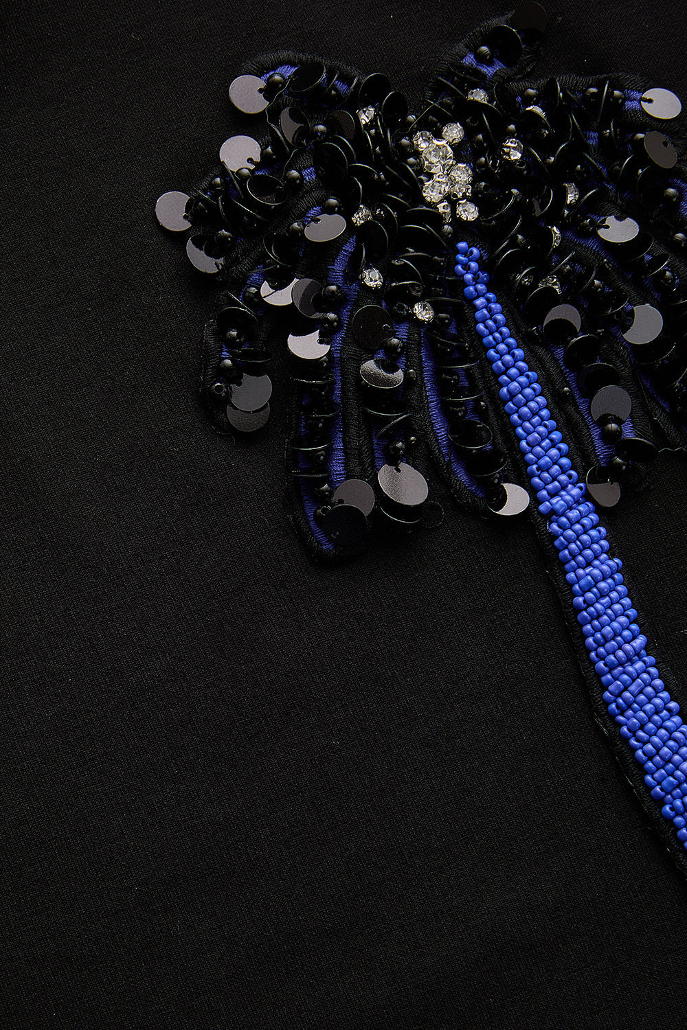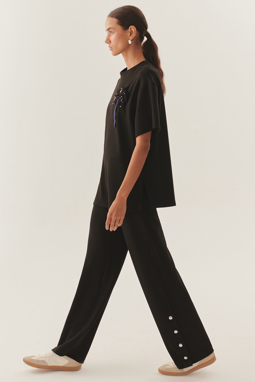 Zarif işleme detaylarıyla ön plana çıkan bu siyah bisiklet yaka t-shirt, rahat kesimi ve şık tasarımıyla günlük stilinize sofistike bir dokunuş katıyor. Göğüs kısmında yer alan parlak taş ve boncuk süslemeleri, t-shirte lüks bir hava kazandırırken, konforlu bir kullanım sunuyor. Hem gündelik hem de şık kombinlerde rahatlıkla kullanılabilir.