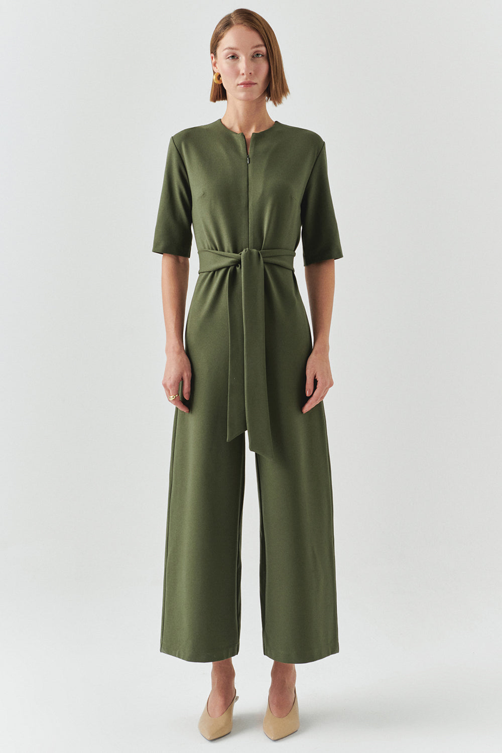Yumuşacık dokusu ve zamansız zeytin yeşili rengiyle bu tulum, günün her anında sana eşlik edecek bir parça. Belindeki kuşak, sana özel bir siluet yaratırken kısa kollar ve ferah kesimiyle rahatlığı asla ikinci plana atmıyor. İster bir kahve molasında, ister akşam yemeğinde… Biraz topuk ekle, özgüveninle birlikte ışığın da ortaya çıksın.